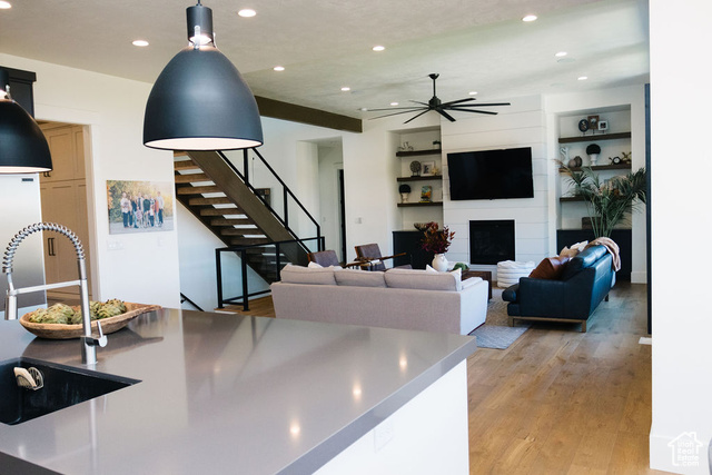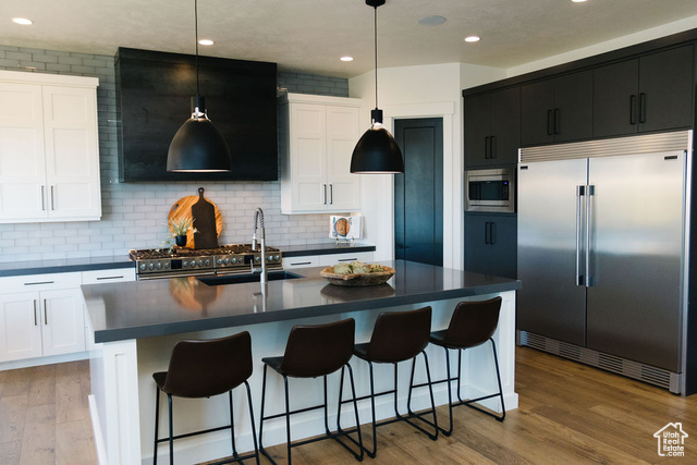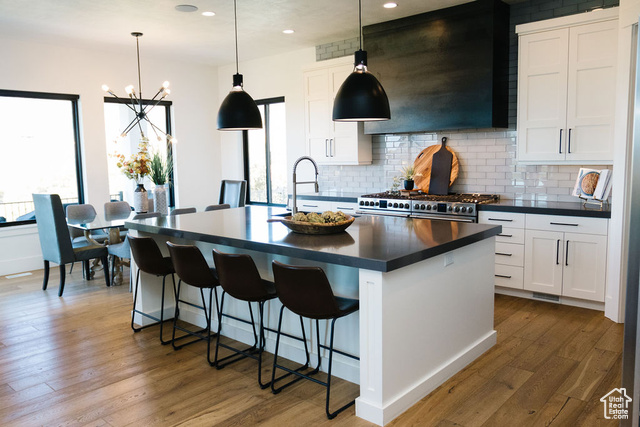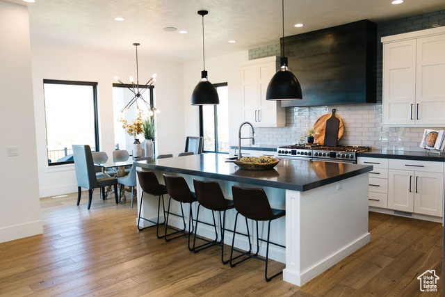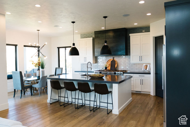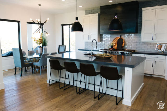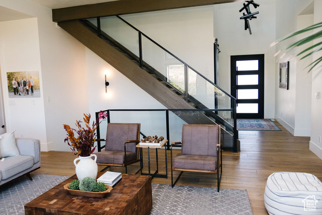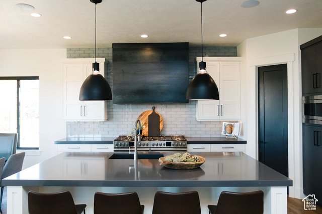 Beautiful modern home located in one of the most desirable neighborhoods in Utah. This spacious 7 bedroom 4 bath home boasts a bright and open floor plan that is an entertainer's dream. The main level features huge windows, hardwood floors, sound system throughout, gorgeous views, and a ton of natural light. The gourmet kitchen offers two 30 inch gas ranges, a side by side fridge and freezer, and an extra large walk in pantry. The luxurious primary bedroom is a haven with a large shower, soaker tub and double vanities. Upstairs has three large bedrooms, a spacious bath with double vanities, and a large loft with breathtaking views. Downstairs you will find more large windows with a ton of natural light, a great room with plenty of room to entertain, and a large wet bar that includes a built in ice maker and glass front beverage refrigerator. Children will be entertained for hours in the built in play area that includes bunks and a slide. Step outside to a gorgeous backyard that is surrounded by natural scrub oak, a built in gas fire pit, in ground trampoline and a hot tub. One of the highlights of this property is the huge, extra wide 6 car attached garage. Come and experience Highland living at its finest!