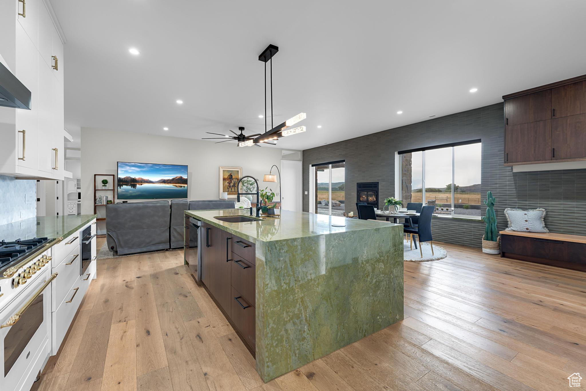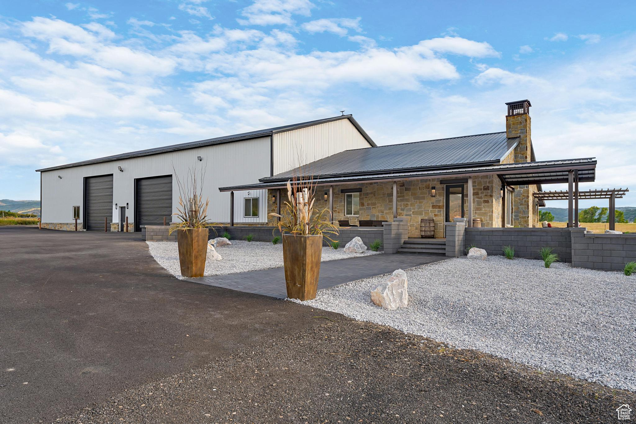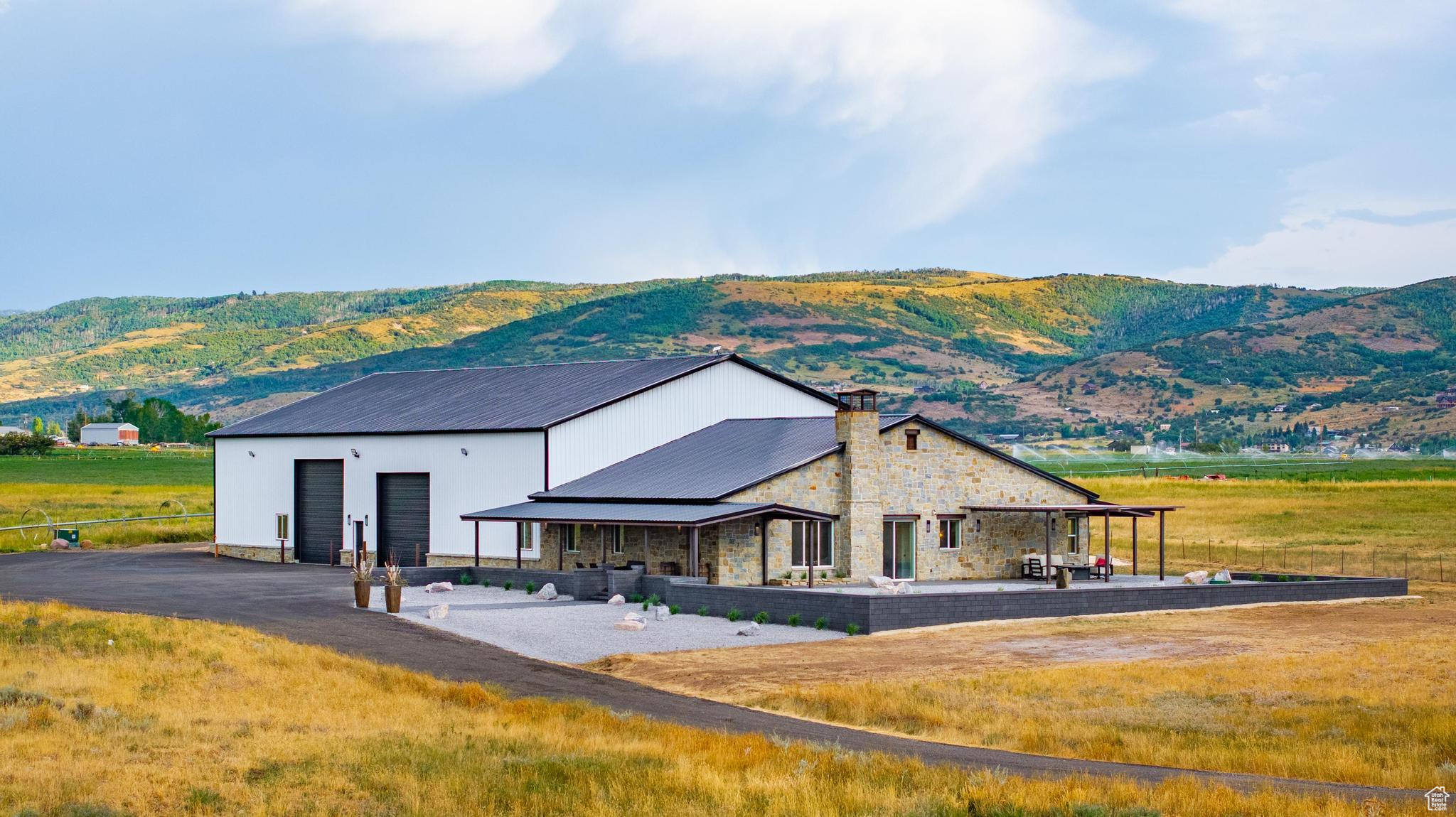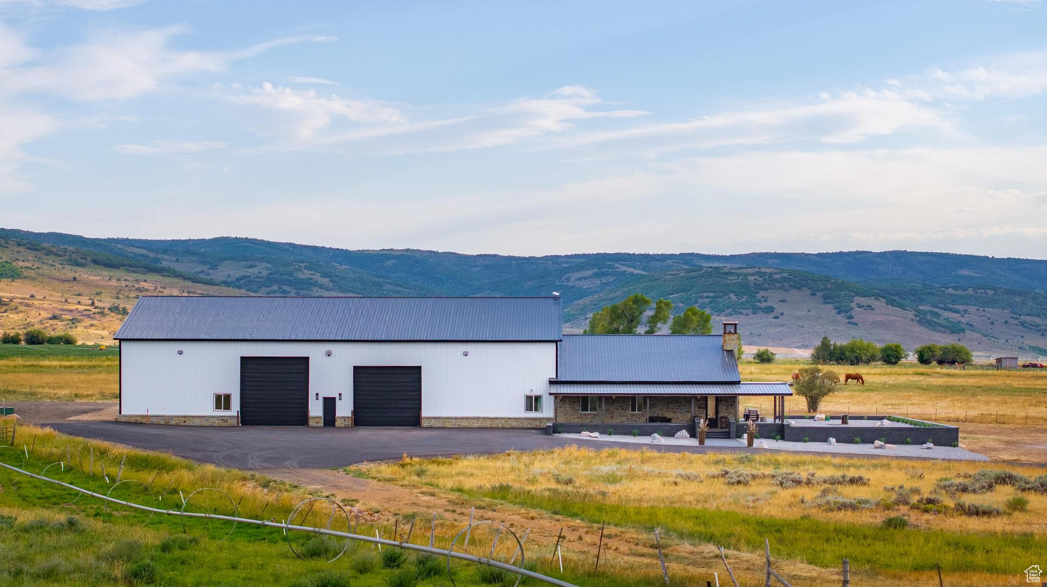 Experience refined country living on 5.86 acres of horse property, tucked away on a private lane in a mostly secluded area, complete with infrastructure for a future custom home for main residence. This custom estate boasts a show-stopping chef's kitchen with Wolf and ILVE appliances, a dramatic 10'x5' Brazilian Seafoam green waterfall island, Hammerton blown glass lighting, and sleek level 5 cabinetry with brass accents. The owner's suite is a serene sanctuary with mountain-view patio access, a spa-inspired bath with freestanding tub, Seafoam green granite shower, and custom closet with laundry hook-up. Covered patio is already plumbed for a Hot Tub outside the primary suite, Wide-plank hardwood floors, soaring 8' solid-core doors, remote control shades, and wrap-around patios with designer outdoor lighting elevate the home's modern elegance. A remarkably massive 6,000 sq ft garage/shop with commercial doors, private office, loft, spray-foam insulation, and full bath offers endless possibilities for outdoor recreationalists with plenty of snowmobiles, UTVs and toys, car collectors, hobbyists, or to operate your business right out of the garage. With dual meters, two transformers, well water, propane, and RV hookups, this property combines luxury, functionality, privacy, and the freedom to expand-an exceptional lifestyle opportunity.