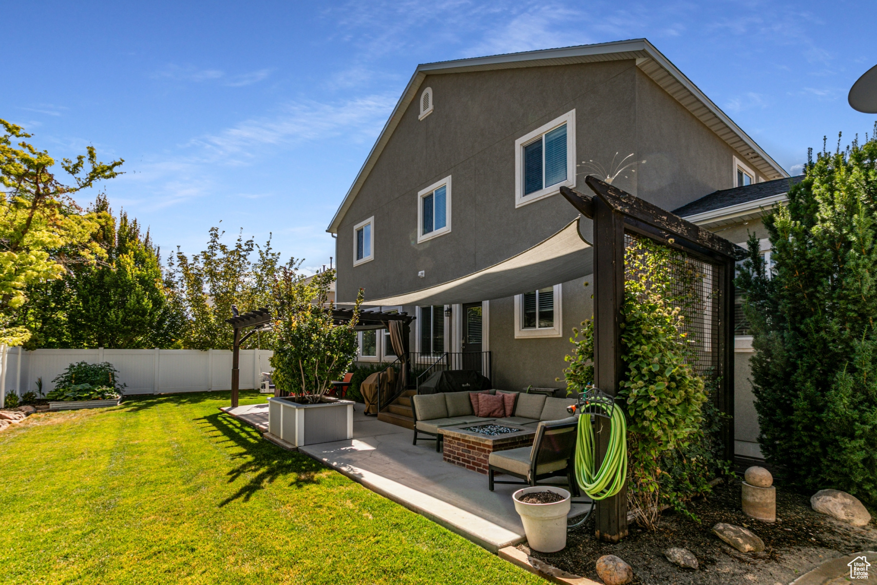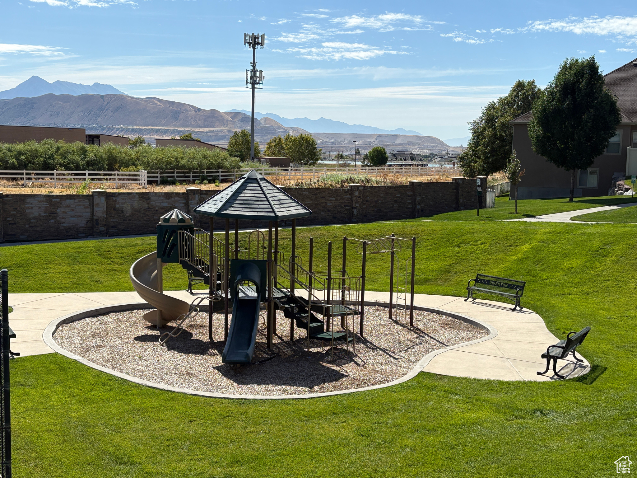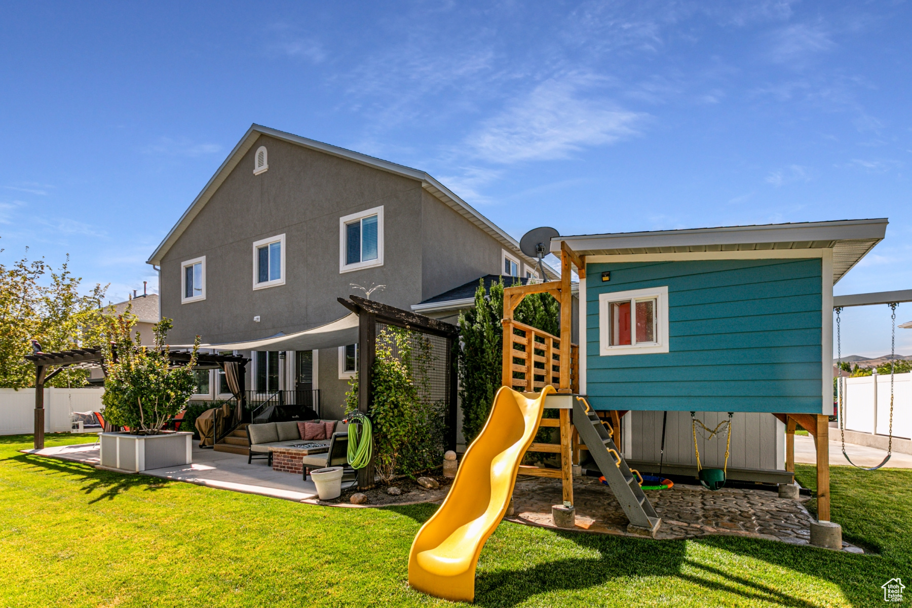 Immaculate 6-Bedroom Home with Dream Backyard and RV Parking in Riverton. Welcome to a meticulously maintained six-bedroom, four-bathroom home in a beautiful neighborhood where pride of ownership shows. This gorgeous home was built with 2x6 upgrade construction, blown-in insulation and boasts an energy efficient rating. A beautiful gas fireplace makes the primary living space cozy with the open kitchen/living room concept. You'll love how clean and perfectly maintained the home is. A wide staircase leads upstairs to four bedrooms and two bathrooms and a giant laundry room complete with a 6-basket laundry table. You've got to see it. Large closets, full bathrooms, wide hallways, a soaker tub in the master bath and utility room with an extra fridge gives this home all the wonderful extras. The basement can be used as a mother-in-law apartment with a mini kitchen and an extra room that does not have a closet. Furnace is new as of 11/24, is 97% efficient with 90000 BTU. This entertaining paradise includes plenty of parking, including large RV parking for toys and trailers, and a 30 amp RV power source on the side of the home. A shed with electricity, land a charming playhouse with swings are well situated on the property. The built-in has fireplace on the patio creates a cozy outdoor gather place and the patio is covered with pergolas, built-in lighting, and protective shade cells. Garden boxes and full landscaping create an outdoor paradise that is easy to maintain. Additional features include the 3-gar garage with dedicated woodshop space and lots of built in storage and shelves, as well as a sink. A community pool and clubhouse are available as well. A system of 8 cameras gives full view of the yard, porch and doors and is included iwth the property, as is the permanent holiday lighting. All appliances are included. Wide staircases and hallways give the home an extravagant feel. You've got to see it.