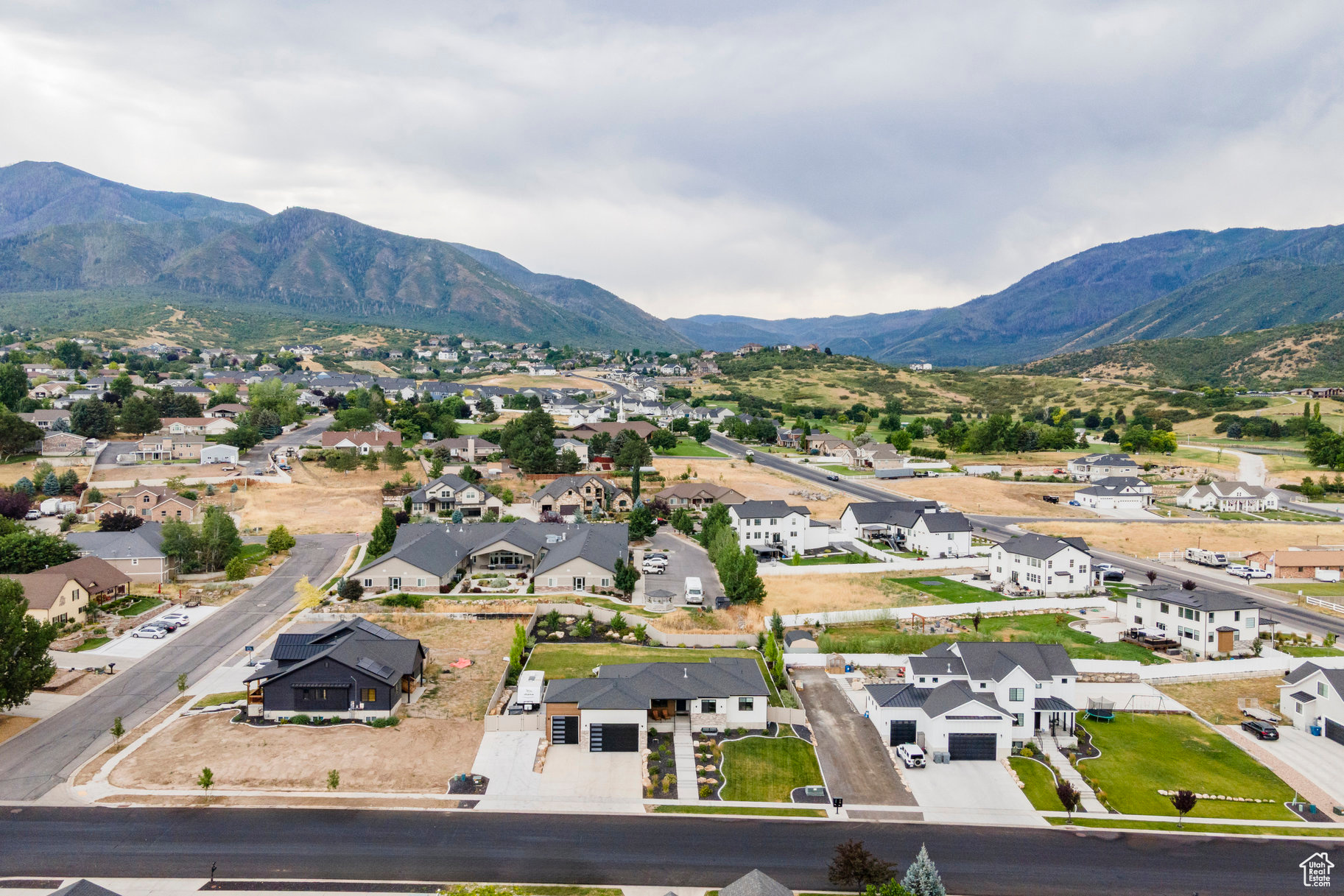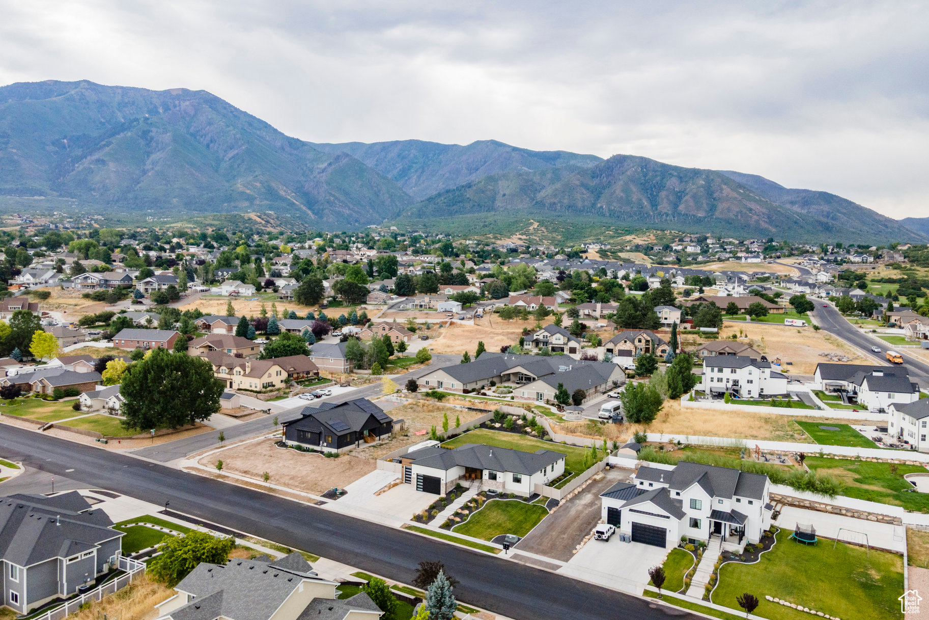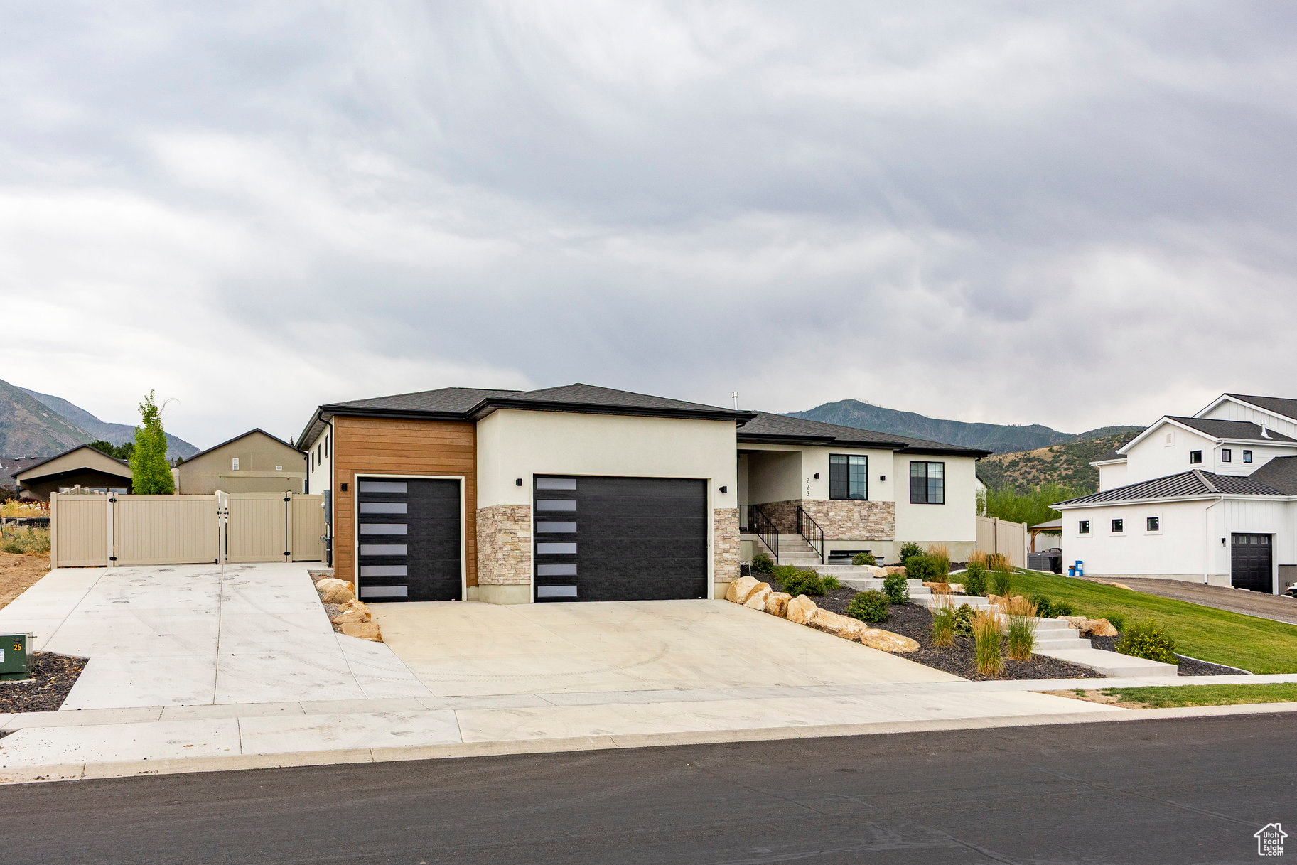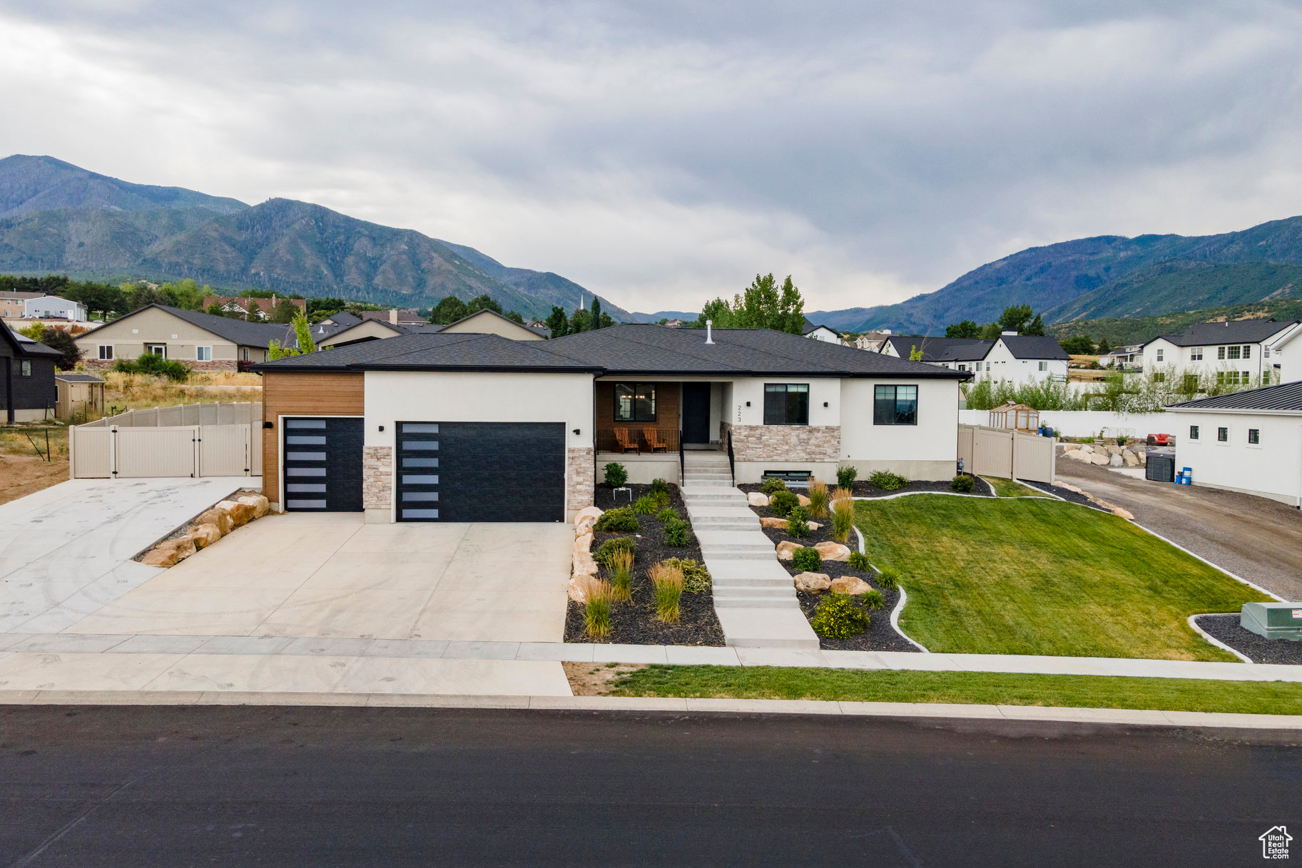 Absolutely striking 2022 custom-designed home in the serene community of Elk Ridge! This fully finished, 7-bedroom, 4-bath home offers custom finishes throughout with an ideal open floor plan designed for comfort and entertaining. You'll love the gourmet kitchen featuring quartz countertops, modern cabinetry, double ovens and a large custom island plus a deluxe walk-in pantry. The primary suite includes an oversized walk-in closet and a spa-inspired bathroom featuring a double vanity, glass encased tiled shower and separate soaking tub. And to provide additional comfort and organization, one of the bedrooms has been transformed to a functional and stunning walk-in closet with custom built-ins. Step outside to the fully landscaped, fenced yard and expansive hand-laid paver patio with gas fire pit, which showcases Dixon Peak. The massive 3-car garage is fully finished with extra tall doors, epoxy flooring and a 220-volt outlet for your EV. The side drive is perfect for storing all of your recreational toys. Additional features include extra tall ceilings (9'), two fireplaces, a sleek downstairs dry bar, in-floor HVAC ducting in the basement that allows for maximum ceiling height, customized bedroom closets and built-in cabinets and open shelving in both family rooms.