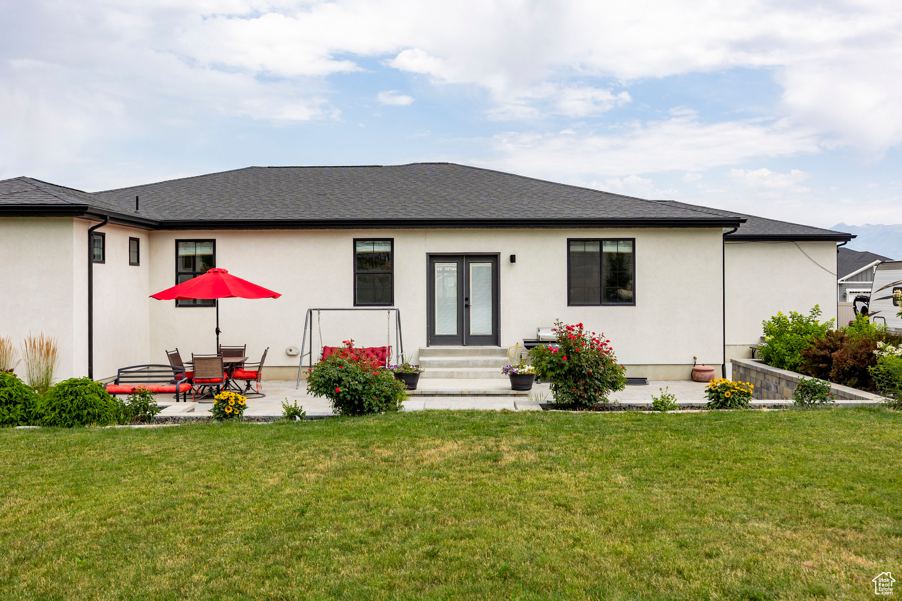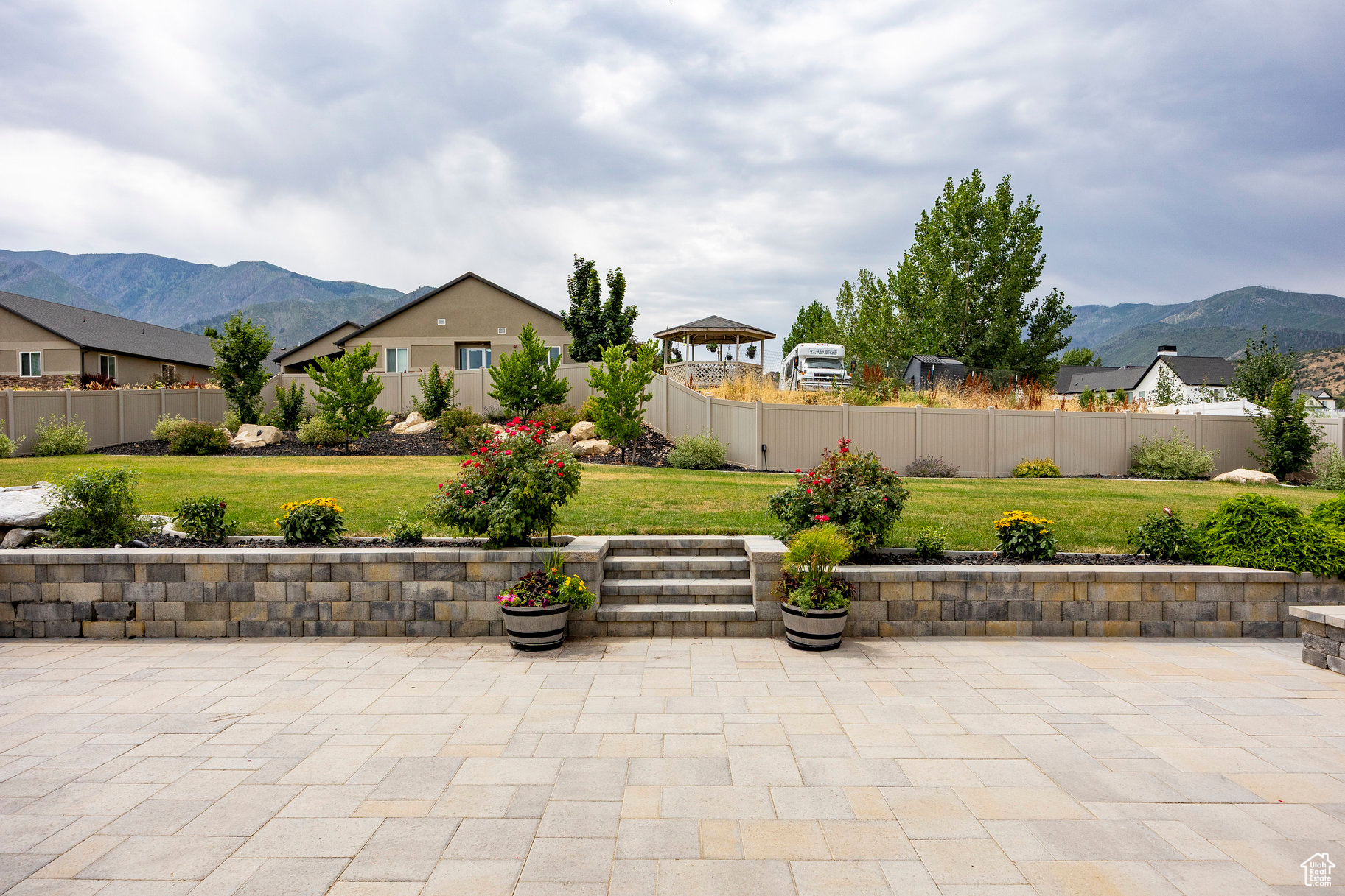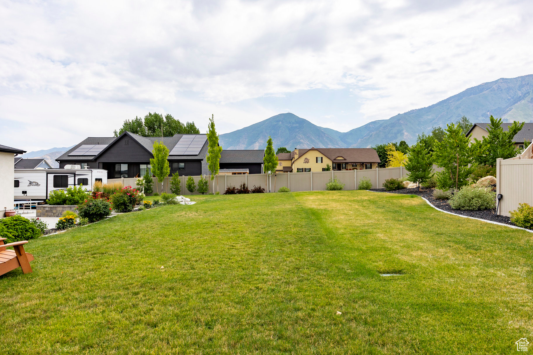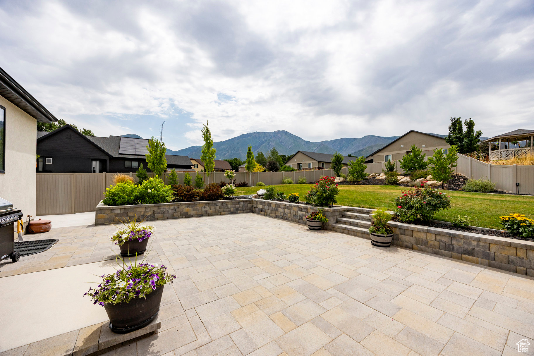 Absolutely striking 2022 custom-designed home in the serene community of Elk Ridge! This fully finished, 7-bedroom, 4-bath home offers custom finishes throughout with an ideal open floor plan designed for comfort and entertaining. You'll love the gourmet kitchen featuring quartz countertops, modern cabinetry, double ovens and a large custom island plus a deluxe walk-in pantry. The primary suite includes an oversized walk-in closet and a spa-inspired bathroom featuring a double vanity, glass encased tiled shower and separate soaking tub. And to provide additional comfort and organization, one of the bedrooms has been transformed to a functional and stunning walk-in closet with custom built-ins. Step outside to the fully landscaped, fenced yard and expansive hand-laid paver patio with gas fire pit, which showcases Dixon Peak. The massive 3-car garage is fully finished with extra tall doors, epoxy flooring and a 220-volt outlet for your EV. The side drive is perfect for storing all of your recreational toys. Additional features include extra tall ceilings (9'), two fireplaces, a sleek downstairs dry bar, in-floor HVAC ducting in the basement that allows for maximum ceiling height, customized bedroom closets and built-in cabinets and open shelving in both family rooms.