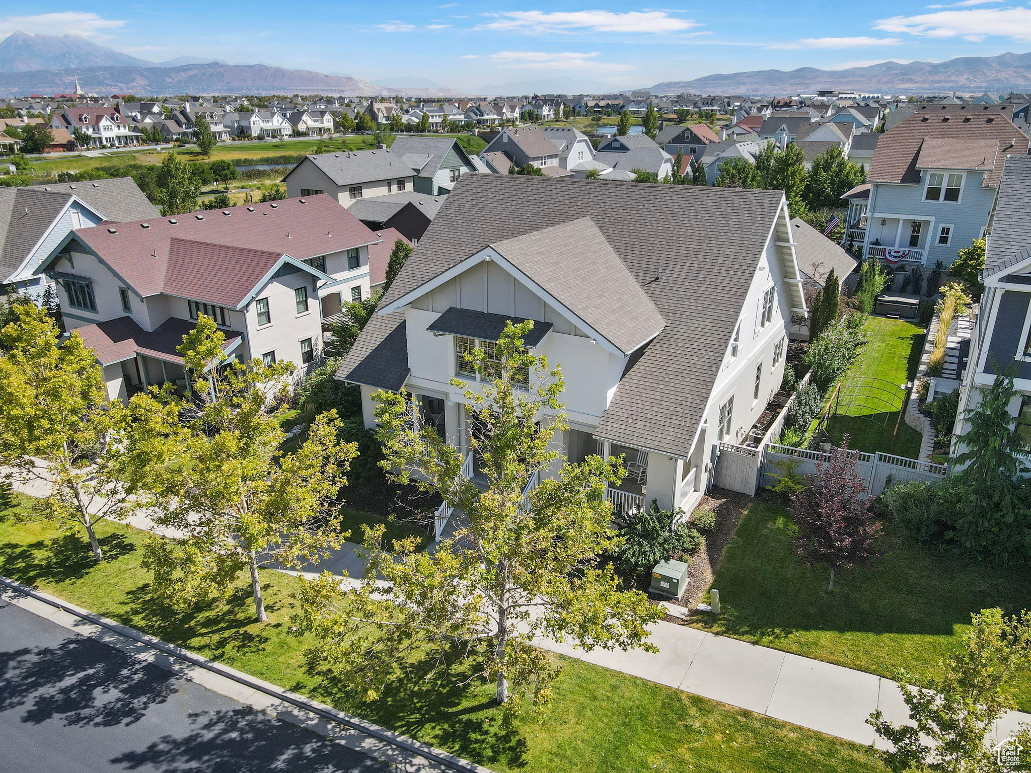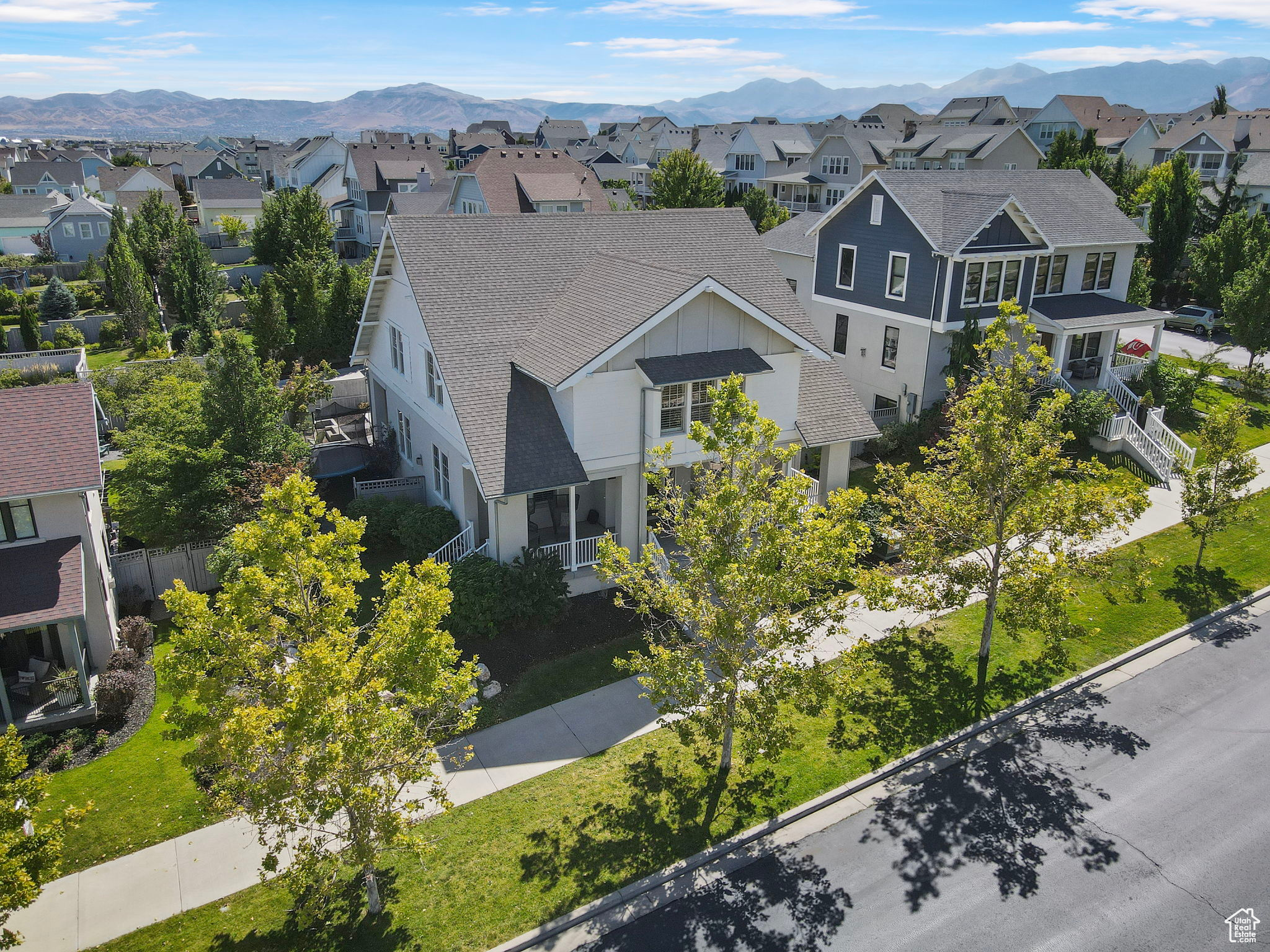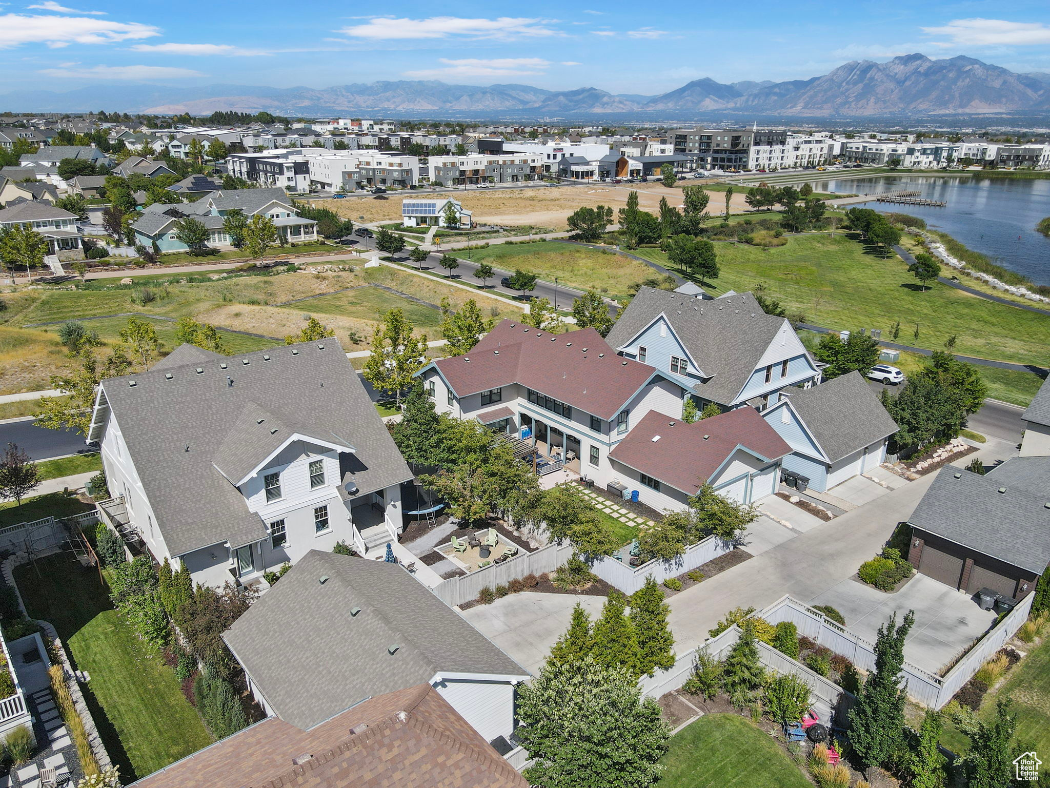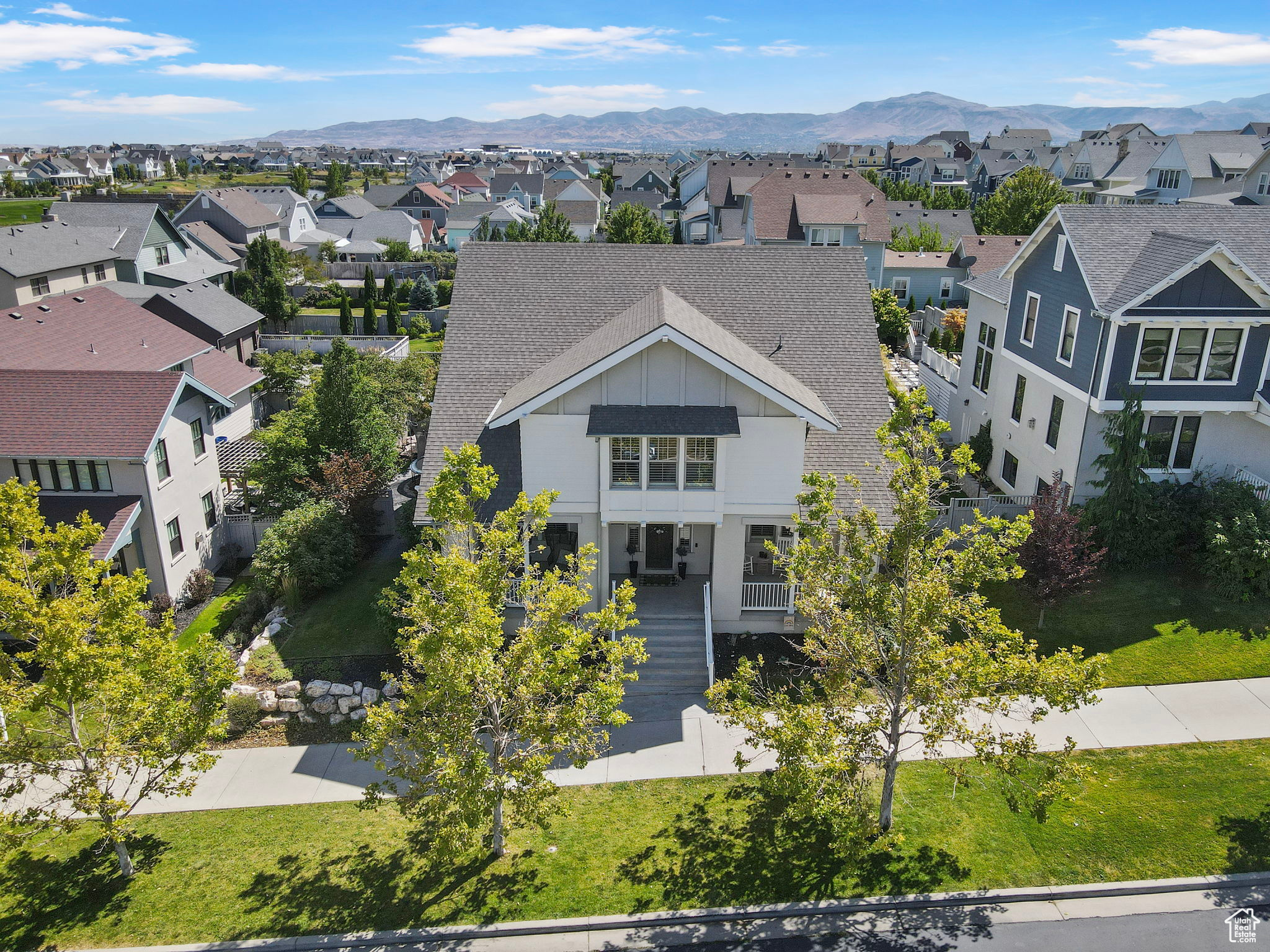 Amid the beautiful homes springing up in Daybreak, this one truly stands out. With its modern craftsman design, this home exudes elegance, blending timeless style with just the right amount of standout features. A spacious front porch, complete with ceiling fans, included porch swing, and inviting sitting areas, makes it the perfect spot to unwind and watch the neighborhood come to life or enjoy views of the mountain and Oquirrh Lake just down the street. Inside, a formal foyer opens to the dining and living areas, creating a sense of flow and space. The centerpiece of the living room is a stunning marble fireplace with lit shelving, adding both warmth and sophistication. Large windows throughout the home let in an abundance of natural light, highlighting the upgraded lighting, plantation shutters, and rich hardwood floors that tie everything together. The kitchen is a true showstopper, featuring sleek white shaker cabinets with glass front upper boxes, beautiful granite countertops, and a large island with ample seating. With top-of-the-line Caf smart appliances and glass pendant lighting, it's a space built for both functionality and style. Vaulted 18-foot ceilings open up to the loft, creating an airy, open feel. Spacious walk-in closets complete the bedrooms, and the primary suite is a private oasis with luxurious finishes. Both the main floor and upper floor feature dedicated laundry rooms, each with included washers and dryers-no more hauling laundry up and down. Recently replaced carpet and a new stair runner add to the home's fresh appeal. Downstairs, the fully custom finished basement is a highlight. From the executive-style home office, complete with alder cabinetry, wainscoting, wet bar, microwave, and mini-fridge, to the granite fireplace and hickory wood floors, no detail was overlooked. It's a space that must be seen to be fully appreciated. The wet bar adds even more convenience for hosting guests. Outside, the backyard is a true retreat, featuring a spacious entertainment area with a fire pit sitting area and even an included trampoline-perfect for fun and gatherings. The oversized garage has been thoughtfully finished with mud and paint, offering extra height, included storage, and added length for your convenience. The home also includes a fully fenced yard, a three-car detached garage, and an extra-long driveway. Across the street, enjoy a park with a walking path that leads to Oquirrh Lake, as well as nearby amenities like a playground, pool, and playing field. This home offers an exceptional blend of style, function, and comfort both inside and out. Square footage figures are provided as a courtesy estimate only and were obtained from County Records. Buyer is advised to obtain an independent measurement.