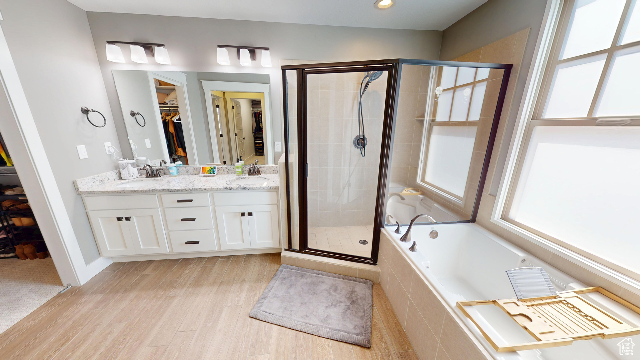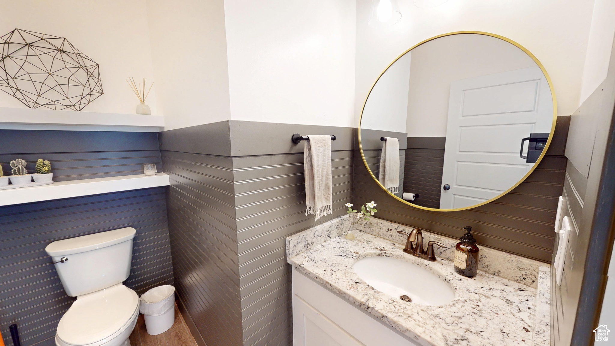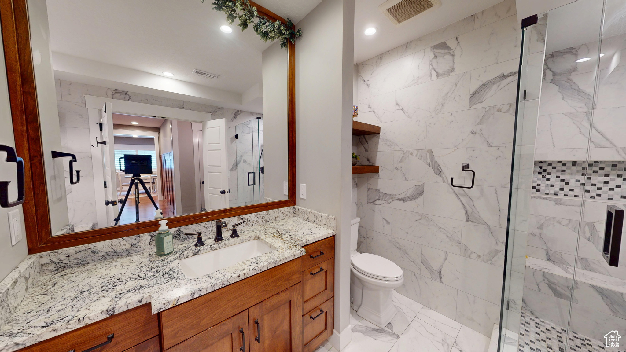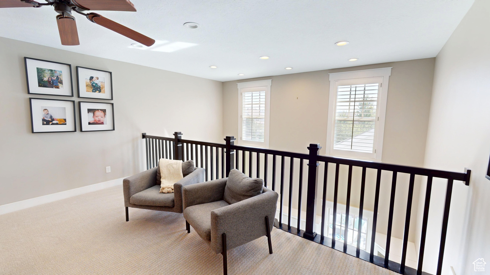 Amid the beautiful homes springing up in Daybreak, this one truly stands out. With its modern craftsman design, this home exudes elegance, blending timeless style with just the right amount of standout features. A spacious front porch, complete with ceiling fans, included porch swing, and inviting sitting areas, makes it the perfect spot to unwind and watch the neighborhood come to life or enjoy views of the mountain and Oquirrh Lake just down the street. Inside, a formal foyer opens to the dining and living areas, creating a sense of flow and space. The centerpiece of the living room is a stunning marble fireplace with lit shelving, adding both warmth and sophistication. Large windows throughout the home let in an abundance of natural light, highlighting the upgraded lighting, plantation shutters, and rich hardwood floors that tie everything together. The kitchen is a true showstopper, featuring sleek white shaker cabinets with glass front upper boxes, beautiful granite countertops, and a large island with ample seating. With top-of-the-line Caf smart appliances and glass pendant lighting, it's a space built for both functionality and style. Vaulted 18-foot ceilings open up to the loft, creating an airy, open feel. Spacious walk-in closets complete the bedrooms, and the primary suite is a private oasis with luxurious finishes. Both the main floor and upper floor feature dedicated laundry rooms, each with included washers and dryers-no more hauling laundry up and down. Recently replaced carpet and a new stair runner add to the home's fresh appeal. Downstairs, the fully custom finished basement is a highlight. From the executive-style home office, complete with alder cabinetry, wainscoting, wet bar, microwave, and mini-fridge, to the granite fireplace and hickory wood floors, no detail was overlooked. It's a space that must be seen to be fully appreciated. The wet bar adds even more convenience for hosting guests. Outside, the backyard is a true retreat, featuring a spacious entertainment area with a fire pit sitting area and even an included trampoline-perfect for fun and gatherings. The oversized garage has been thoughtfully finished with mud and paint, offering extra height, included storage, and added length for your convenience. The home also includes a fully fenced yard, a three-car detached garage, and an extra-long driveway. Across the street, enjoy a park with a walking path that leads to Oquirrh Lake, as well as nearby amenities like a playground, pool, and playing field. This home offers an exceptional blend of style, function, and comfort both inside and out. Square footage figures are provided as a courtesy estimate only and were obtained from County Records. Buyer is advised to obtain an independent measurement.