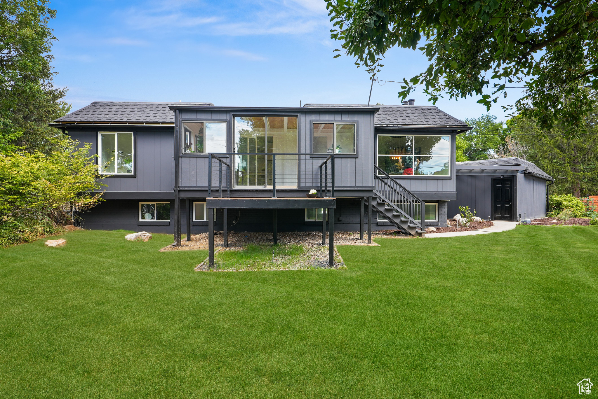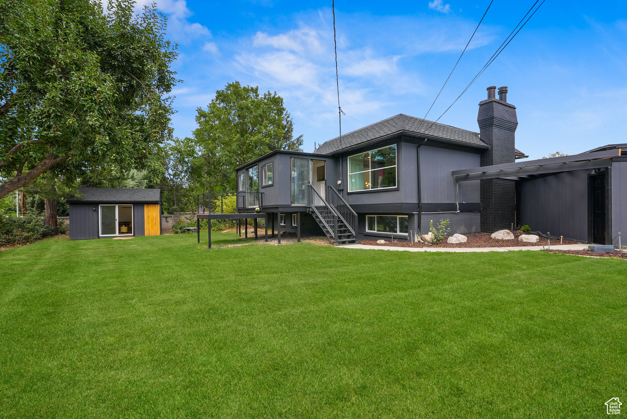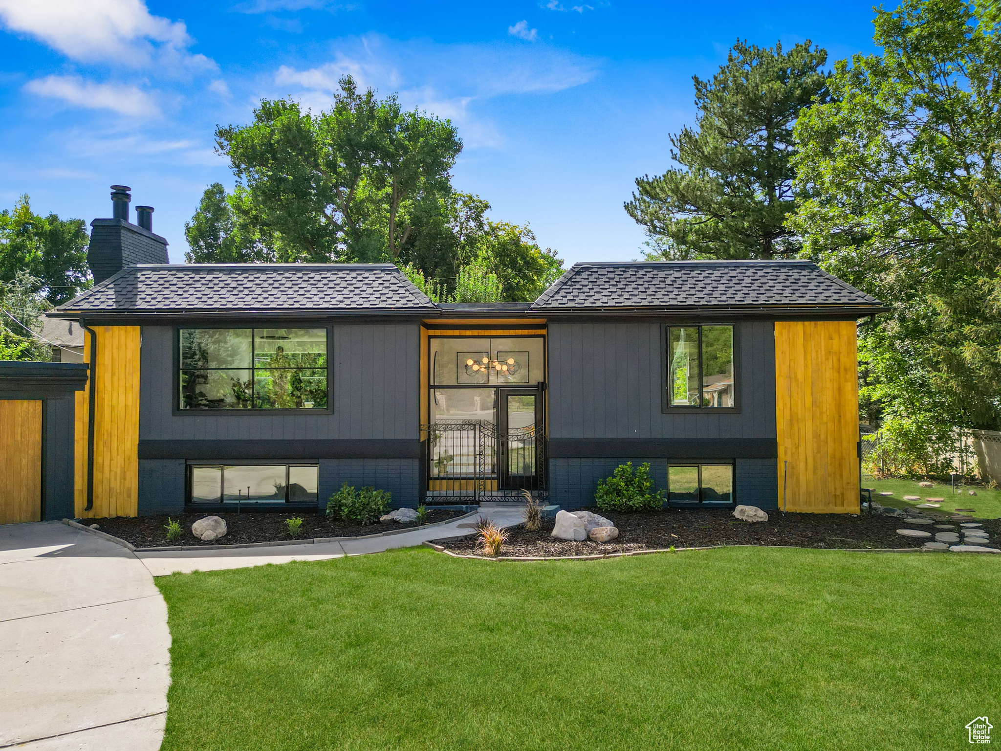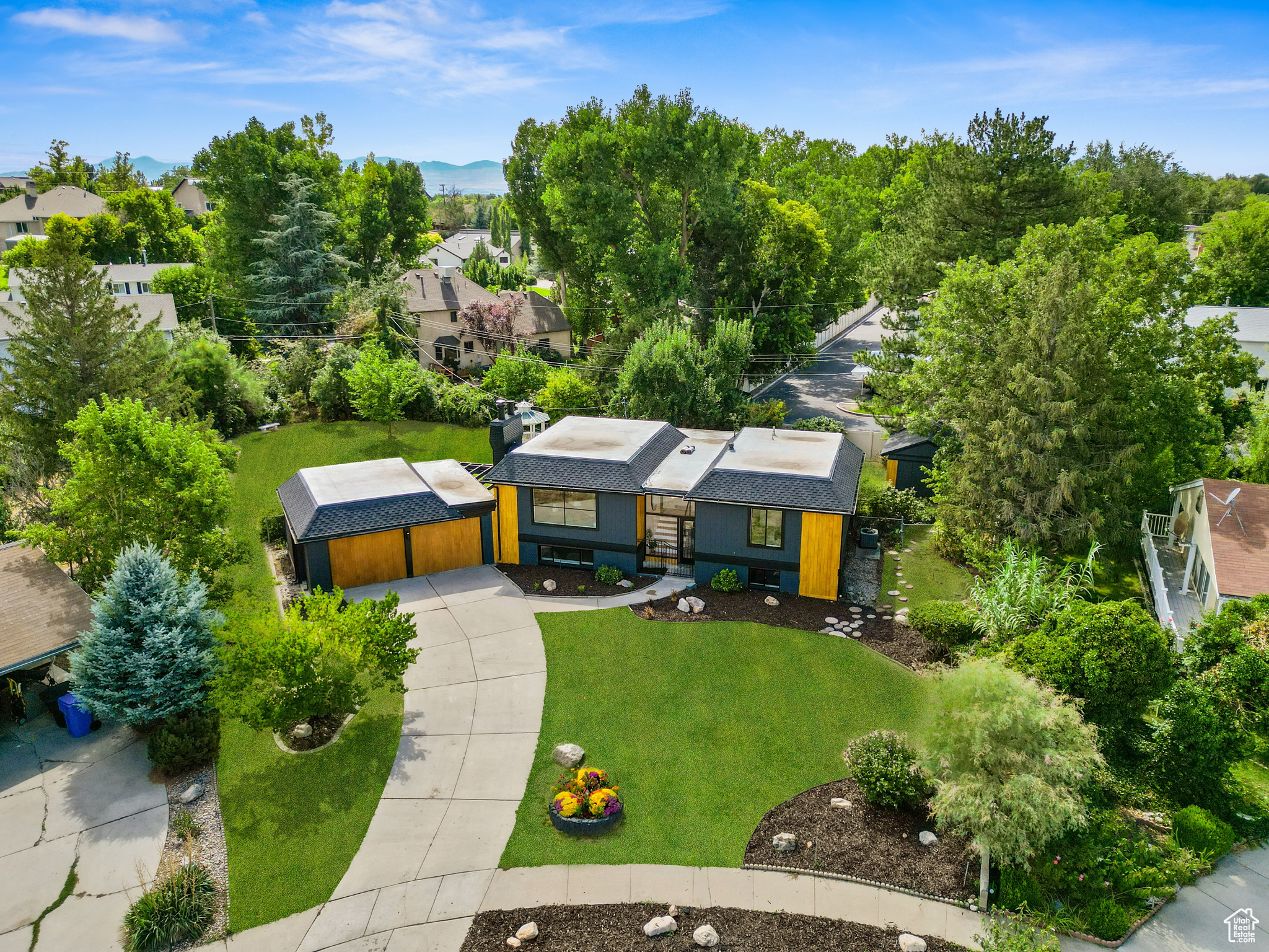 Modern Elegance Meets Comfort in Coveted Cul-de-Sac Location. Welcome to this beautifully updated home where warm wood tones contrast perfectly with sleek grey and black finishes, giving it a sharp, modern aesthetic that still feels like home. Tucked away in a peaceful cul-de-sac, this property offers stunning views of Mount Olympus and a secluded retreat with a fully fenced, oversized yard featuring mature trees, fruit trees, and a freshly hydro-seeded lawn both front and back. Step inside to find all-new windows and doors, brand new carpet and flooring, and a stylish living and dining area accented by a bohemian-style chandelier. The kitchen is a chef's dream, boasting brand new stainless steel appliances, a built-in beverage cooler, and modern finishes throughout. The luxurious primary suite includes a spa-like bathroom with an expansive infinity drain shower, floating vanity, smart toilet, and a walk-in closet. Outside, a garden area and sprinkler system make outdoor living easy and enjoyable. A detached, climate-controlled dwelling in the backyard offers the perfect flex space for a home office, art studio, or yoga retreat. Located in a desirable area within the Granite School District, and just down the road from a community baseball field, this home combines comfort, style, and convenience in one incredible package.