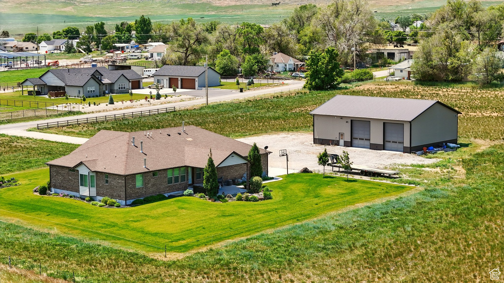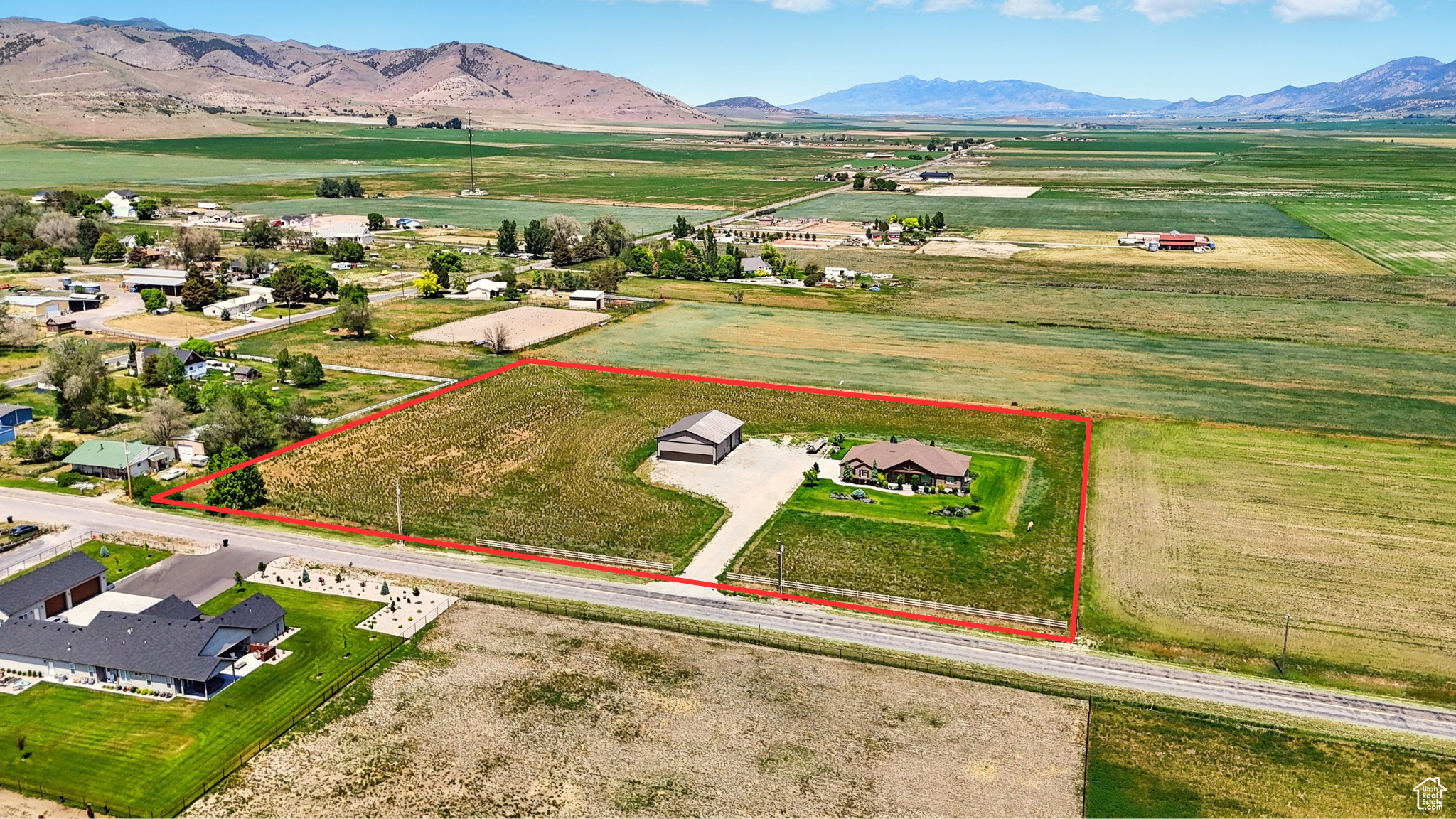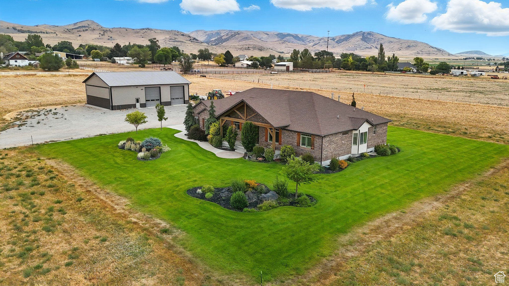 Welcome to this beautiful rustic country estate in the quaint town of Portage, Utah. Nestled on over 6 acres and surrounded by sweeping valley views and mountains, this 4656 sq. ft. ranch-style rambler was built with quality, comfort, and timeless design in mind. Inside, you'll find 4 spacious bedrooms, 4 bathrooms, and main-level living with an open floor plan featuring vaulted ceilings, wood flooring throughout, and three cozy gas fireplaces. The fully finished basement includes a private garage entrance, ideal for guests or extended family. A large laundry room with custom cabinetry and an oversized 3-car garage-equipped with hot/cold water and a utility sink-make everyday living both functional and convenient. Craftsmanship and efficiency were top priorities, with extra insulation, a whole-house ventilation system with heat exchanger, dual furnaces and water heaters, and two 1,000-gallon buried propane tanks. Both the home and the shop are supported by their own septic systems. Outdoor living is equally impressive. Relax on the covered patio with a gas fireplace, plumbed for a hot tub and perfect for summer picnics, while enjoying western sunsets and the property's 3-rail concrete fencing. A true standout is the 45x60 heated and fully insulated shop/airplane hangar-complete with a 40x14 hangar door, two 12x14 shop doors, 220 power, RV hookups, an indoor bathroom, and full exterior lighting. As an added opportunity, with a 2-acre minimum building requirement, the western pasture offers the potential to create an additional building lot with 200 ft. frontage (available only after the home has sold). This home has been immaculately cared for, built to last, and comes with TVs, state-of-the-art sound equipment, and a 12-month home warranty. Shown to qualified buyers by appointment only. Buyers to verify all information.