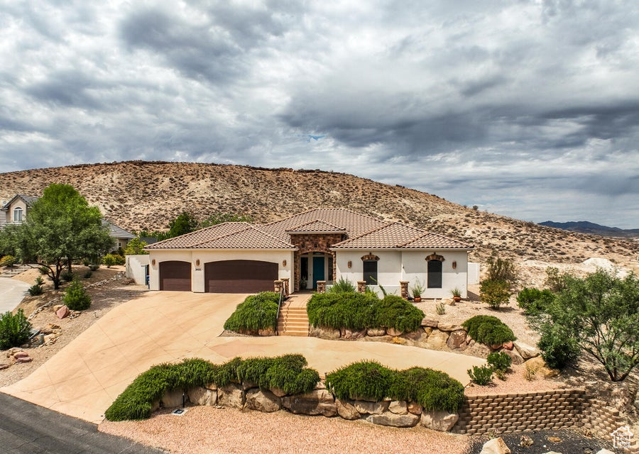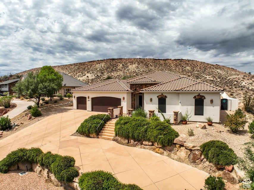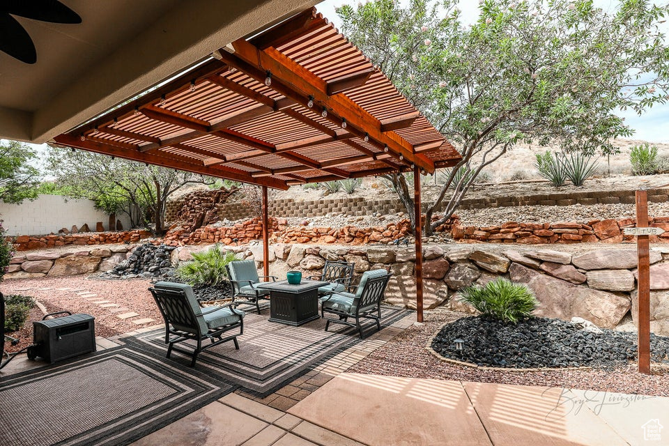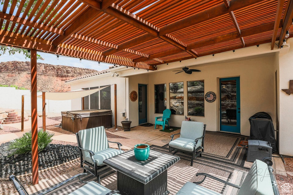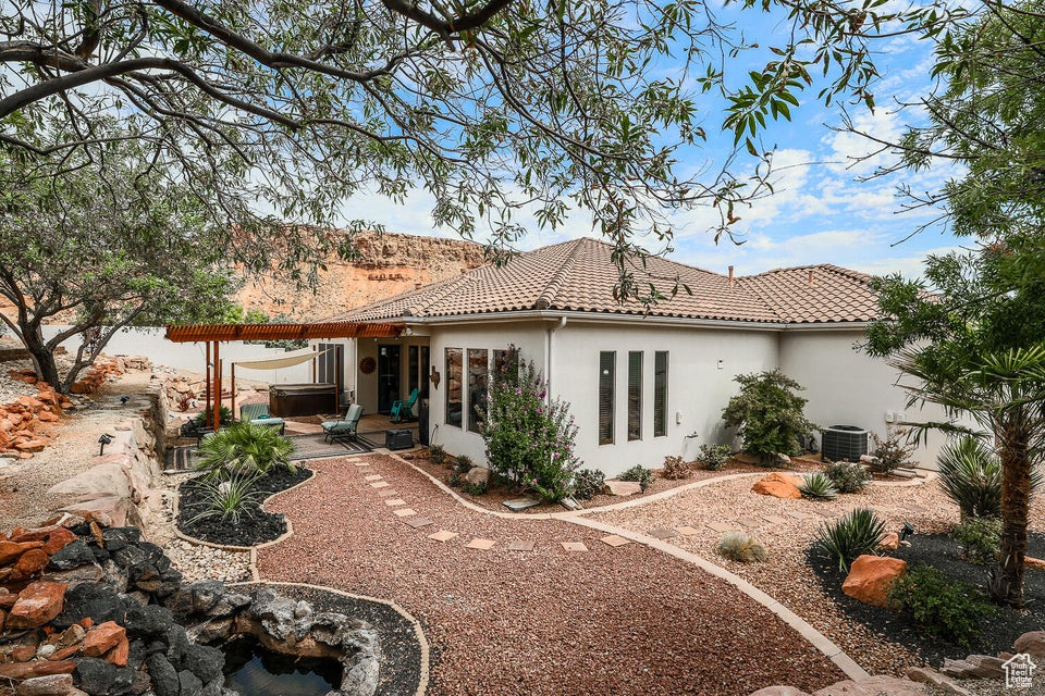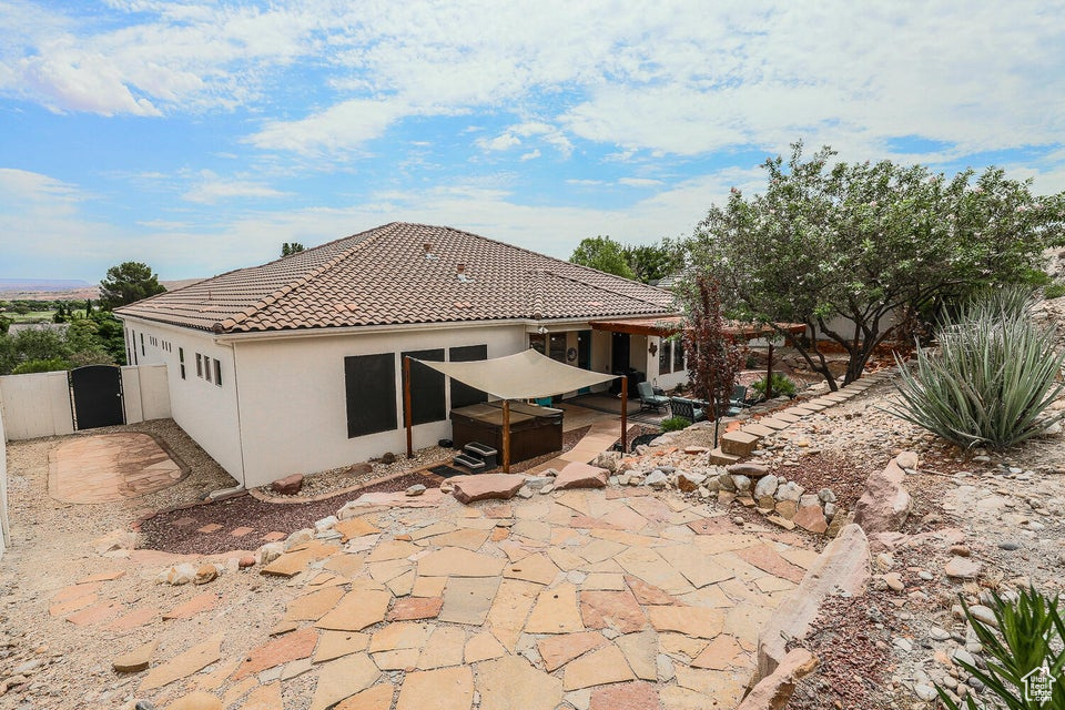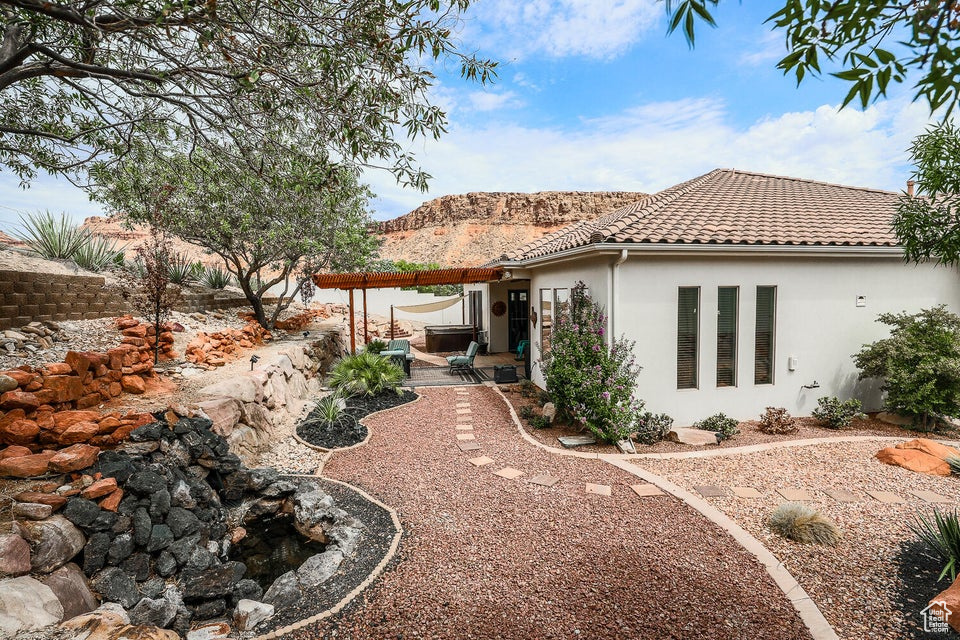 Discover a rare retreat in the desert-this 3-bedroom, 3.5-bath home with a den offers both comfort and privacy. The spacious primary suite features a cozy fireplace, a sitting area, and direct access to a secluded patio, creating the perfect spot to unwind. The property backs onto BLM land, ensuring peace, quiet, and wide-open views. Nature lovers will appreciate the occasional desert tortoise wandering through the backyard, while outdoor enthusiasts will love the unbeatable location-just steps away from the world-famous Bearclaw Poppy mountain biking trails and surrounded by stunning petroglyphs. Endless miles of hiking, biking, and walking trails begin right outside your door. Inside, warm earth-tone finishes bring the natural beauty of the desert indoors, creating a calming and inviting atmosphere. After a day of adventure, relax in your private hot tub and soak in the serenity of this unique setting. This home blends modern comfort with unmatched access to Southern Utah's outdoor lifestyle making it a true one-of-a-kind opportunity.