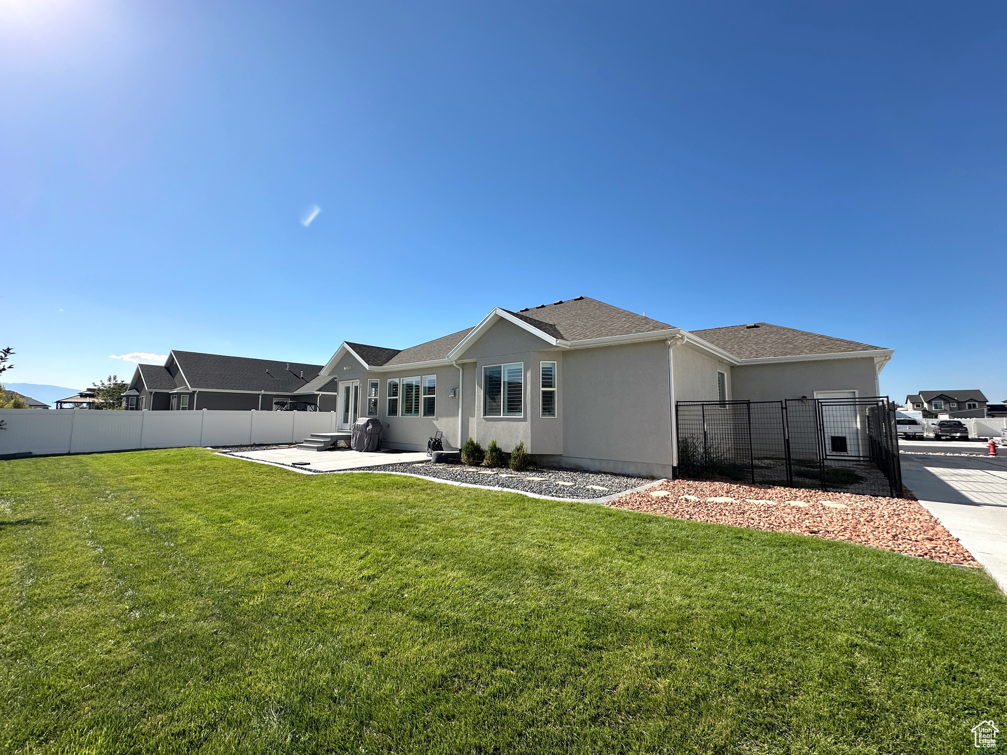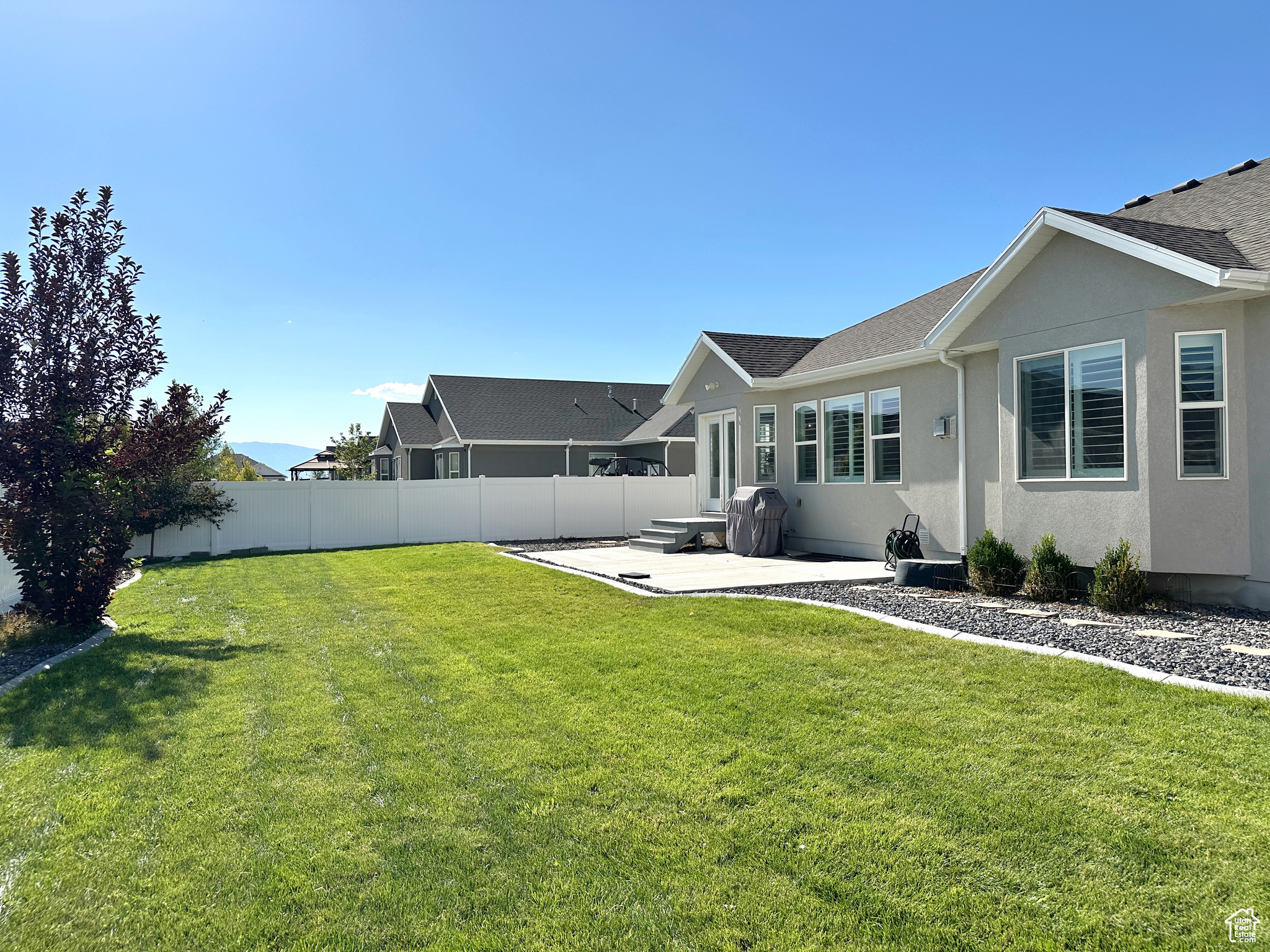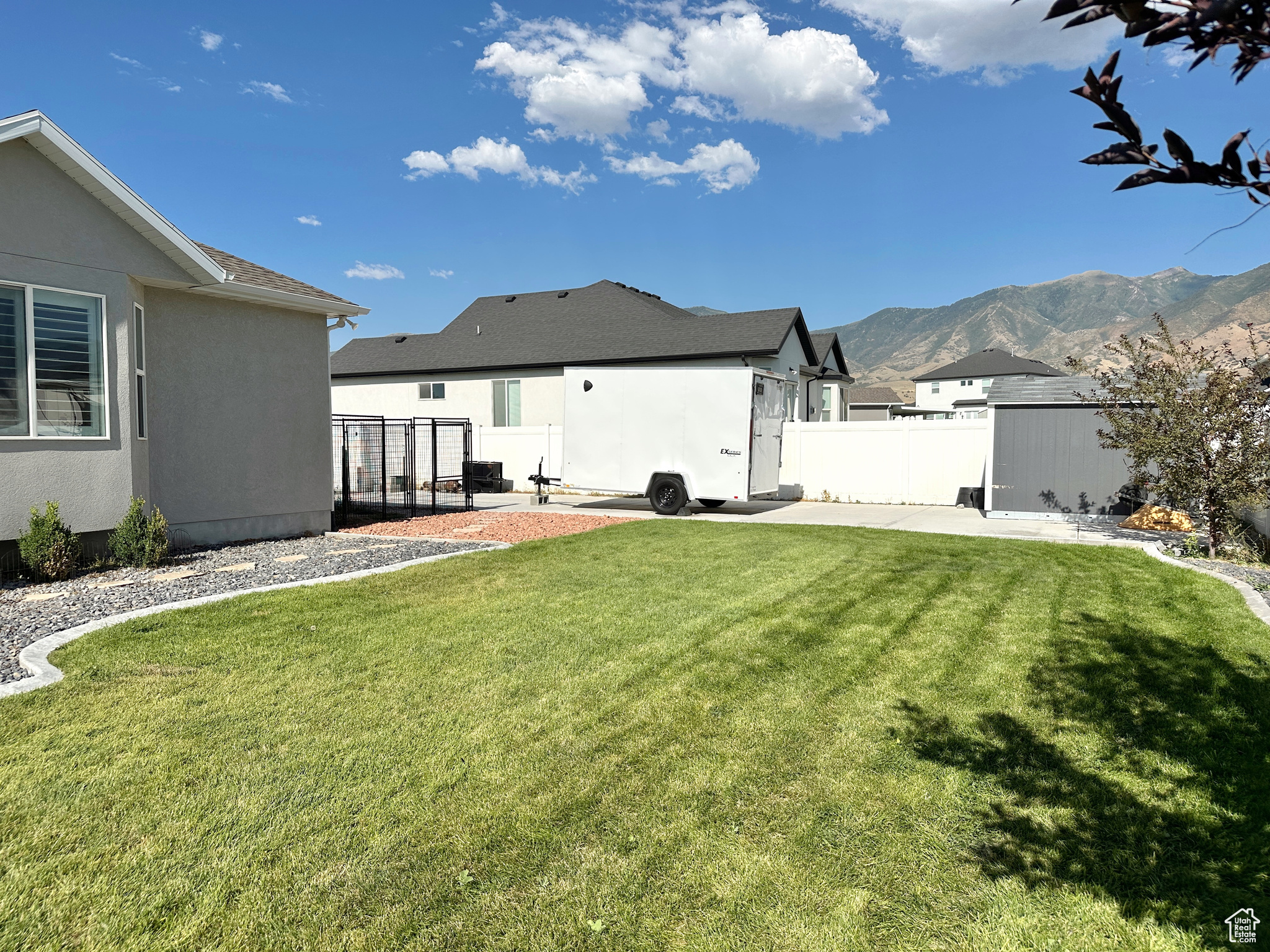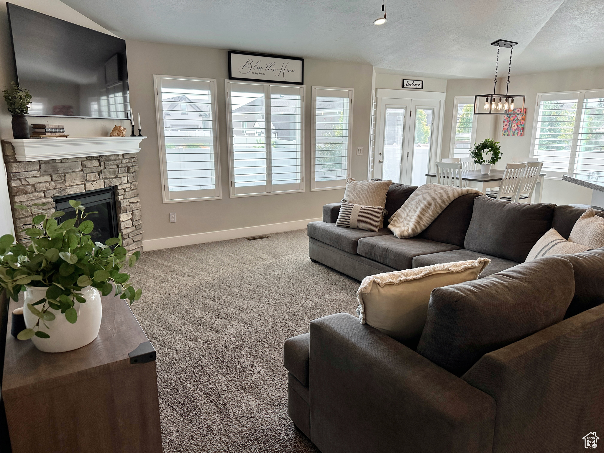 Welcome to this beautiful rambler, nestled in a peaceful Stansbury Park neighborhood. Step inside to a bright, open interior with vaulted ceilings and large windows that fill the home with natural light. The kitchen features elegant granite countertops, ample cabinet space and a spacious layout. The living room centers around a stylish stone fireplace with plantation shutters throughout the home that add both style and function. Enjoy mountain views and beautiful sunsets! The expansive basement is ready to be finished to suit your needs, perfect for working from home or creative projects. Located within walking distance to Stansbury High School, Stansbury Junior High and close proximity to 3 elementary schools. So many bonuses: fully fenced yard with Huge RV parking 17x114 feet; EverLights in the eves with programmable color combinations, 65 inch TV above fireplace included, garage and basement shelving included, kitchen refrigerator negotiable, 3rd car garage door has extra height, seller financing possible with the right terms. Don't miss your chance--schedule a showing today and see what makes this home so special!