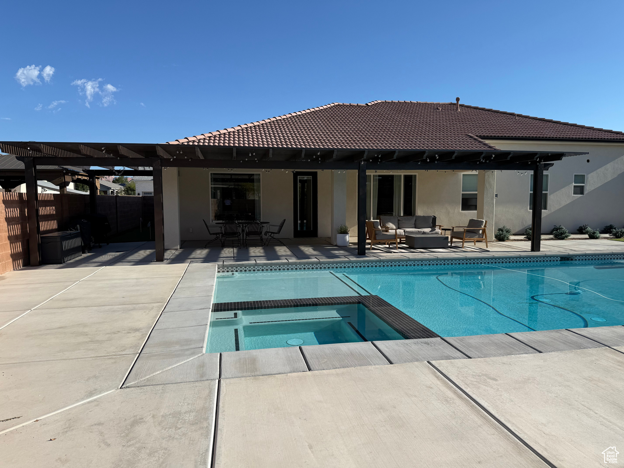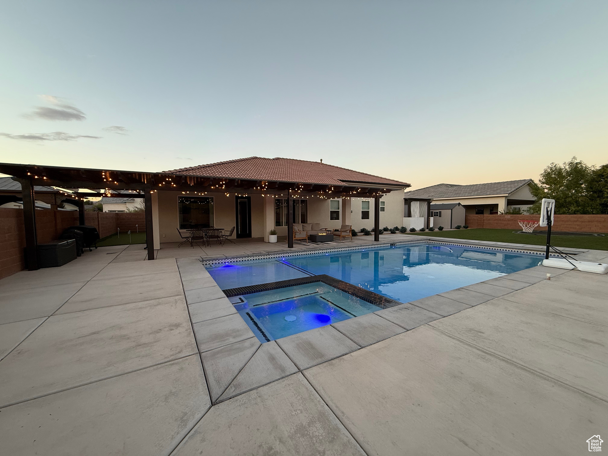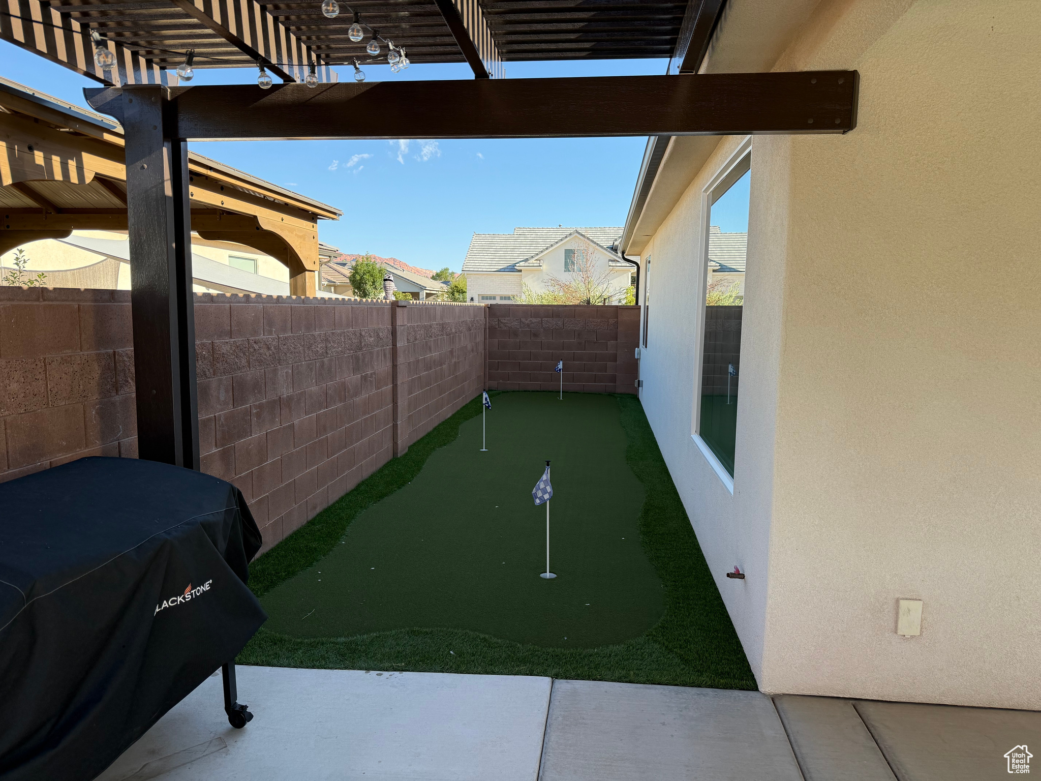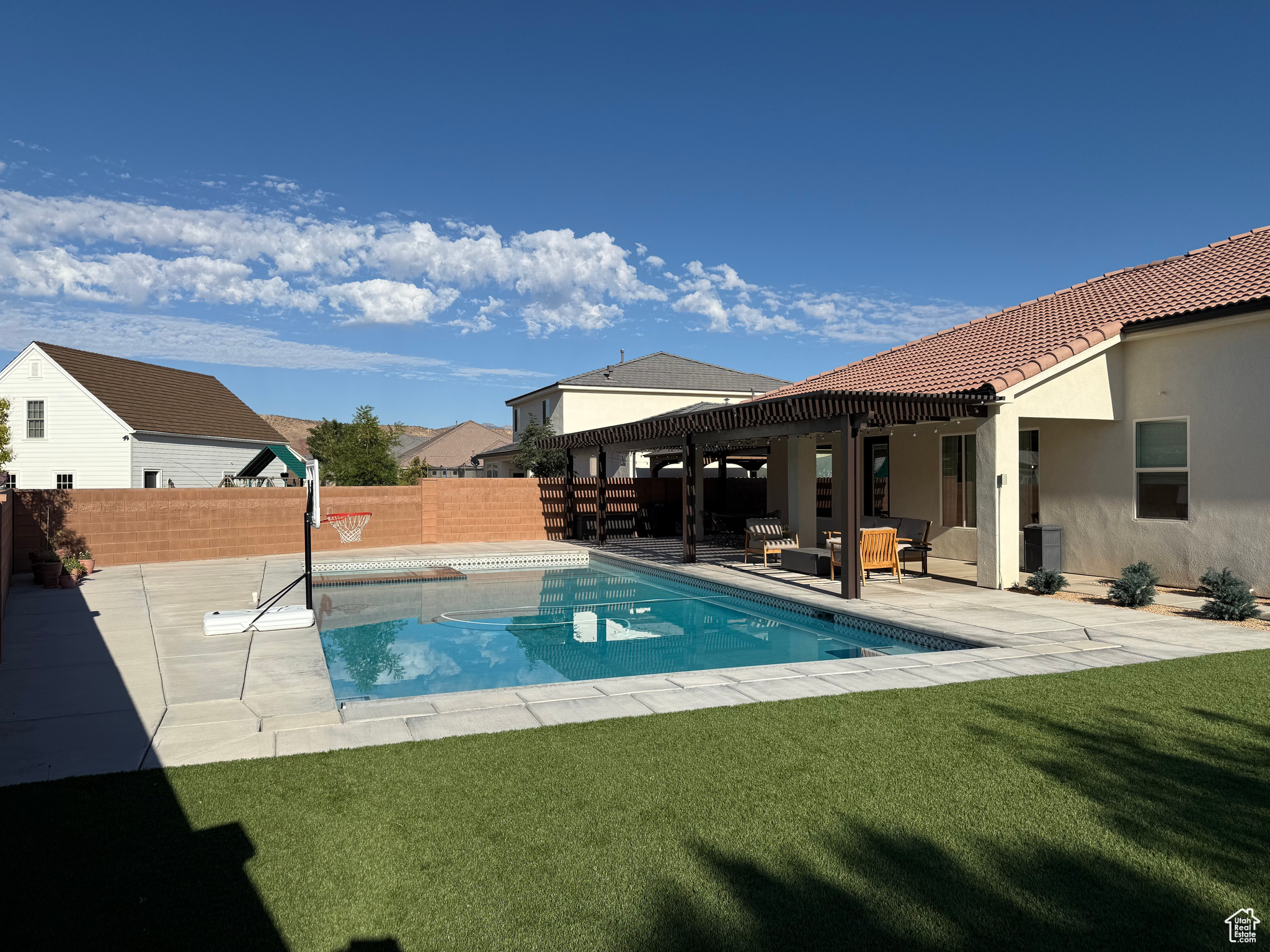 Welcome to your dream home perfectly situated on the border of Santa Clara and St. George City, offering both convenience and comfort in a quiet, friendly neighborhood. This stunning Spanish-style rambler features 4 spacious bedrooms, 2 full baths, and a 3-car garage, with thoughtful upgrades throughout. The open layout boasts 9 to 12 foot ceilings, 8-foot interior and exterior doors, oak and painted cabinetry, GE Caf appliances, a Bosch dishwasher, and a cozy gas-plumbed fireplace. The master suite offers a spa-like retreat with a freestanding tub and beautifully appointed finishes. Step outside to your private oasis with a sparkling swimming pool, spa, fire pit, covered patio with awning, turf landscaping in both front and back, putting green, 28' RV/trailer concrete parking pad behind gate, plus an outdoor shed for extra storage-all with no HOA. With easy access to top-rated schools, shopping, grocery stores, gas stations, and the natural beauty of Snow Canyon State Park, this home perfectly blends style, function, and location.