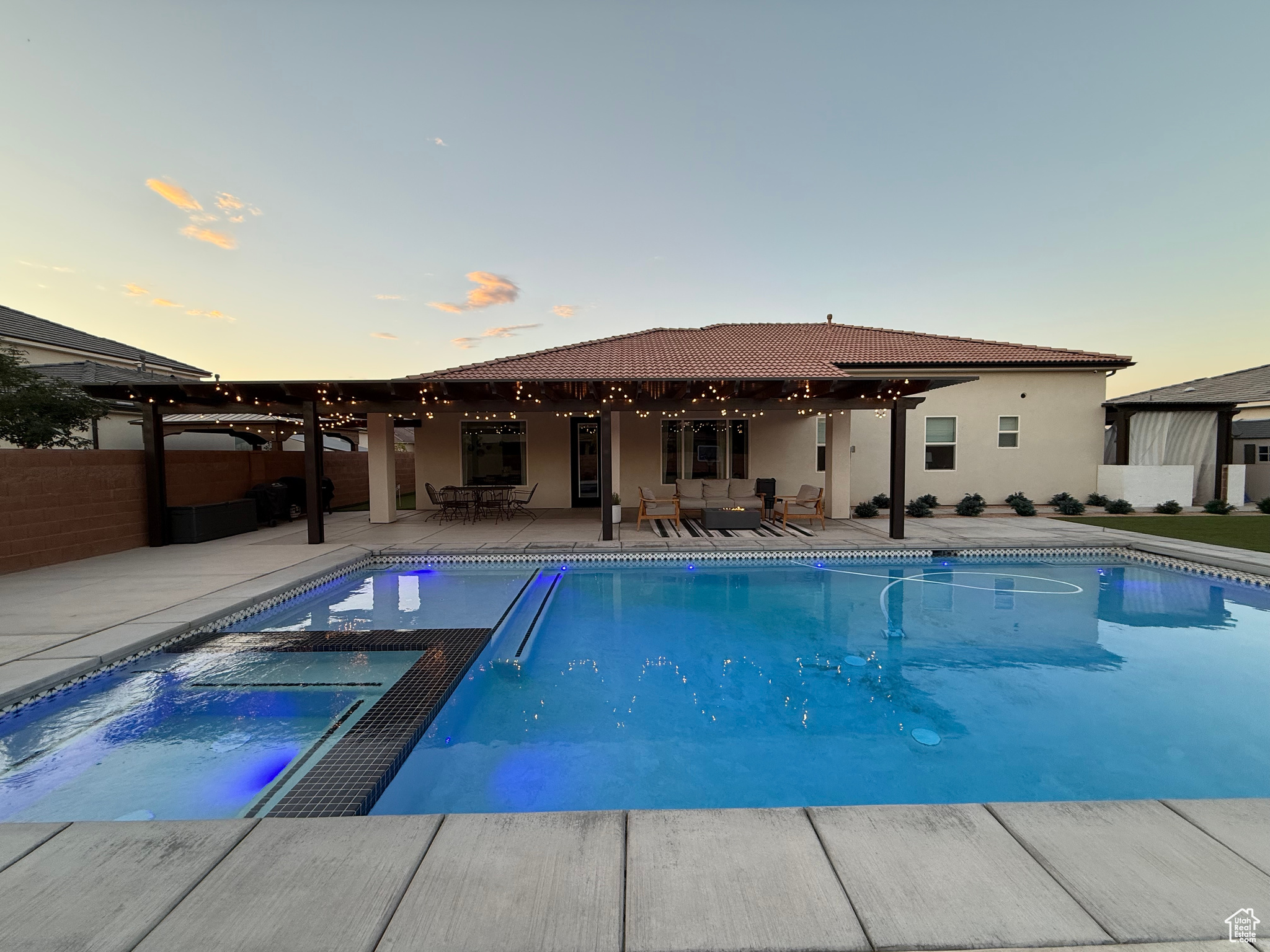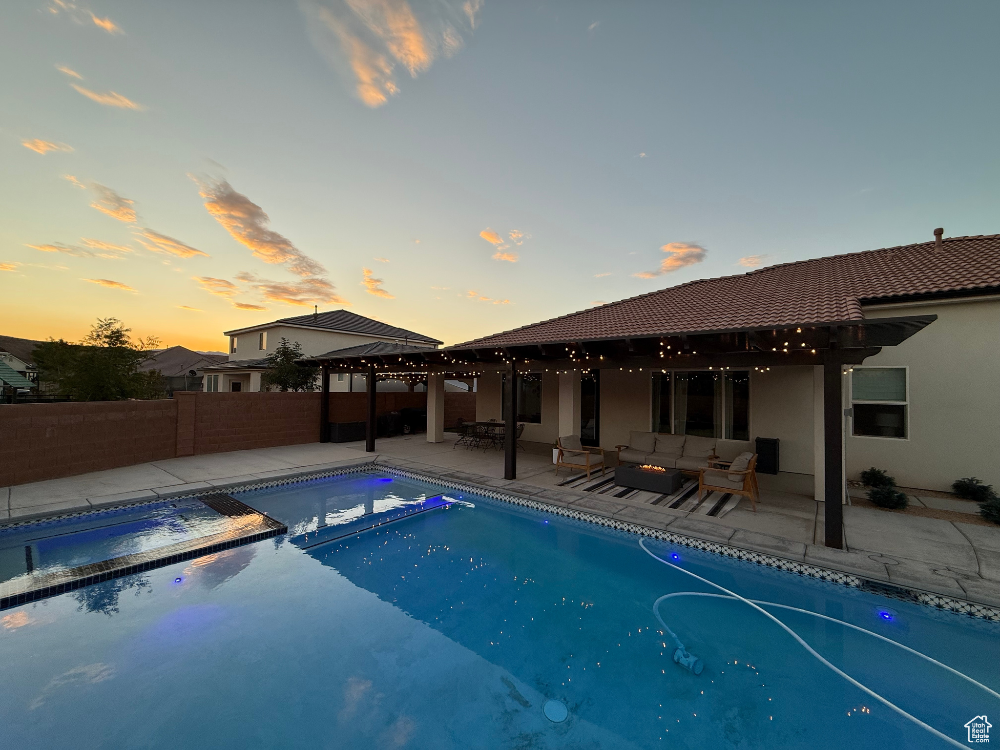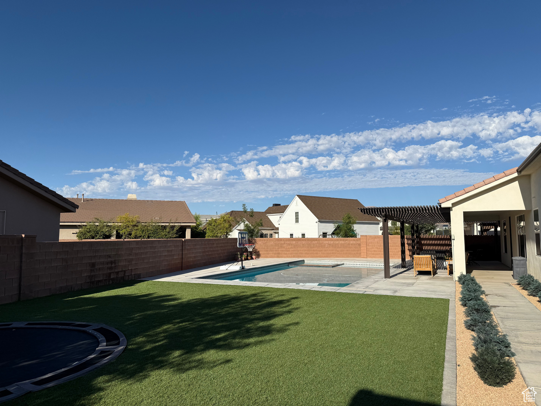 Welcome to your dream home perfectly situated on the border of Santa Clara and St. George City, offering both convenience and comfort in a quiet, friendly neighborhood. This stunning Spanish-style rambler features 4 spacious bedrooms, 2 full baths, and a 3-car garage, with thoughtful upgrades throughout. The open layout boasts 9 to 12 foot ceilings, 8-foot interior and exterior doors, oak and painted cabinetry, GE Caf appliances, a Bosch dishwasher, and a cozy gas-plumbed fireplace. The master suite offers a spa-like retreat with a freestanding tub and beautifully appointed finishes. Step outside to your private oasis with a sparkling swimming pool, spa, fire pit, covered patio with awning, turf landscaping in both front and back, putting green, 28' RV/trailer concrete parking pad behind gate, plus an outdoor shed for extra storage-all with no HOA. With easy access to top-rated schools, shopping, grocery stores, gas stations, and the natural beauty of Snow Canyon State Park, this home perfectly blends style, function, and location.