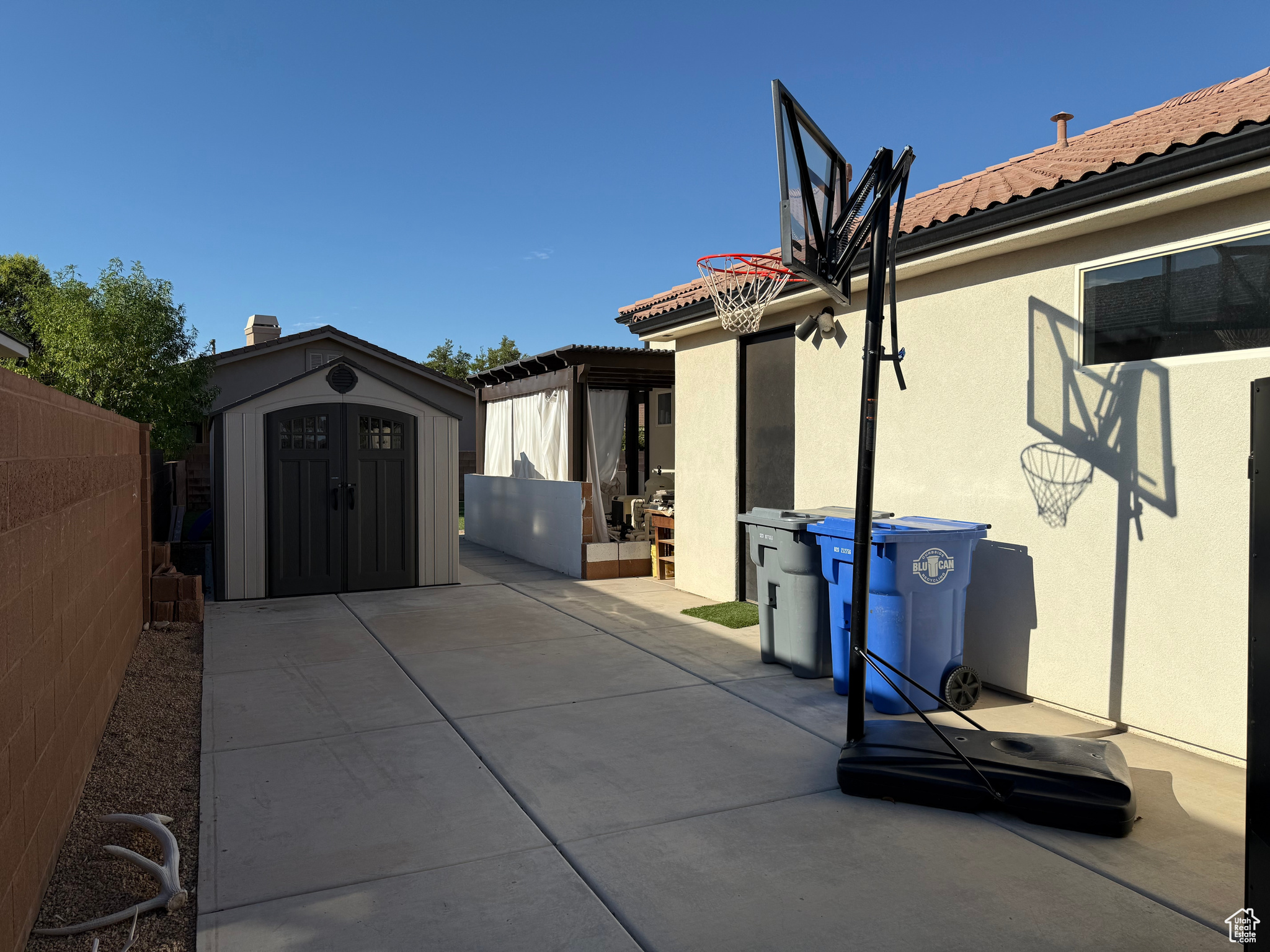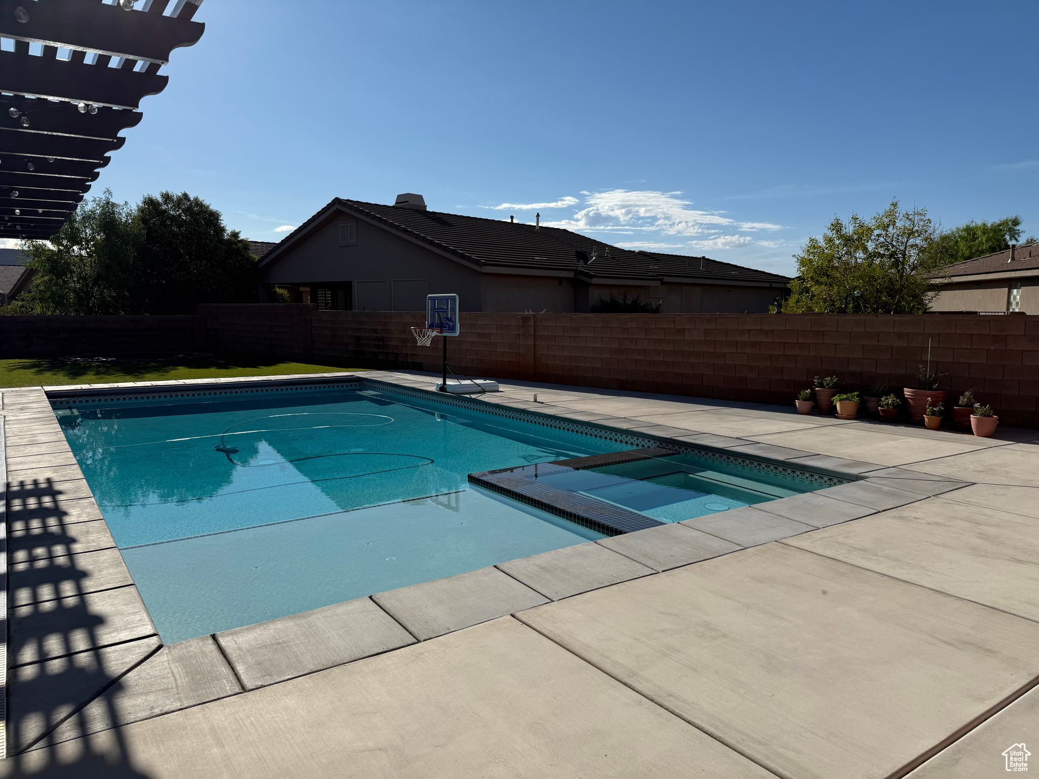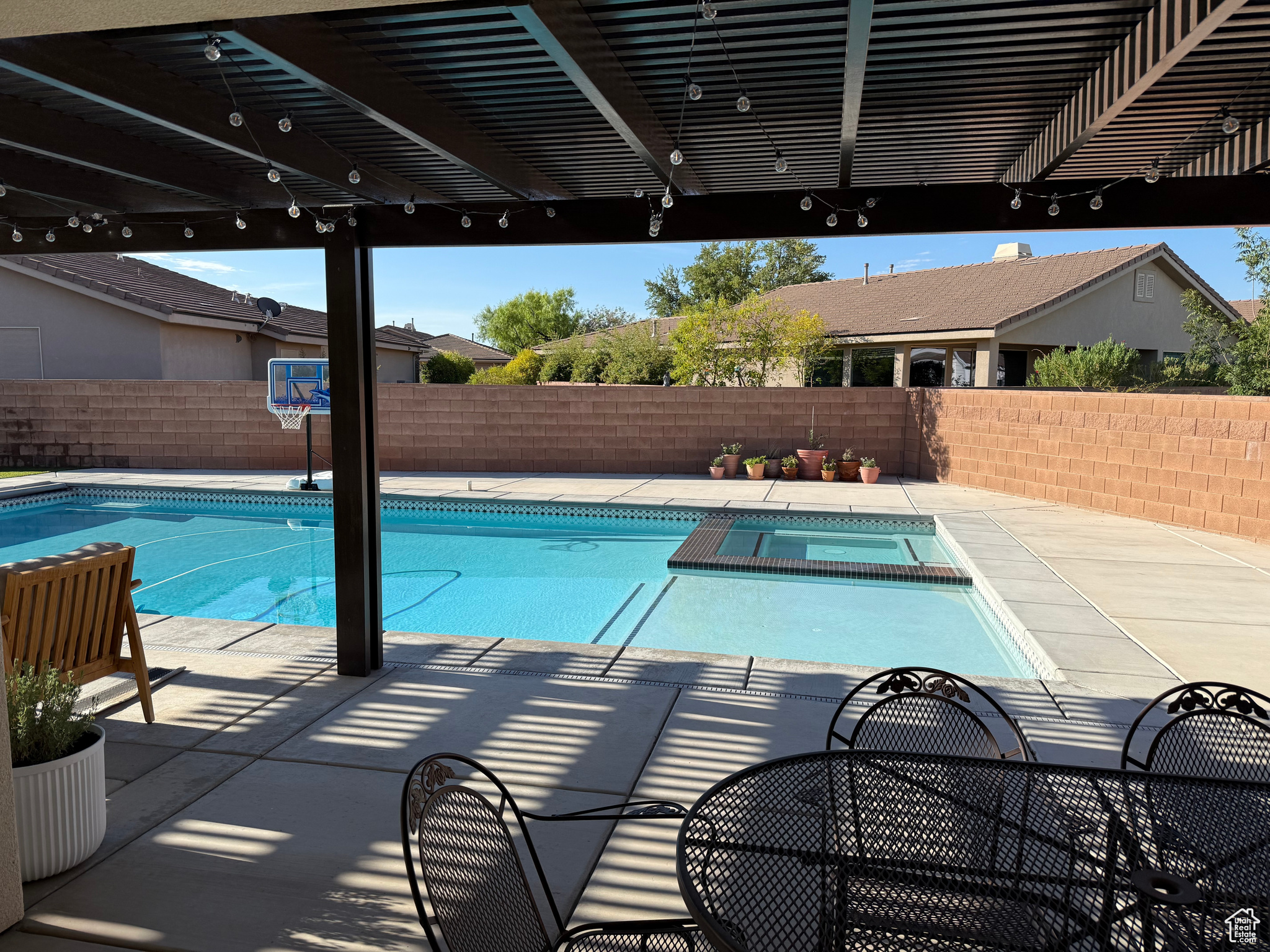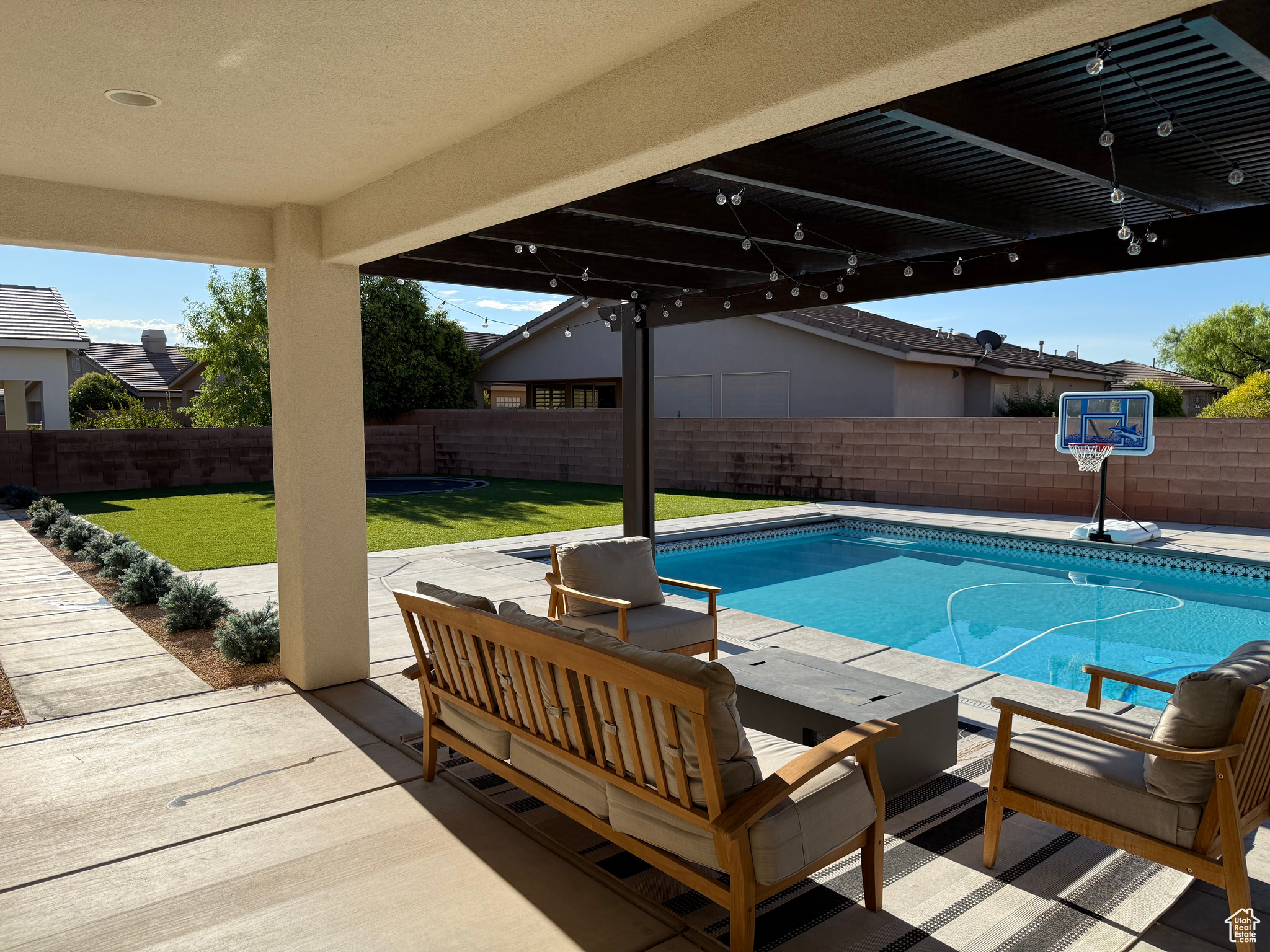 Welcome to your dream home perfectly situated on the border of Santa Clara and St. George City, offering both convenience and comfort in a quiet, friendly neighborhood. This stunning Spanish-style rambler features 4 spacious bedrooms, 2 full baths, and a 3-car garage, with thoughtful upgrades throughout. The open layout boasts 9 to 12 foot ceilings, 8-foot interior and exterior doors, oak and painted cabinetry, GE Caf appliances, a Bosch dishwasher, and a cozy gas-plumbed fireplace. The master suite offers a spa-like retreat with a freestanding tub and beautifully appointed finishes. Step outside to your private oasis with a sparkling swimming pool, spa, fire pit, covered patio with awning, turf landscaping in both front and back, putting green, 28' RV/trailer concrete parking pad behind gate, plus an outdoor shed for extra storage-all with no HOA. With easy access to top-rated schools, shopping, grocery stores, gas stations, and the natural beauty of Snow Canyon State Park, this home perfectly blends style, function, and location.