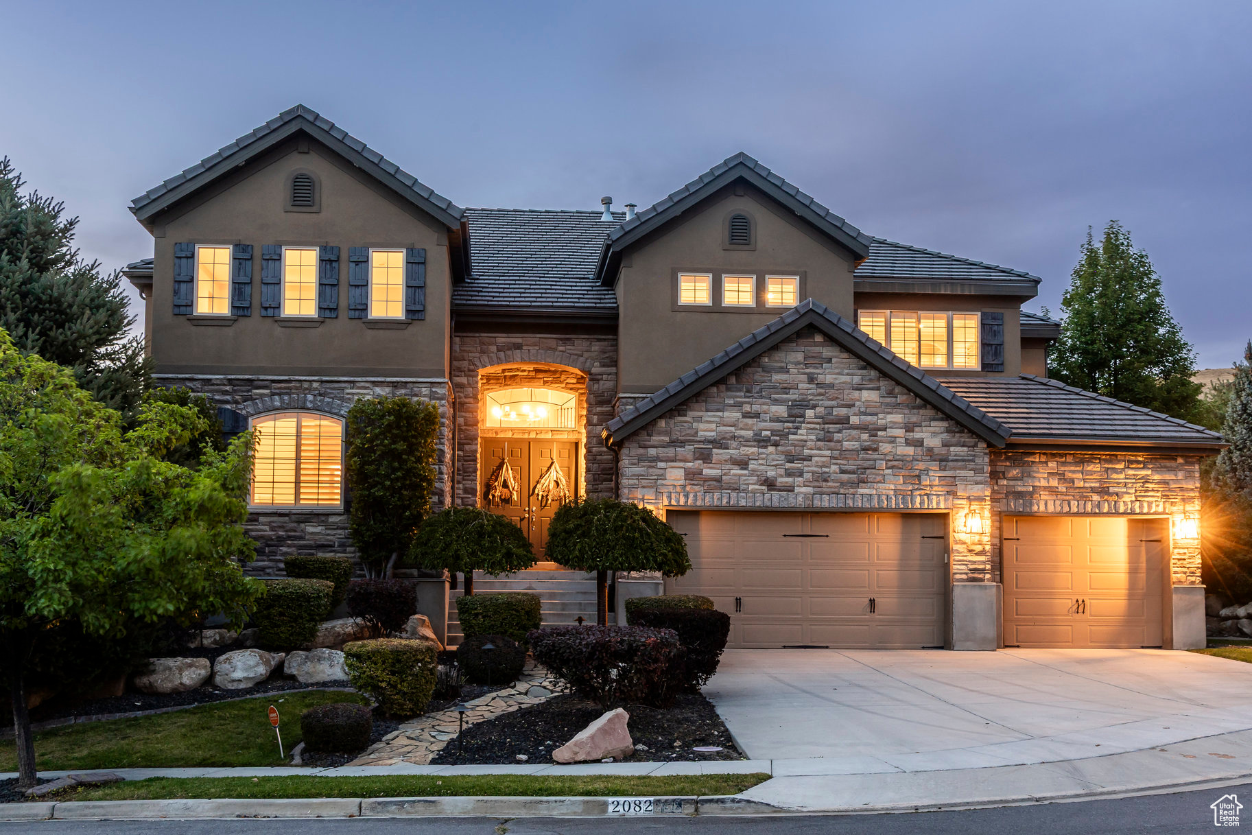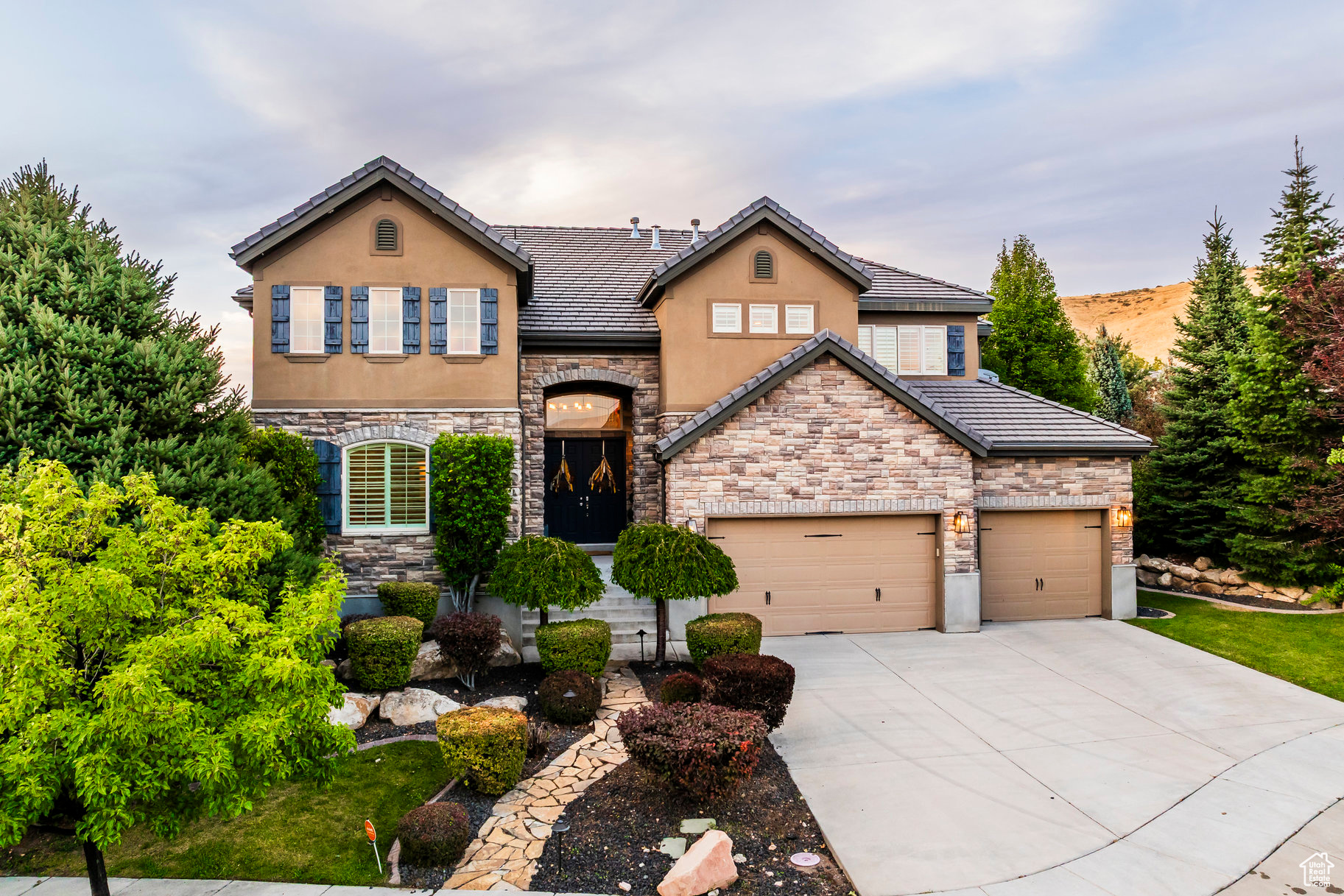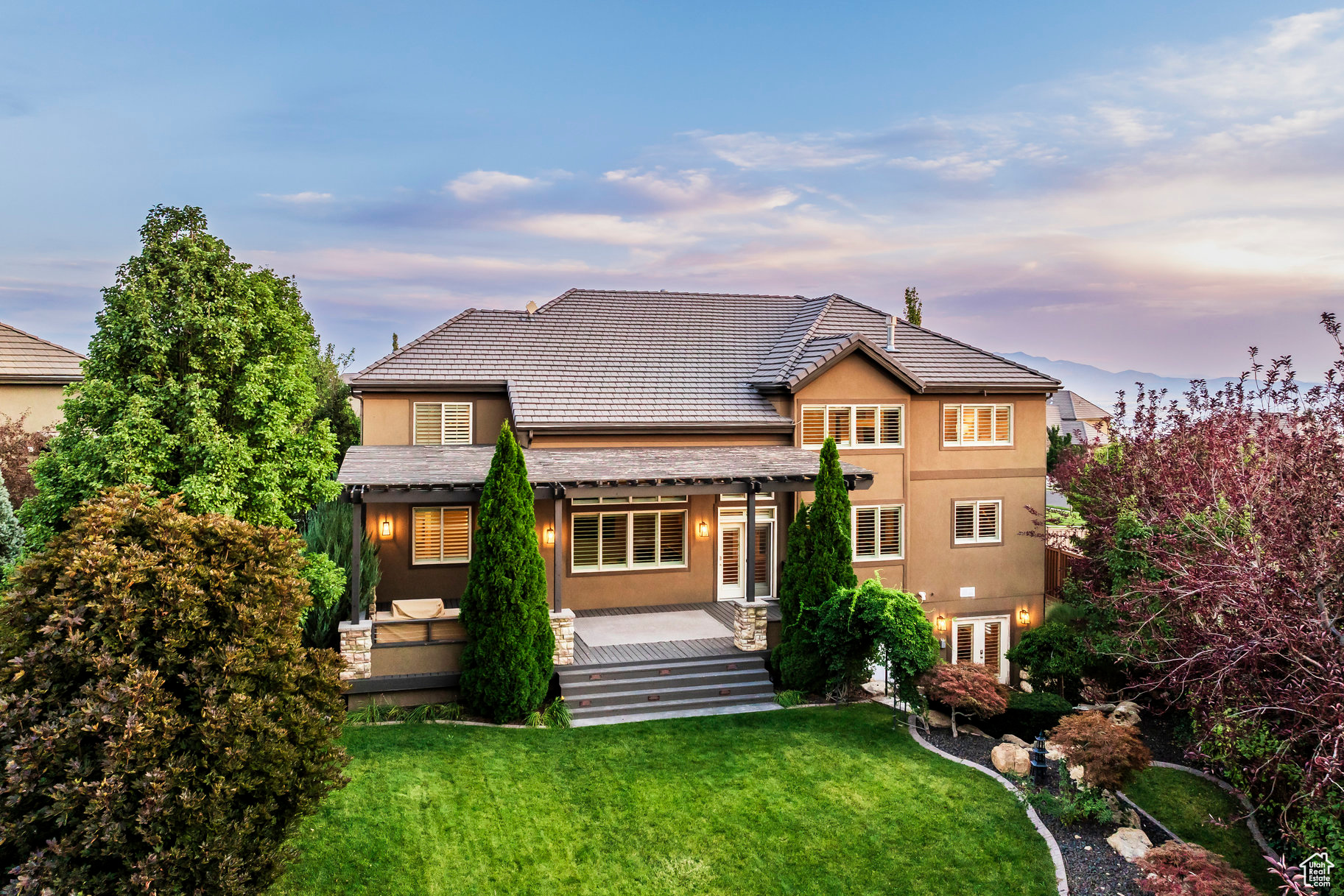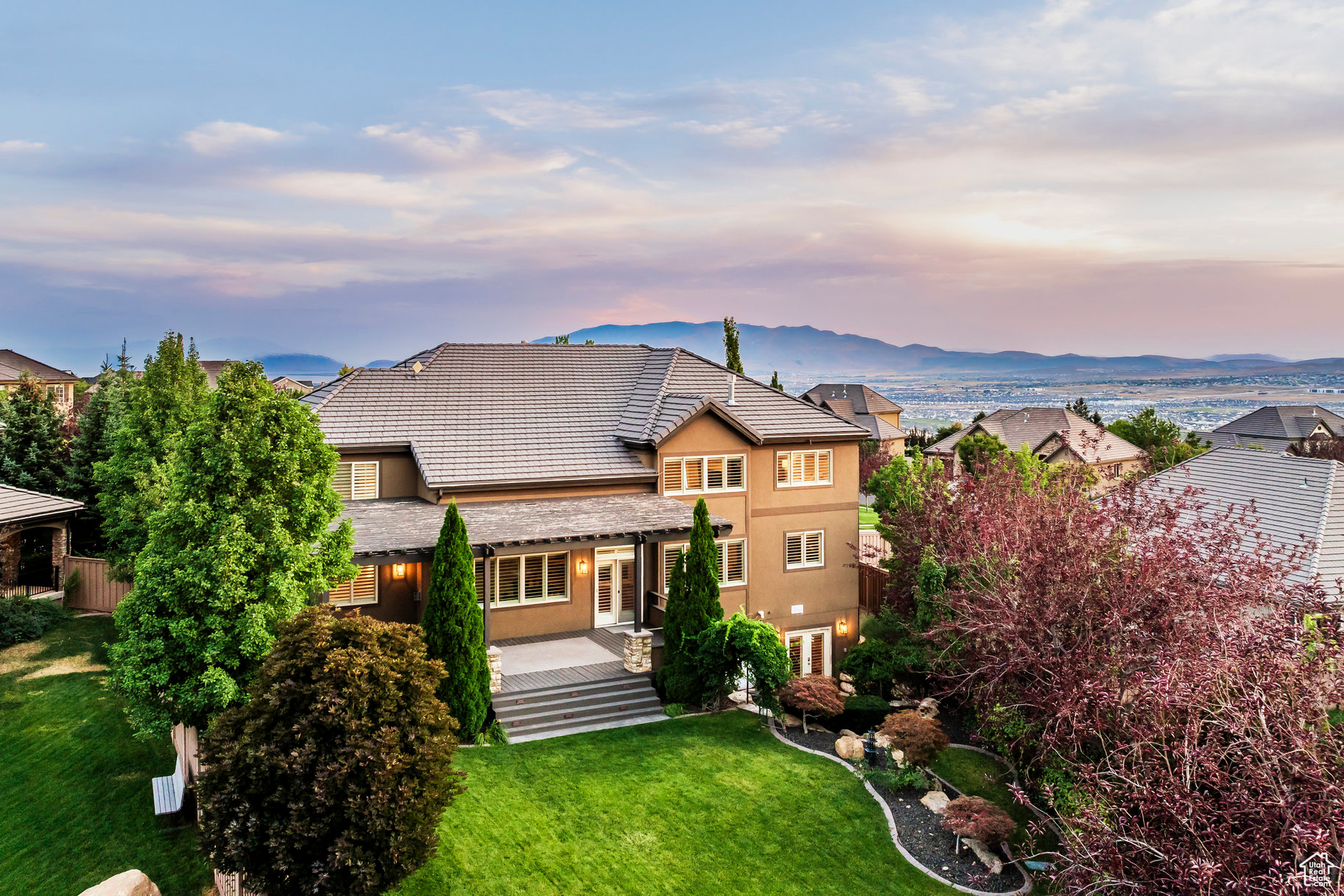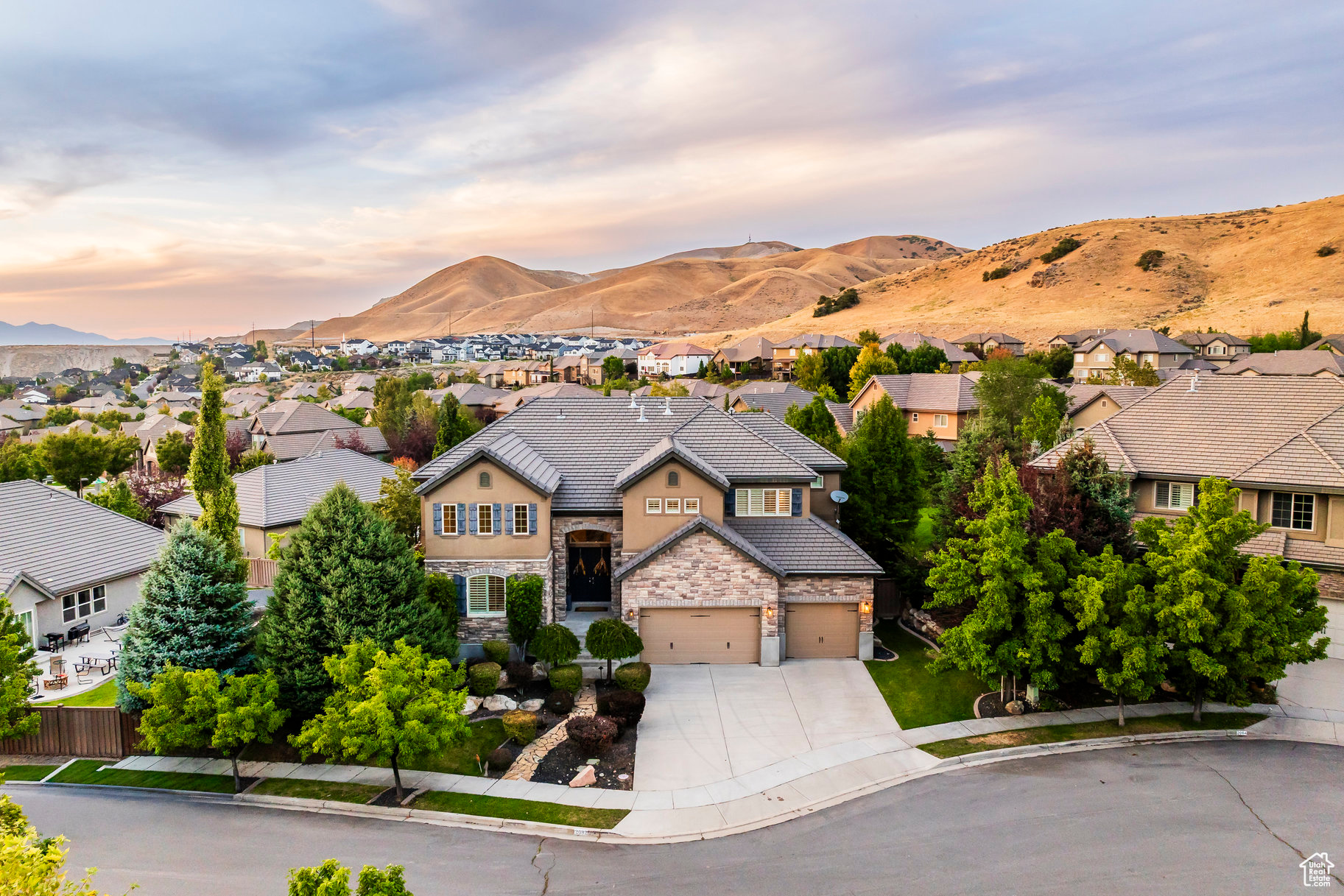 Tucked away in one of Lehi's most desirable neighborhoods, this exceptional residence is one of only four homes in a private cul-de-sac, offering sweeping mountain and valley views along the Traverse Mountain bench. From the moment you step inside, you're welcomed by the warmth of rich Walnut hardwood floors and a soaring double-height foyer that sets the stage for the home's blend of luxury and comfort. The open-concept living space flows seamlessly into a gourmet kitchen featuring Viking stainless steel appliances, double wall ovens, and an oversized granite island with striking iron accents. A custom wood, iron, and frosted-glass barn door conceals the pantry, merging style with function. Downstairs, the home transforms into a true entertainer's retreat. A full second kitchen-also equipped with Viking appliances-anchors the space, complemented by a guest suite, full bath, glass-enclosed steam shower, home gym, and a tiered theater room designed for unforgettable movie nights. Walkout French doors lead to an outdoor sanctuary with a natural stone patio, hot tub, trellis-covered deck, and a fully equipped outdoor kitchen with granite-topped BBQ station-perfect for hosting under the stars. The upper level is devoted to rest and rejuvenation. The primary suite offers a dual-sided fireplace, expansive "his & hers" walk-in closets, and a spa-inspired bathroom with dual vanities, soaking tub, glass shower, and private water closet. A spacious three-car garage completes the property, providing plenty of room for vehicles and outdoor gear. This rare offering combines elegance, comfort, and convenience-all within minutes of Silicon Slopes, shopping, dining, and outdoor recreation.