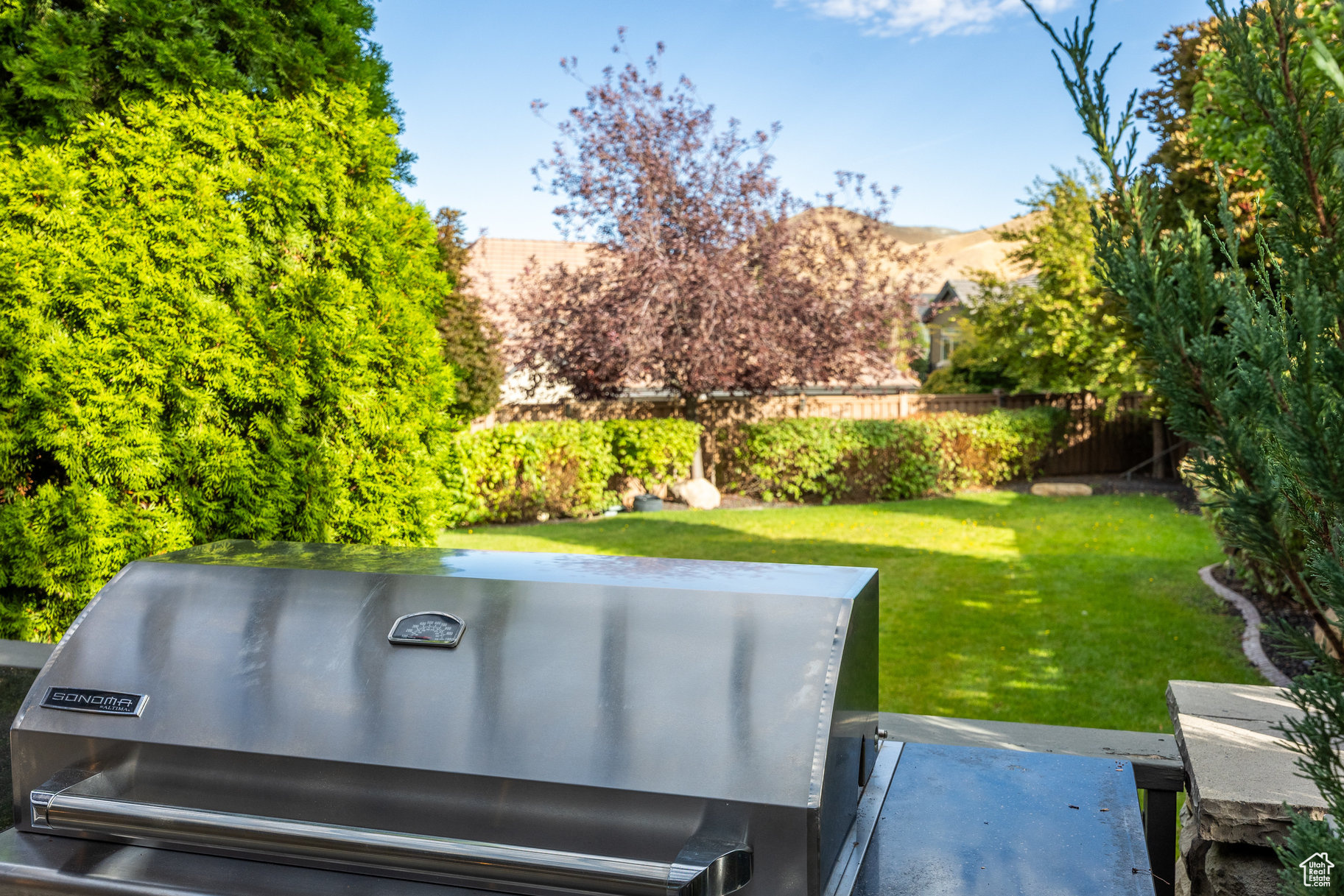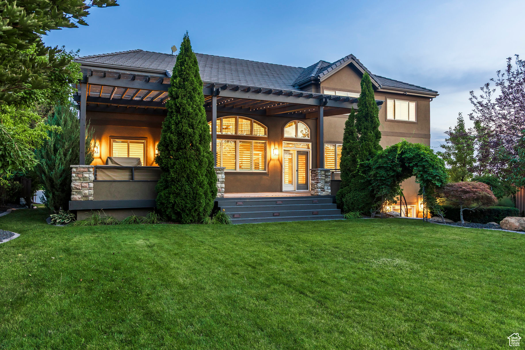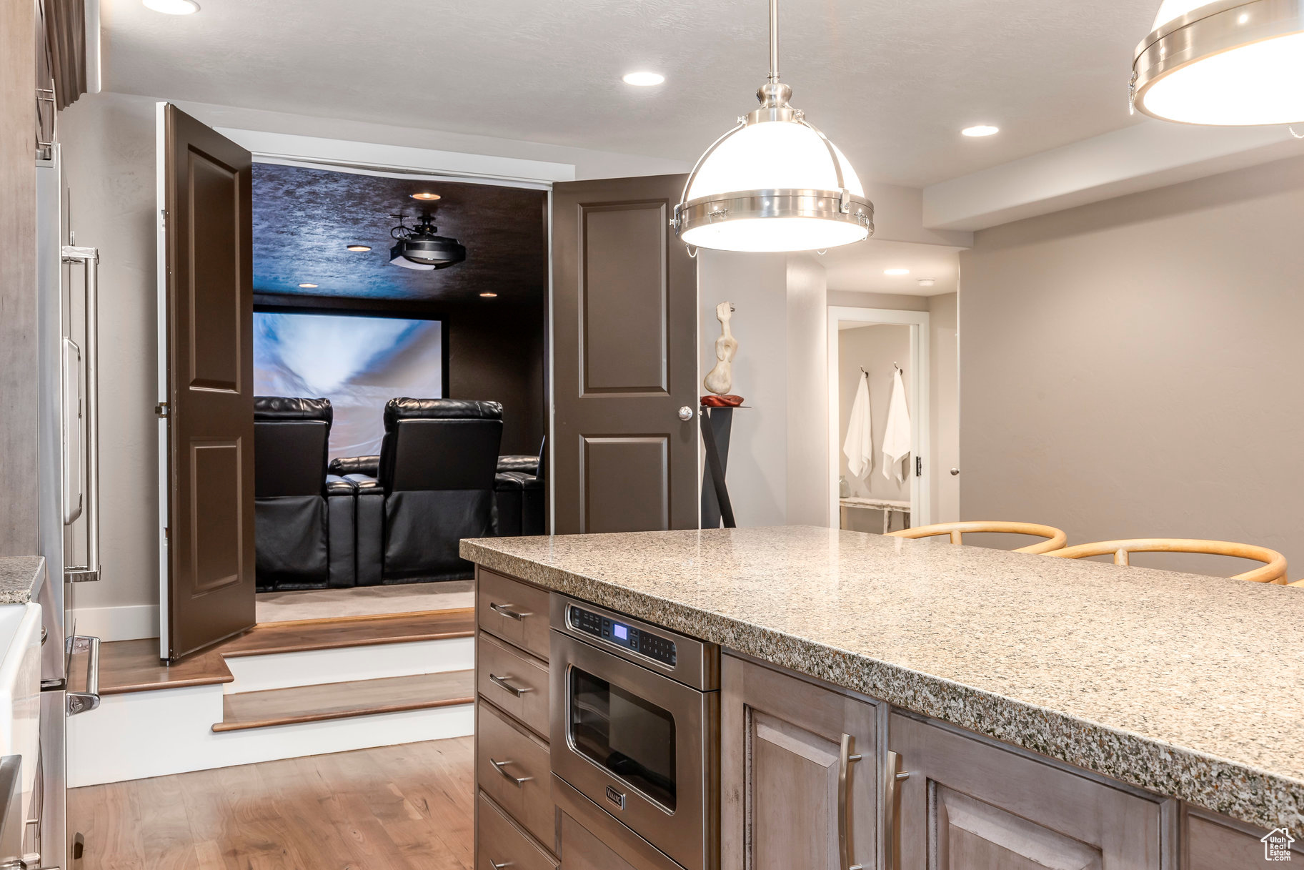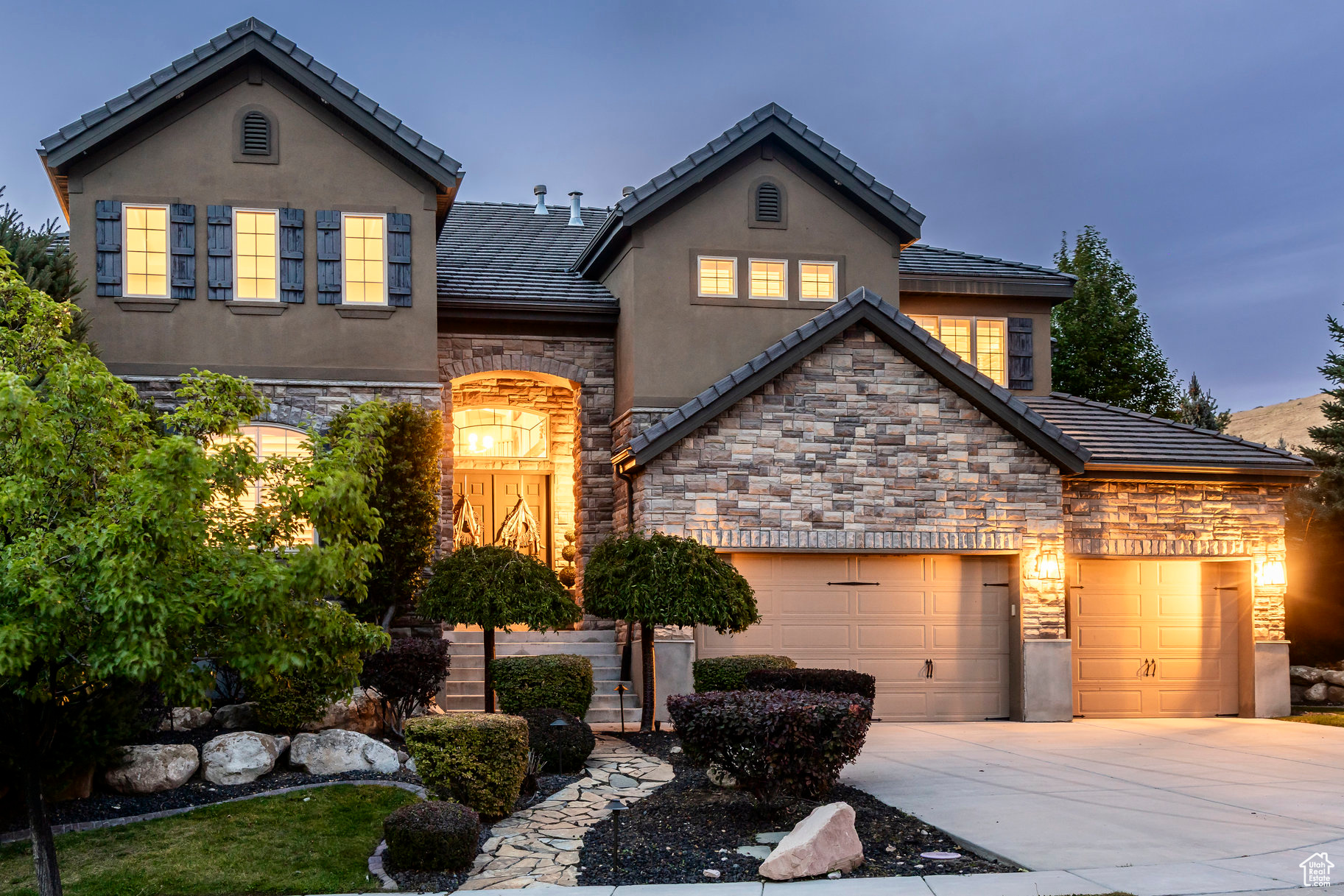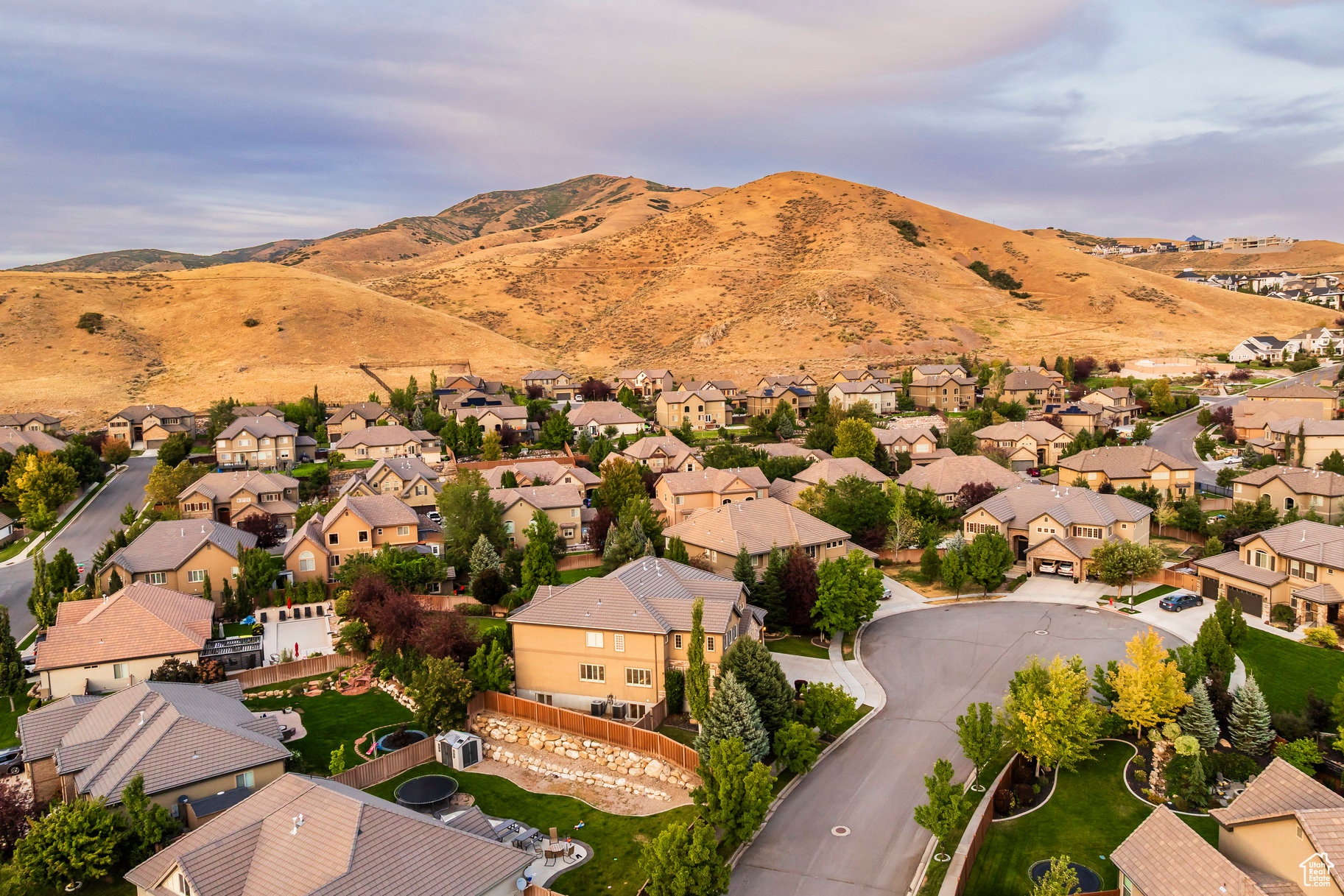 Tucked away in one of Lehi's most desirable neighborhoods, this exceptional residence is one of only four homes in a private cul-de-sac, offering sweeping mountain and valley views along the Traverse Mountain bench. From the moment you step inside, you're welcomed by the warmth of rich Walnut hardwood floors and a soaring double-height foyer that sets the stage for the home's blend of luxury and comfort. The open-concept living space flows seamlessly into a gourmet kitchen featuring Viking stainless steel appliances, double wall ovens, and an oversized granite island with striking iron accents. A custom wood, iron, and frosted-glass barn door conceals the pantry, merging style with function. Downstairs, the home transforms into a true entertainer's retreat. A full second kitchen-also equipped with Viking appliances-anchors the space, complemented by a guest suite, full bath, glass-enclosed steam shower, home gym, and a tiered theater room designed for unforgettable movie nights. Walkout French doors lead to an outdoor sanctuary with a natural stone patio, hot tub, trellis-covered deck, and a fully equipped outdoor kitchen with granite-topped BBQ station-perfect for hosting under the stars. The upper level is devoted to rest and rejuvenation. The primary suite offers a dual-sided fireplace, expansive "his & hers" walk-in closets, and a spa-inspired bathroom with dual vanities, soaking tub, glass shower, and private water closet. A spacious three-car garage completes the property, providing plenty of room for vehicles and outdoor gear. This rare offering combines elegance, comfort, and convenience-all within minutes of Silicon Slopes, shopping, dining, and outdoor recreation.