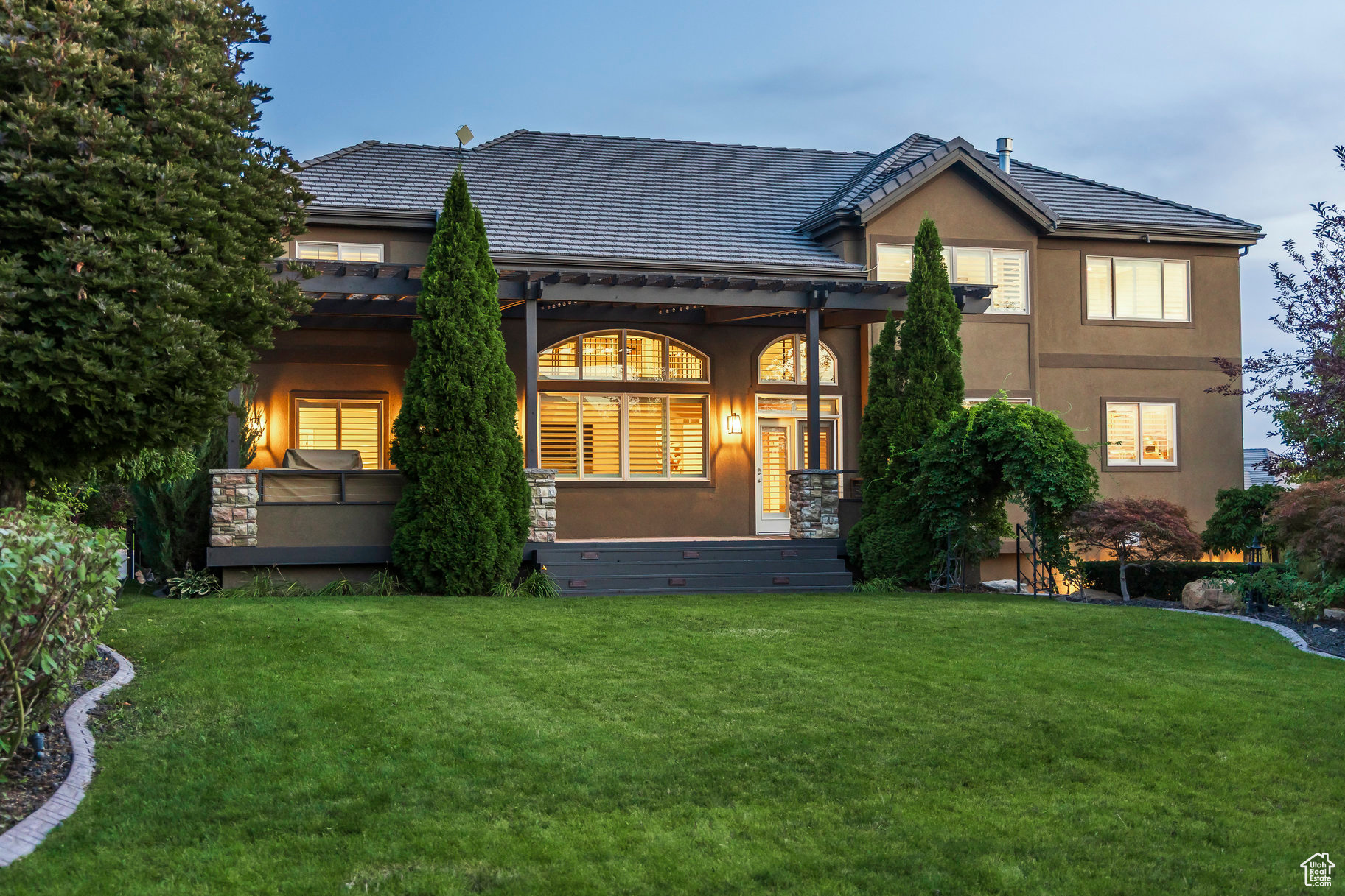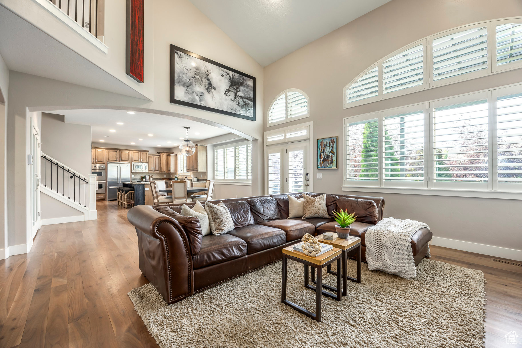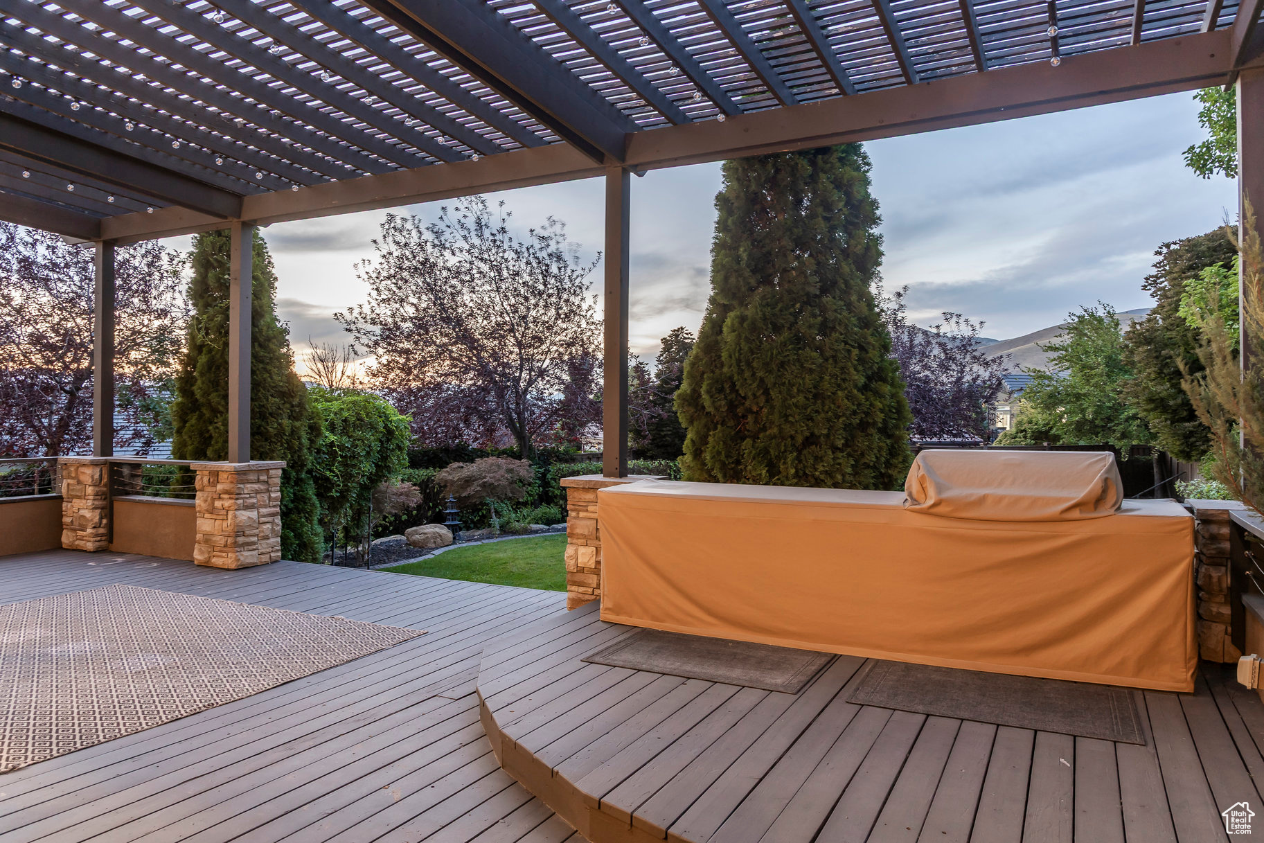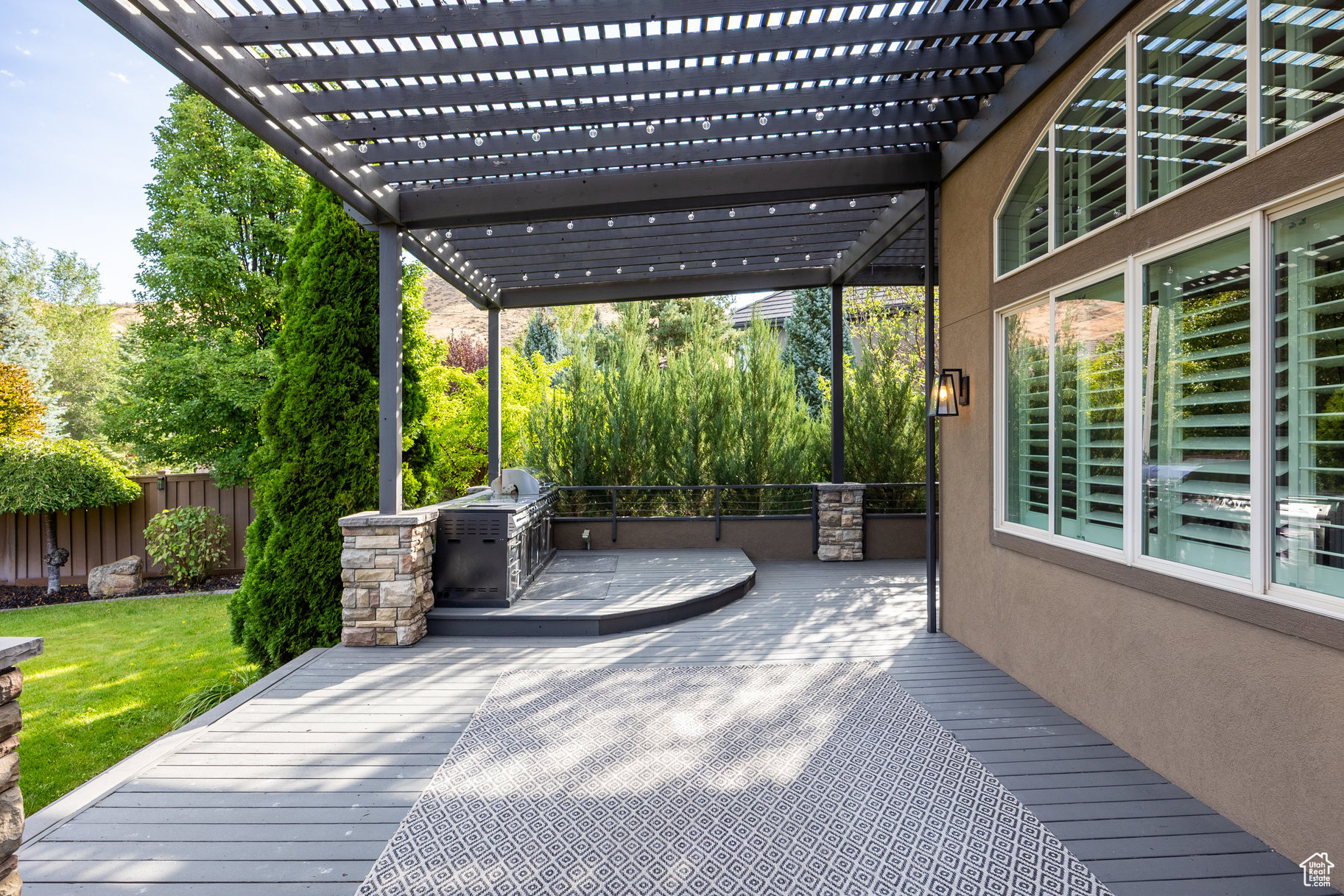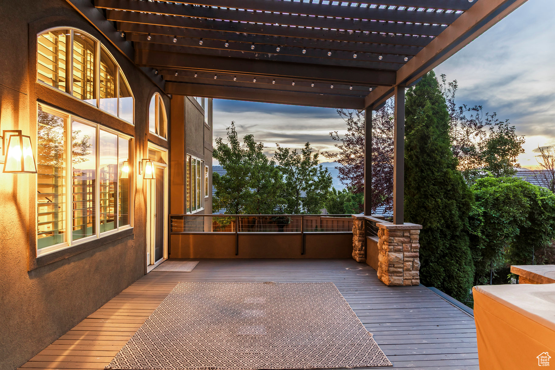 Tucked away in one of Lehi's most desirable neighborhoods, this exceptional residence is one of only four homes in a private cul-de-sac, offering sweeping mountain and valley views along the Traverse Mountain bench. From the moment you step inside, you're welcomed by the warmth of rich Walnut hardwood floors and a soaring double-height foyer that sets the stage for the home's blend of luxury and comfort. The open-concept living space flows seamlessly into a gourmet kitchen featuring Viking stainless steel appliances, double wall ovens, and an oversized granite island with striking iron accents. A custom wood, iron, and frosted-glass barn door conceals the pantry, merging style with function. Downstairs, the home transforms into a true entertainer's retreat. A full second kitchen-also equipped with Viking appliances-anchors the space, complemented by a guest suite, full bath, glass-enclosed steam shower, home gym, and a tiered theater room designed for unforgettable movie nights. Walkout French doors lead to an outdoor sanctuary with a natural stone patio, hot tub, trellis-covered deck, and a fully equipped outdoor kitchen with granite-topped BBQ station-perfect for hosting under the stars. The upper level is devoted to rest and rejuvenation. The primary suite offers a dual-sided fireplace, expansive "his & hers" walk-in closets, and a spa-inspired bathroom with dual vanities, soaking tub, glass shower, and private water closet. A spacious three-car garage completes the property, providing plenty of room for vehicles and outdoor gear. This rare offering combines elegance, comfort, and convenience-all within minutes of Silicon Slopes, shopping, dining, and outdoor recreation.