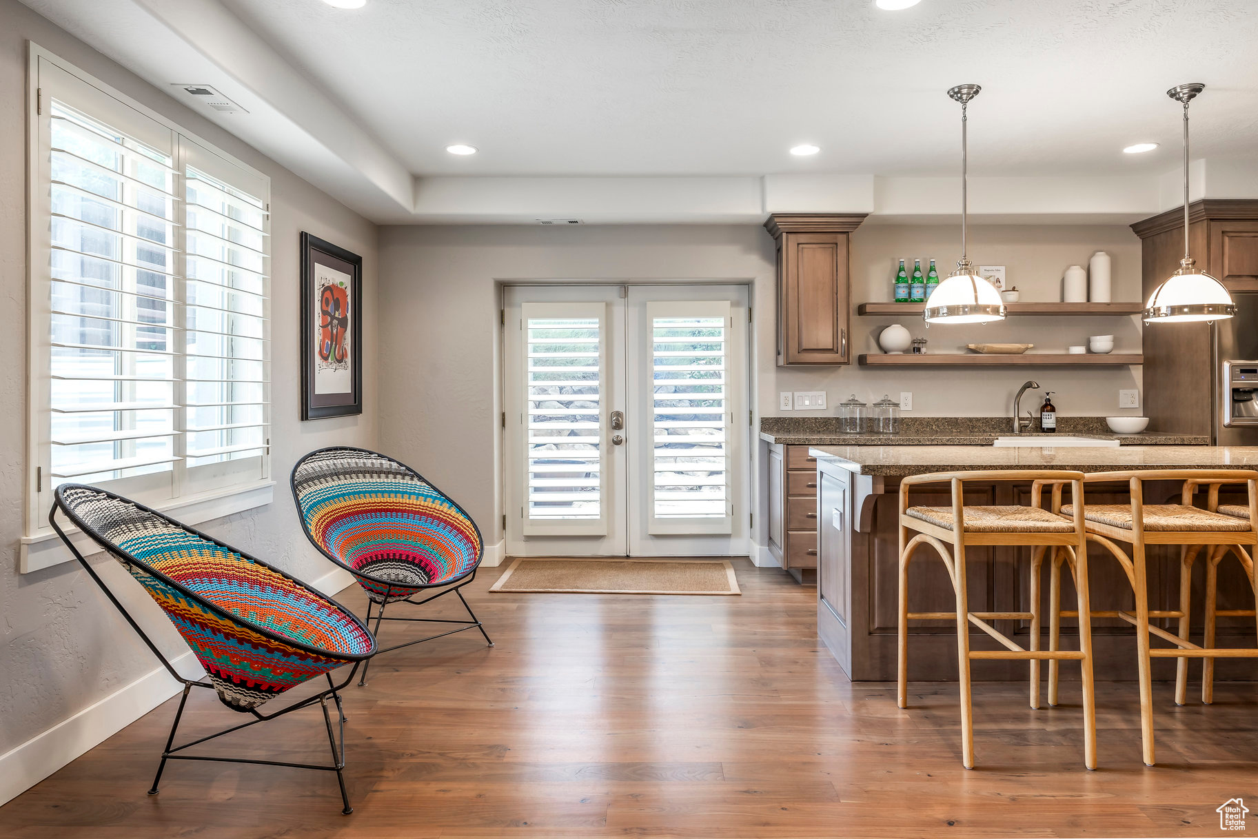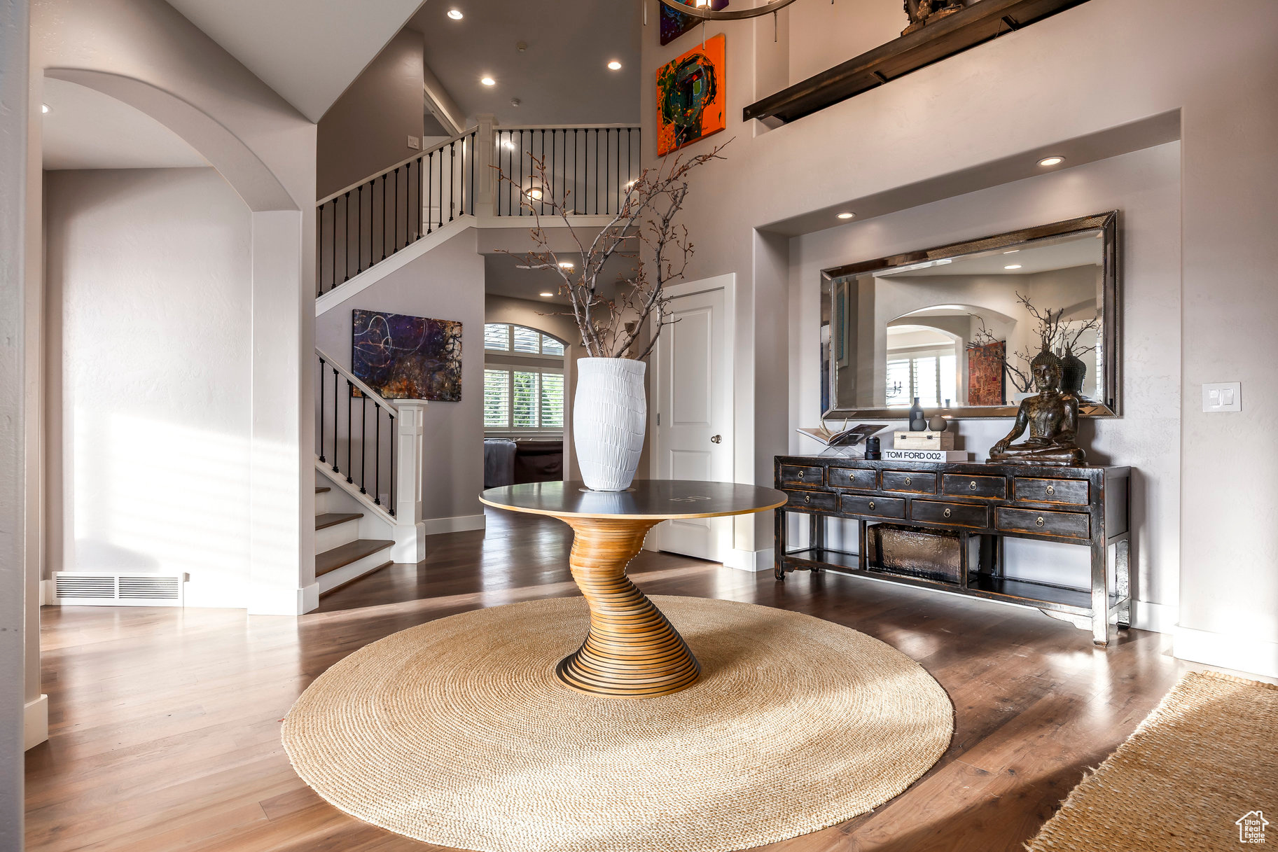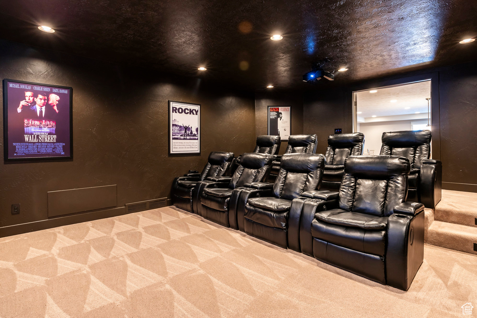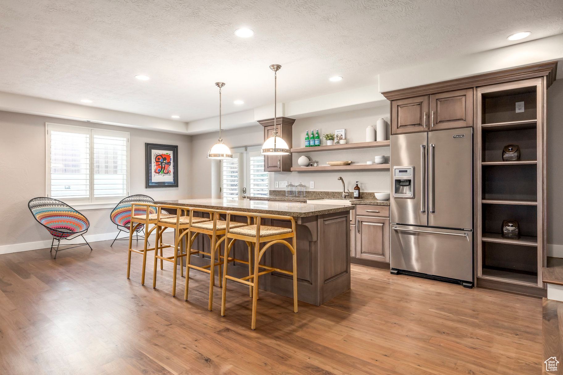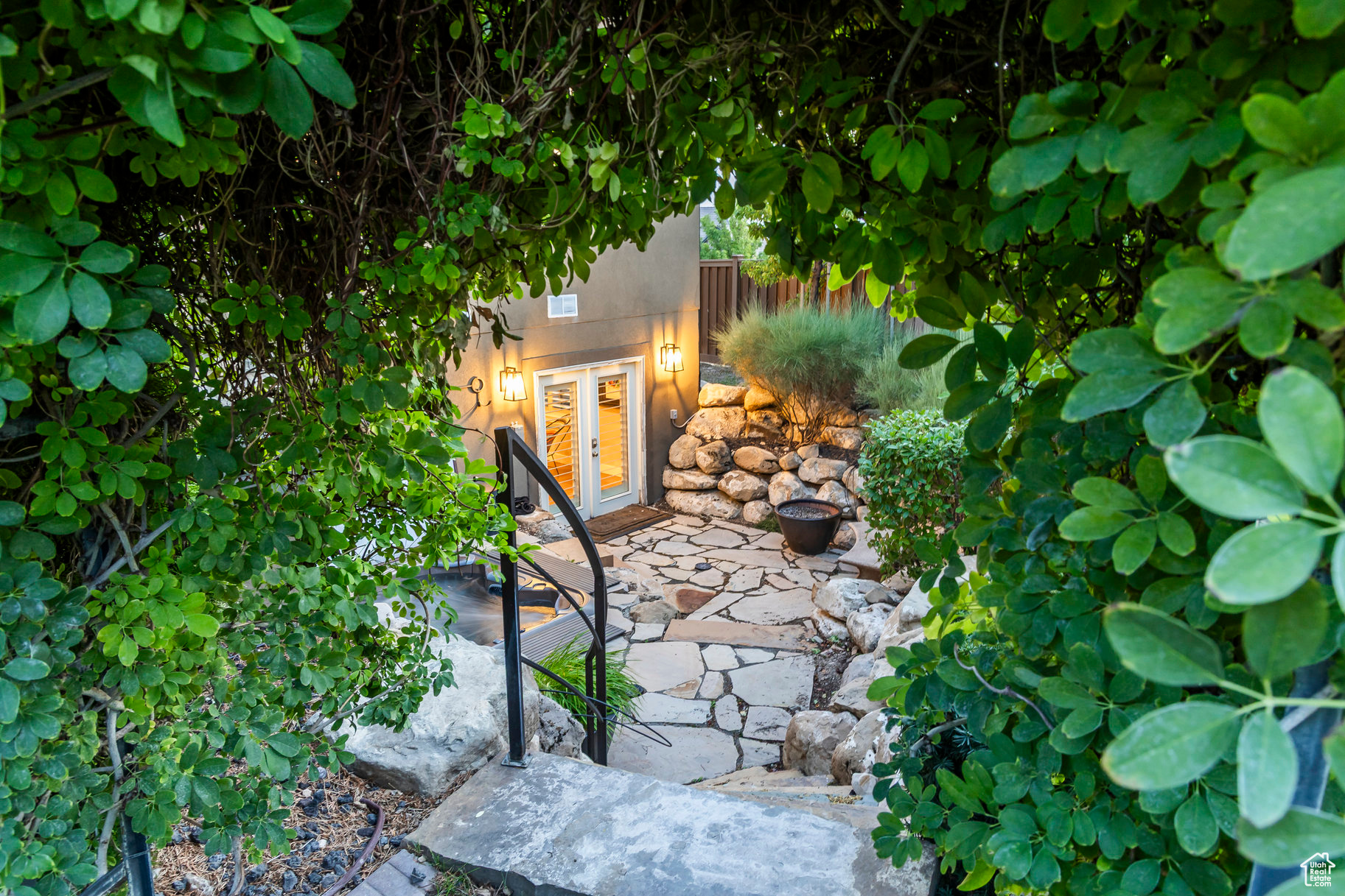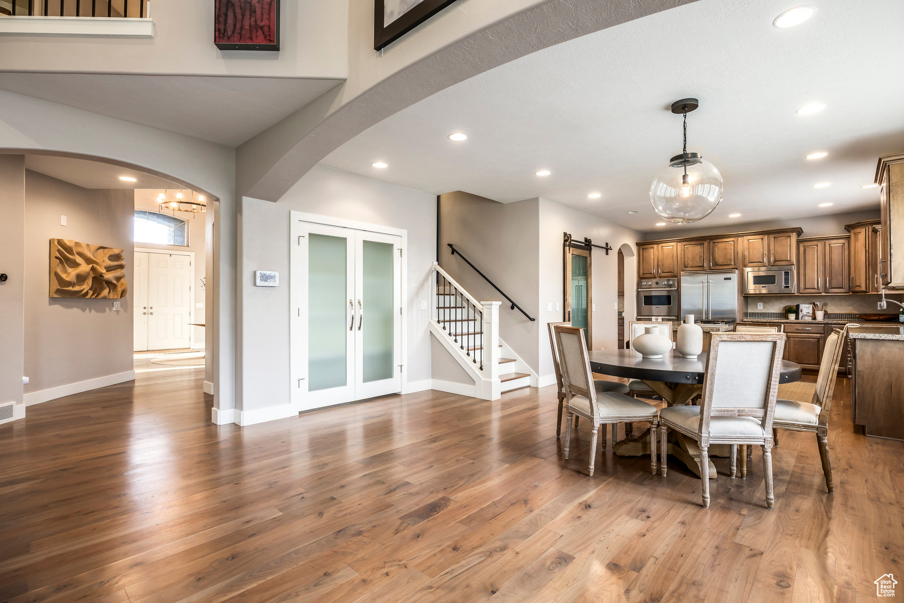 Tucked away in one of Lehi's most desirable neighborhoods, this exceptional residence is one of only four homes in a private cul-de-sac, offering sweeping mountain and valley views along the Traverse Mountain bench. From the moment you step inside, you're welcomed by the warmth of rich Walnut hardwood floors and a soaring double-height foyer that sets the stage for the home's blend of luxury and comfort. The open-concept living space flows seamlessly into a gourmet kitchen featuring Viking stainless steel appliances, double wall ovens, and an oversized granite island with striking iron accents. A custom wood, iron, and frosted-glass barn door conceals the pantry, merging style with function. Downstairs, the home transforms into a true entertainer's retreat. A full second kitchen-also equipped with Viking appliances-anchors the space, complemented by a guest suite, full bath, glass-enclosed steam shower, home gym, and a tiered theater room designed for unforgettable movie nights. Walkout French doors lead to an outdoor sanctuary with a natural stone patio, hot tub, trellis-covered deck, and a fully equipped outdoor kitchen with granite-topped BBQ station-perfect for hosting under the stars. The upper level is devoted to rest and rejuvenation. The primary suite offers a dual-sided fireplace, expansive "his & hers" walk-in closets, and a spa-inspired bathroom with dual vanities, soaking tub, glass shower, and private water closet. A spacious three-car garage completes the property, providing plenty of room for vehicles and outdoor gear. This rare offering combines elegance, comfort, and convenience-all within minutes of Silicon Slopes, shopping, dining, and outdoor recreation.