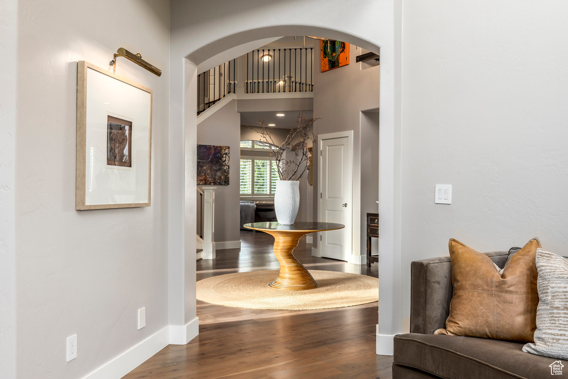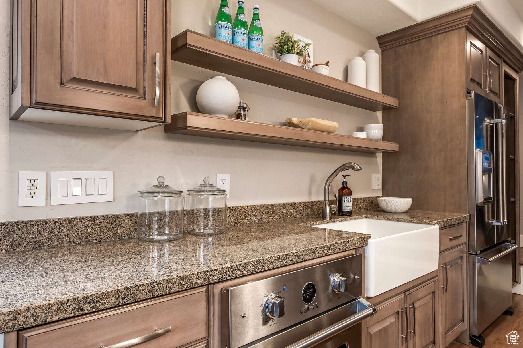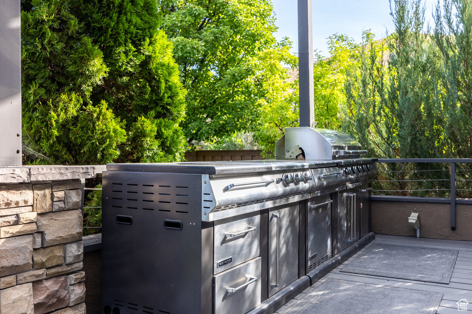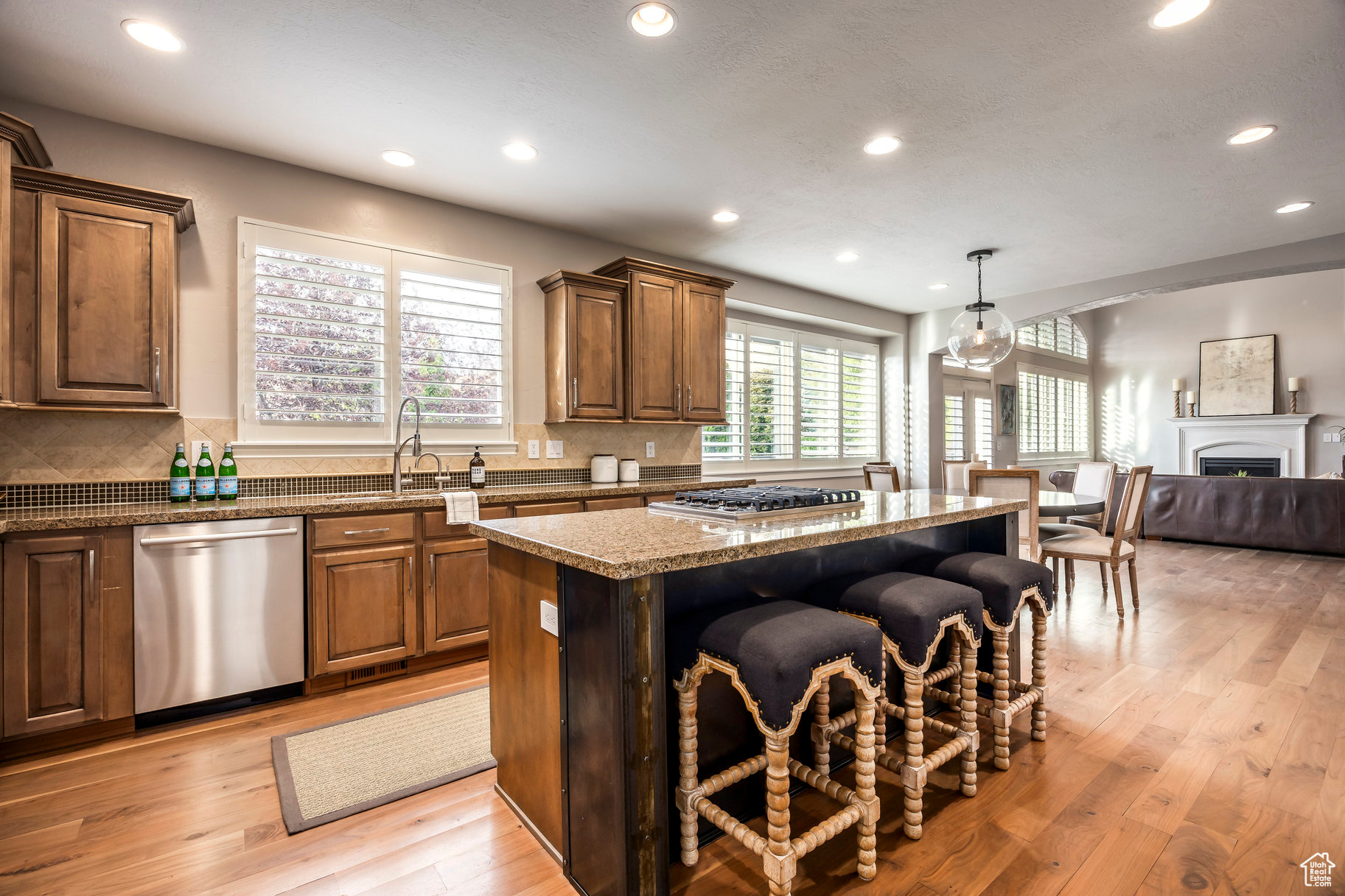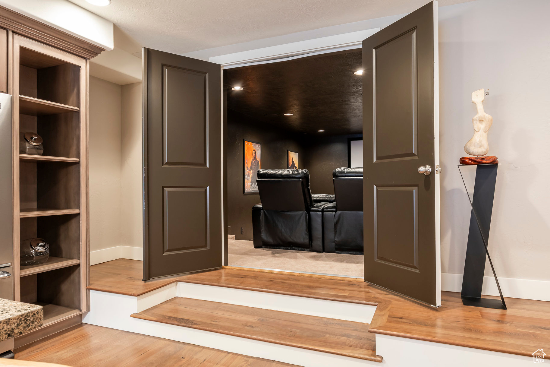 Tucked away in one of Lehi's most desirable neighborhoods, this exceptional residence is one of only four homes in a private cul-de-sac, offering sweeping mountain and valley views along the Traverse Mountain bench. From the moment you step inside, you're welcomed by the warmth of rich Walnut hardwood floors and a soaring double-height foyer that sets the stage for the home's blend of luxury and comfort. The open-concept living space flows seamlessly into a gourmet kitchen featuring Viking stainless steel appliances, double wall ovens, and an oversized granite island with striking iron accents. A custom wood, iron, and frosted-glass barn door conceals the pantry, merging style with function. Downstairs, the home transforms into a true entertainer's retreat. A full second kitchen-also equipped with Viking appliances-anchors the space, complemented by a guest suite, full bath, glass-enclosed steam shower, home gym, and a tiered theater room designed for unforgettable movie nights. Walkout French doors lead to an outdoor sanctuary with a natural stone patio, hot tub, trellis-covered deck, and a fully equipped outdoor kitchen with granite-topped BBQ station-perfect for hosting under the stars. The upper level is devoted to rest and rejuvenation. The primary suite offers a dual-sided fireplace, expansive "his & hers" walk-in closets, and a spa-inspired bathroom with dual vanities, soaking tub, glass shower, and private water closet. A spacious three-car garage completes the property, providing plenty of room for vehicles and outdoor gear. This rare offering combines elegance, comfort, and convenience-all within minutes of Silicon Slopes, shopping, dining, and outdoor recreation.