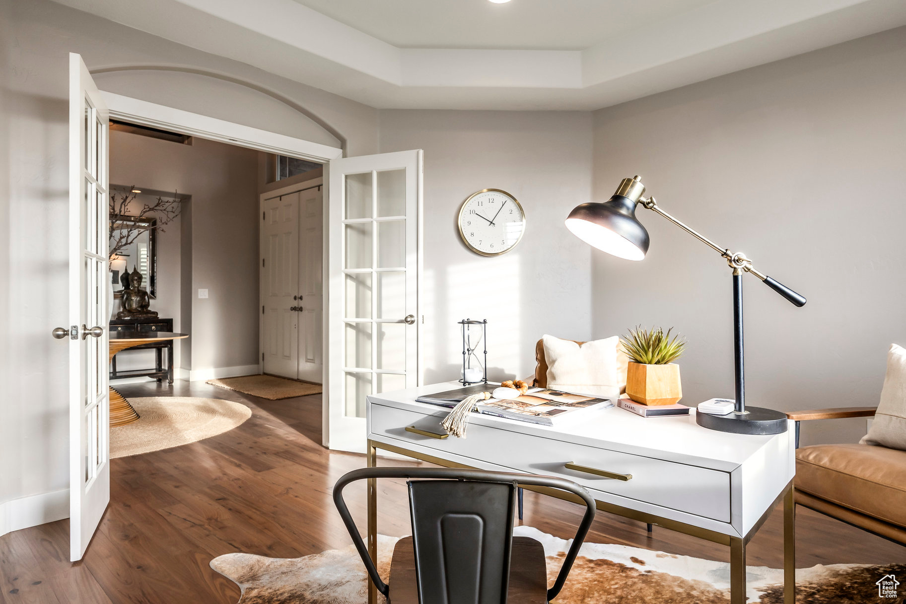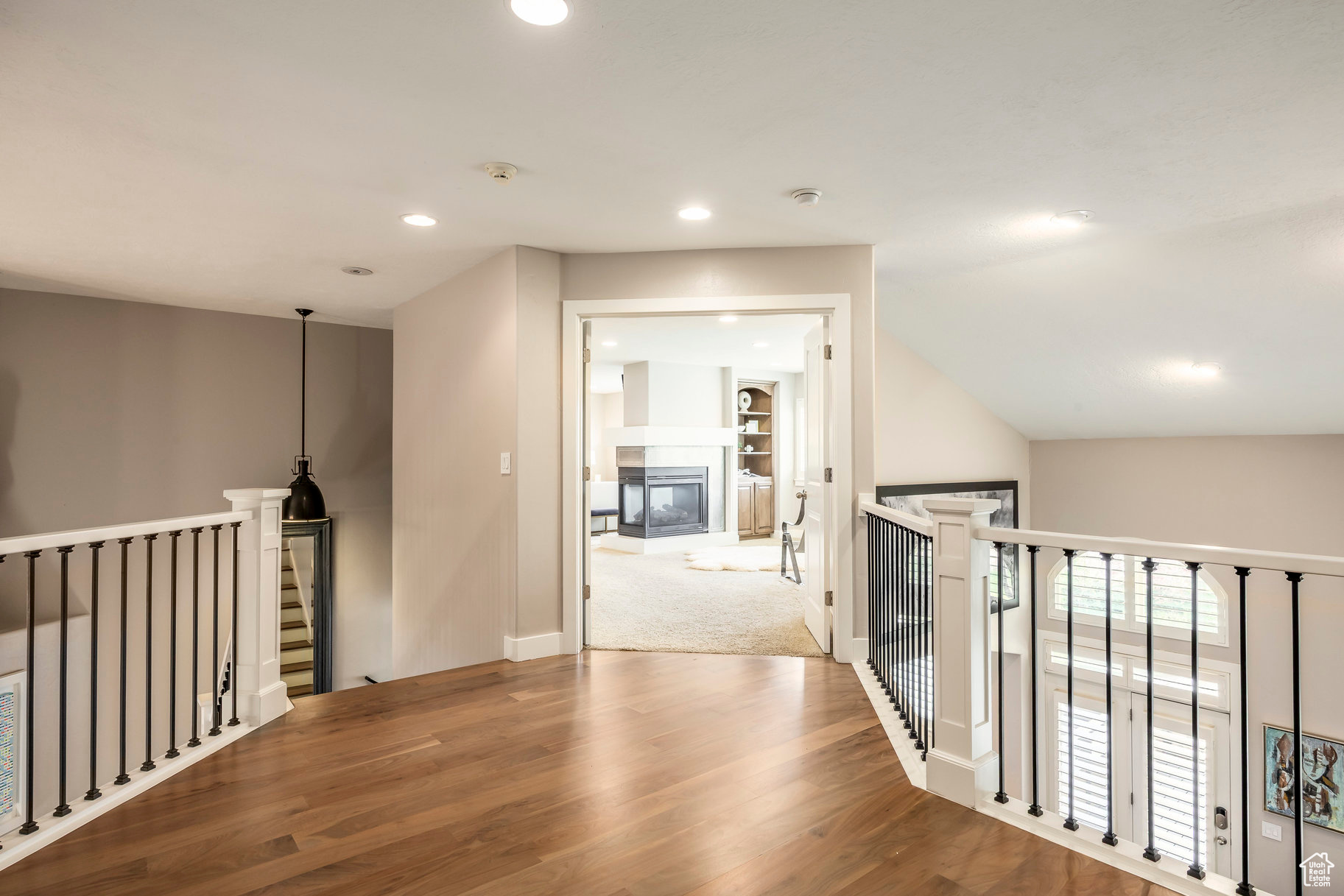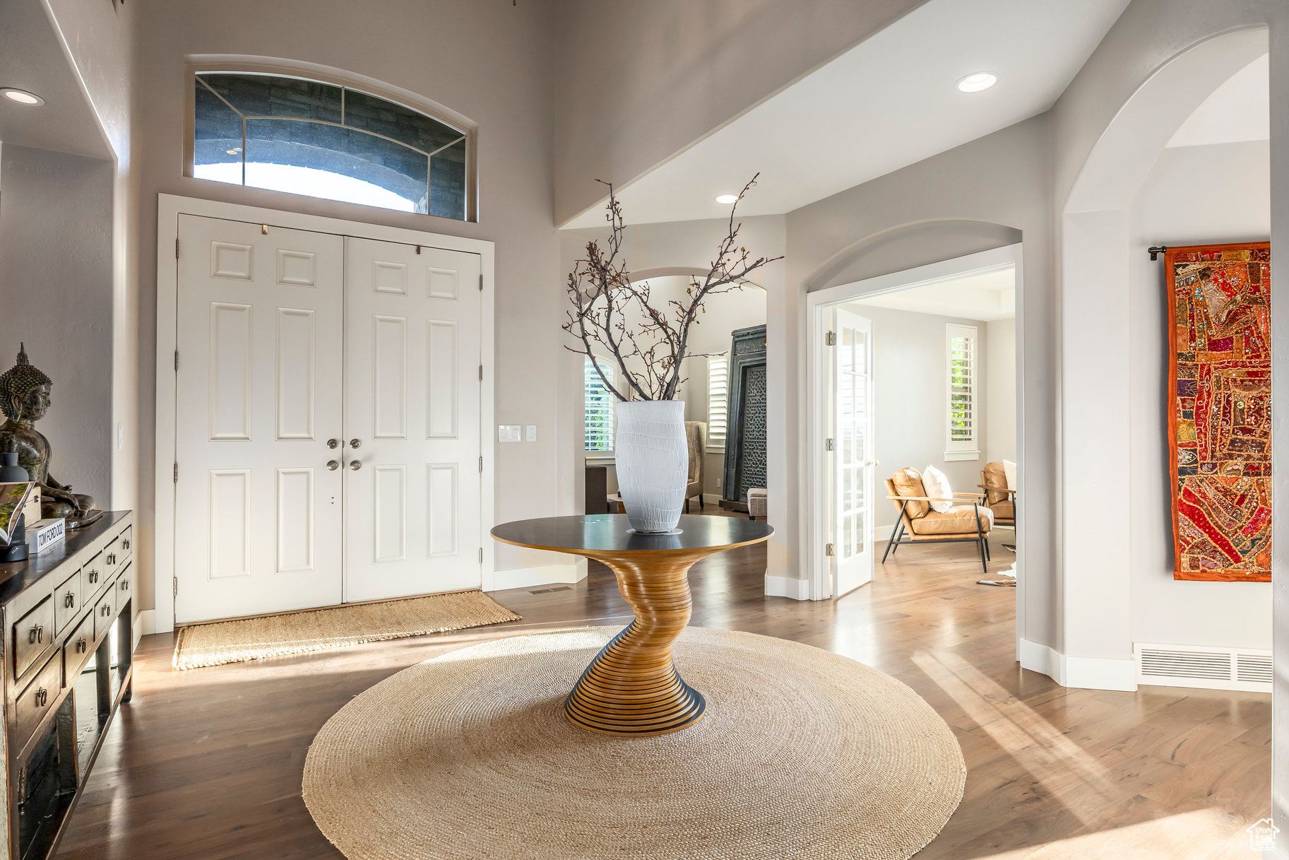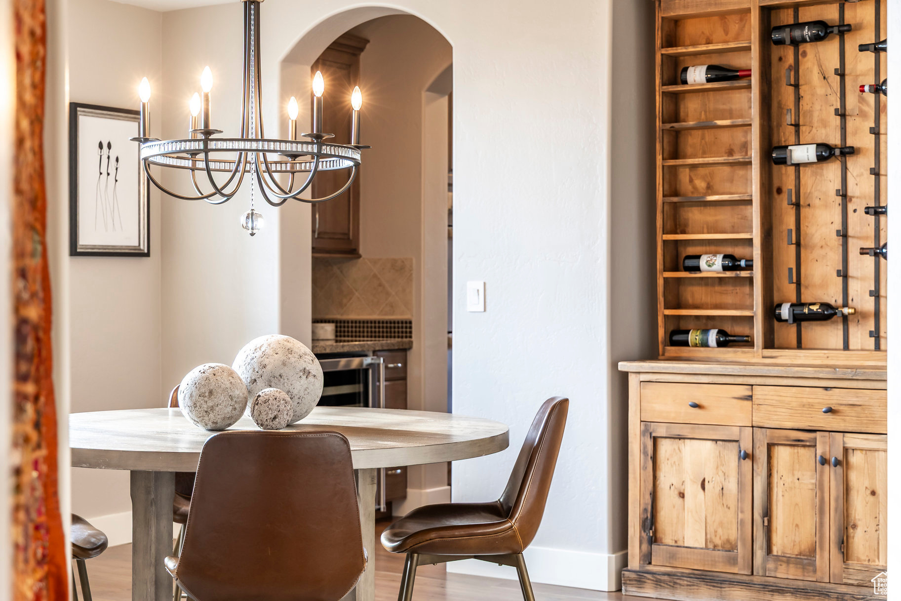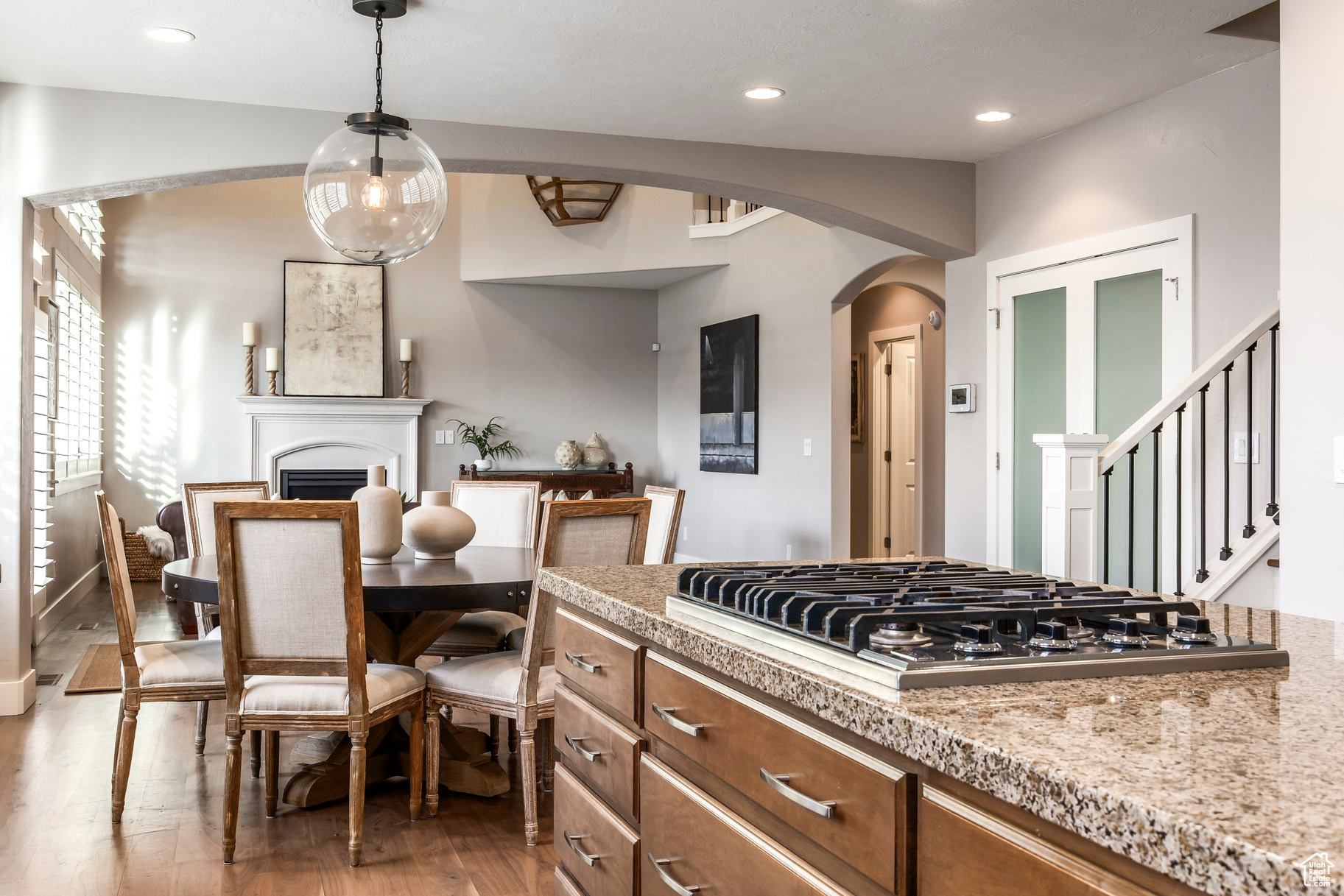 Tucked away in one of Lehi's most desirable neighborhoods, this exceptional residence is one of only four homes in a private cul-de-sac, offering sweeping mountain and valley views along the Traverse Mountain bench. From the moment you step inside, you're welcomed by the warmth of rich Walnut hardwood floors and a soaring double-height foyer that sets the stage for the home's blend of luxury and comfort. The open-concept living space flows seamlessly into a gourmet kitchen featuring Viking stainless steel appliances, double wall ovens, and an oversized granite island with striking iron accents. A custom wood, iron, and frosted-glass barn door conceals the pantry, merging style with function. Downstairs, the home transforms into a true entertainer's retreat. A full second kitchen-also equipped with Viking appliances-anchors the space, complemented by a guest suite, full bath, glass-enclosed steam shower, home gym, and a tiered theater room designed for unforgettable movie nights. Walkout French doors lead to an outdoor sanctuary with a natural stone patio, hot tub, trellis-covered deck, and a fully equipped outdoor kitchen with granite-topped BBQ station-perfect for hosting under the stars. The upper level is devoted to rest and rejuvenation. The primary suite offers a dual-sided fireplace, expansive "his & hers" walk-in closets, and a spa-inspired bathroom with dual vanities, soaking tub, glass shower, and private water closet. A spacious three-car garage completes the property, providing plenty of room for vehicles and outdoor gear. This rare offering combines elegance, comfort, and convenience-all within minutes of Silicon Slopes, shopping, dining, and outdoor recreation.