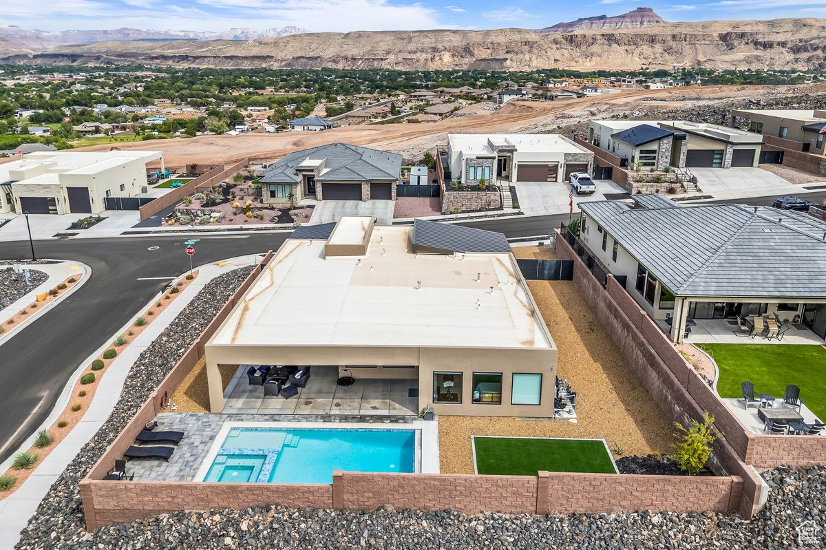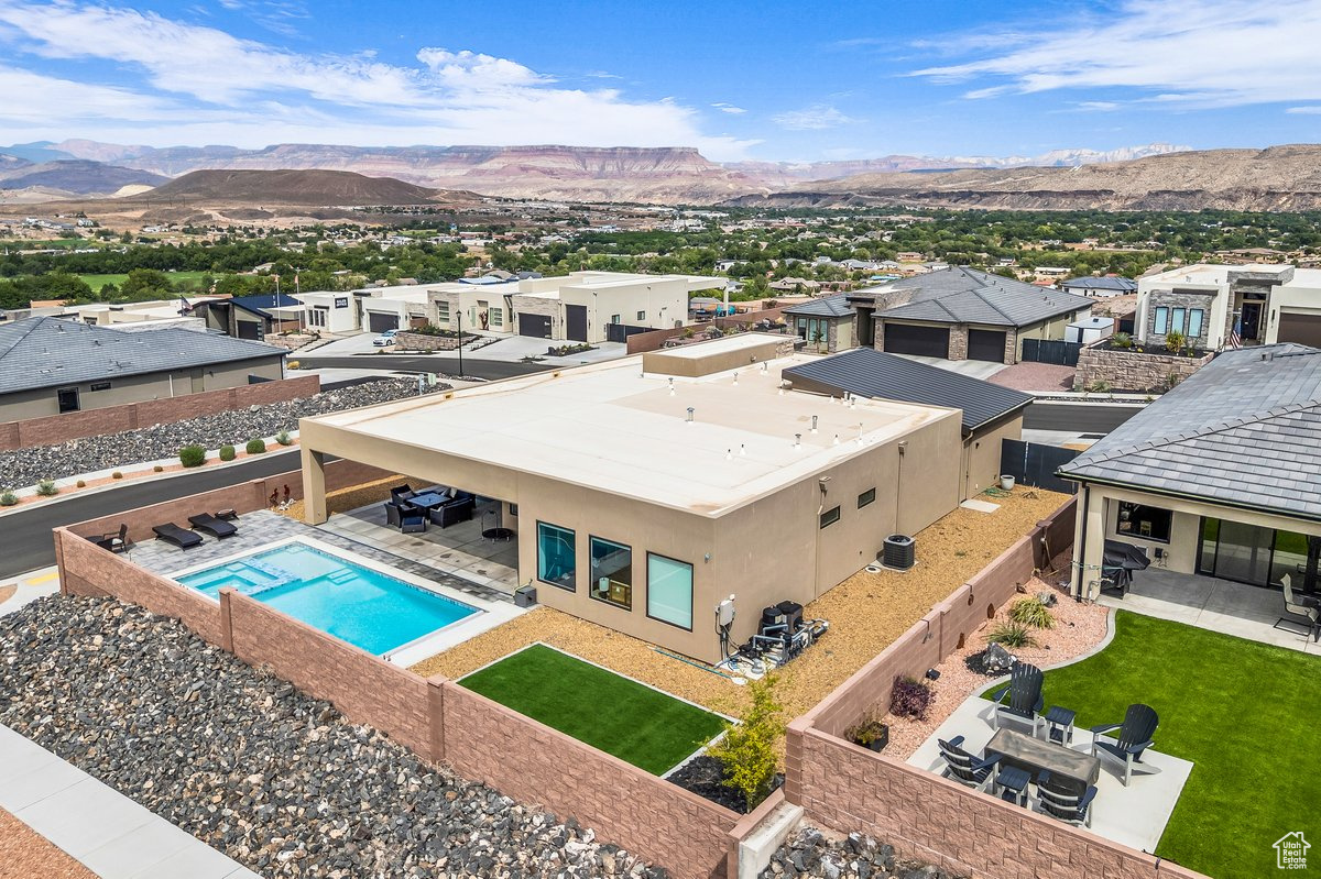 This former builder model home is a showstopper with high-end finishes, perfectly situated on a corner lot with unmatched privacy, a sparkling pool/spa, and a full attached casita. From the living room to the primary suite, the killer 270-degree views of Pine Valley, the red rocks, and even Zion National Park are truly unforgettable. Designer-grade upgrades throughout ensure both style and comfort, starting with an 8-ft metal door entrance and soaring 12-ft ceilings. The gourmet kitchen features Thermador appliances, thick-cut quartz countertops, and a massive hidden walk-in pantry. The primary suite is a true retreat with powered window coverings, a spacious soaker tub, walk-in shower, and a huge master closet. The casita includes its own kitchenette, stackable washer/dryer, and a large walk-in shower, making it perfect for guests or multigenerational living. Outside, the backyard is an entertainer's dream offering a huge, covered patio, pool/spa, and those unbeatable views. The oversized, extra-deep garage could fit 3.5 cars, with additional RV parking and hookups on the side, blending luxury and comfort in one unforgettable package. Buyer to verify all information, deemed reliable, however buyer to verify all info including utilities, rental restrictions, and HOA information if applicable.
