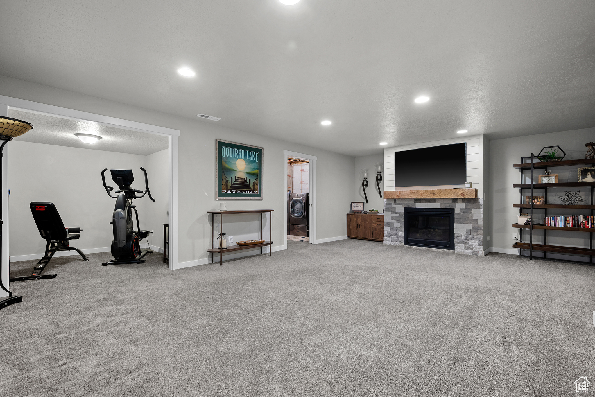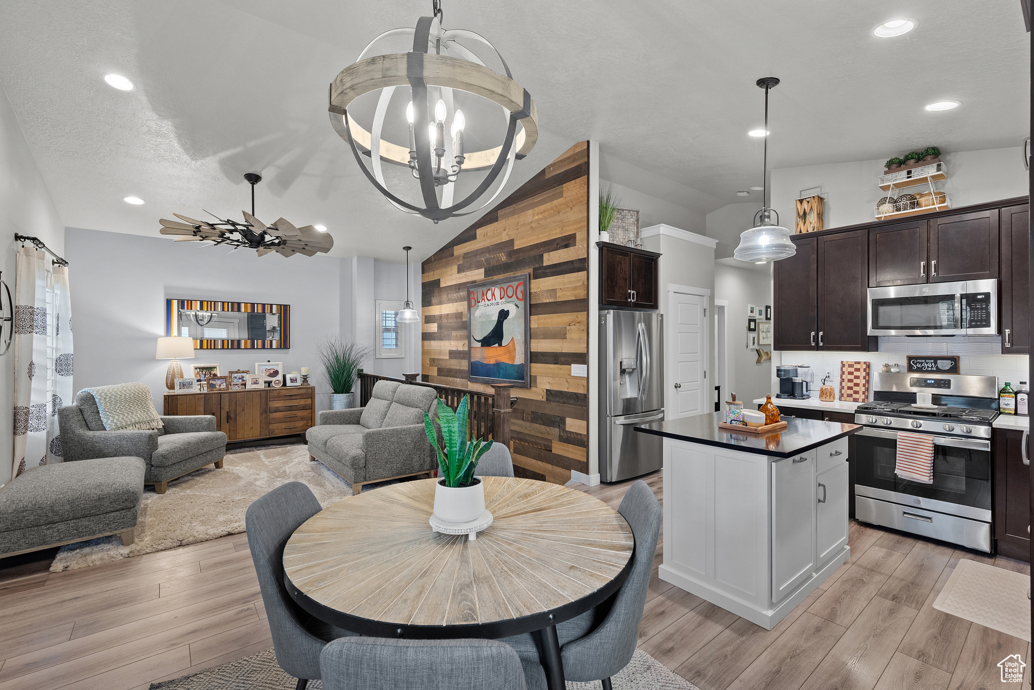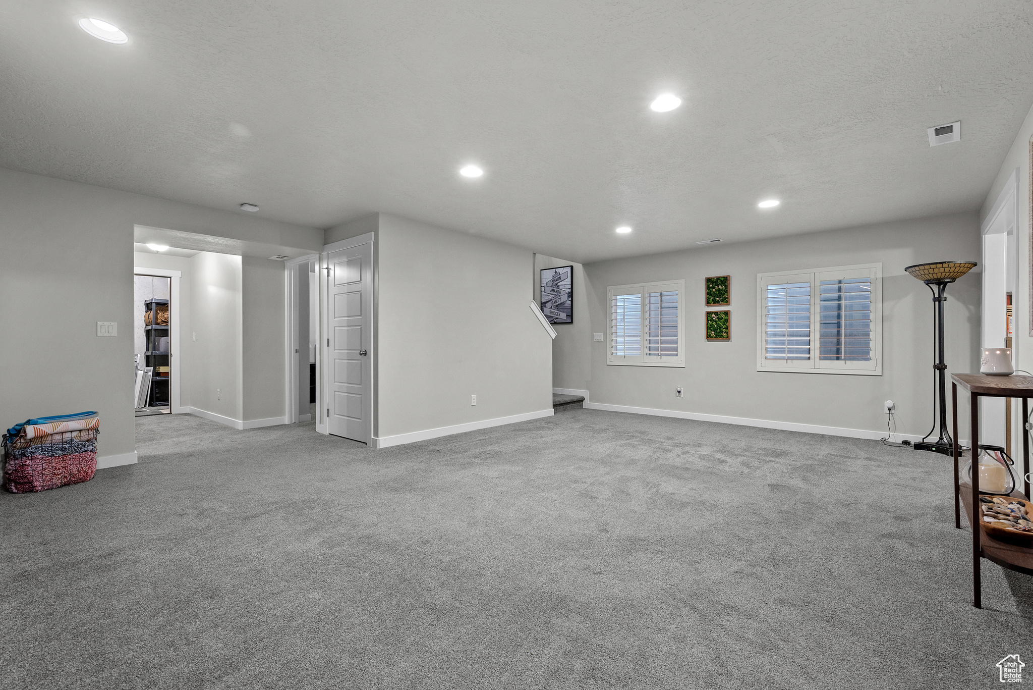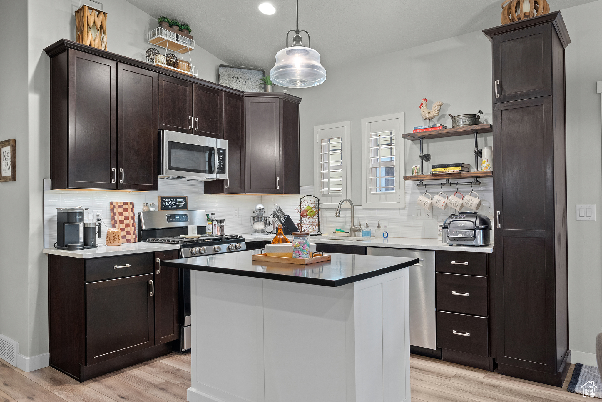 MOTIVATED SELLER! PRICE IMPROVEMENT! WELCOME TO THIS STUNNING RAMBLER!. Located in one of Daybreak's most sought-after neighborhoods. This well-maintained, one-owner home features 3 bedrooms and 3 bathrooms, with thoughtful upgrades throughout. The spacious kitchen has a beautiful island with hidden pull outs for trash. All bottom kitchen shelves slide out for each access. The kitchen and bathrooms are finished with quartz countertops, while the master suite offers a large walk-in shower. The main living area showcases wood-grained tile flooring, a wood-paneled accent wall, and a stylish farmhouse ceiling fan. Recessed lighting and upgraded fixtures brighten both the main level and basement. The basement includes the third bedroom and bathroom as well as large family room with a cozy gas fireplace, as well as an expansive storage room that runs the length of the home under the porch. Outside, enjoy a private fenced yard with French doors leading to a 40-foot-stained concrete patio and grass area-perfect for relaxing or entertaining. Additional highlights include; Extended garage with 4 extra feet of space and ceiling storage rack, Newly installed water softener, high grade shutter throughout entire home, wood grained staircase. Home is ideally located within walking distance to dog park, firepit park, playground, scenic walking/running trails and Daybreak Lake. The new Bees stadium, Megaplex Theatre, and great dining options are walking distance as well, only a few blocks away The HOA includes access to several community amenities throughout, including internet, snow removal, lake access, pools, parks, and more. Don't miss this rare opportunity to own a home that combines style, comfort, and an unbeatable location!