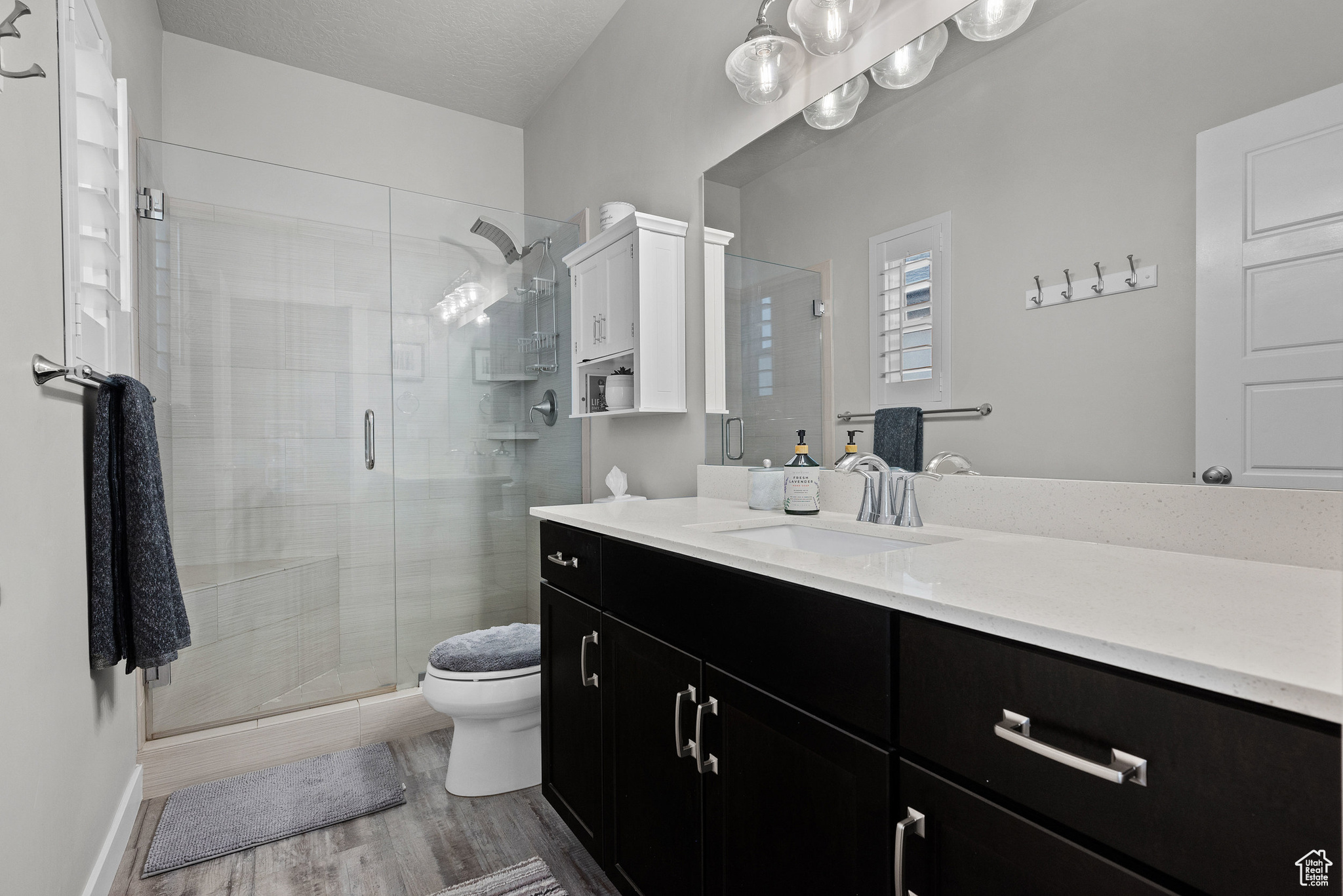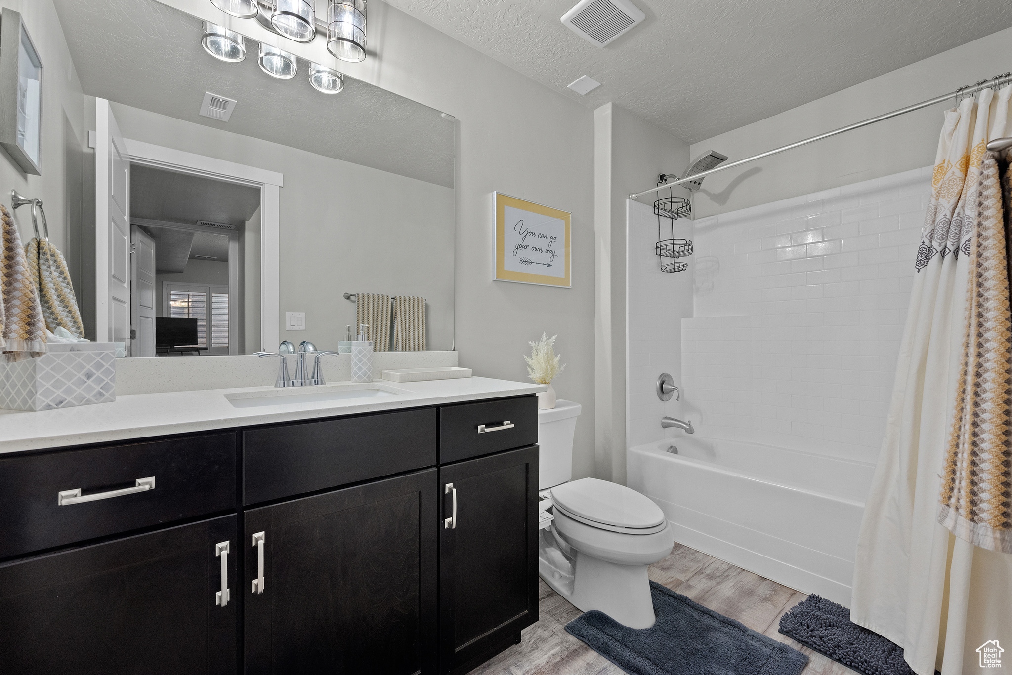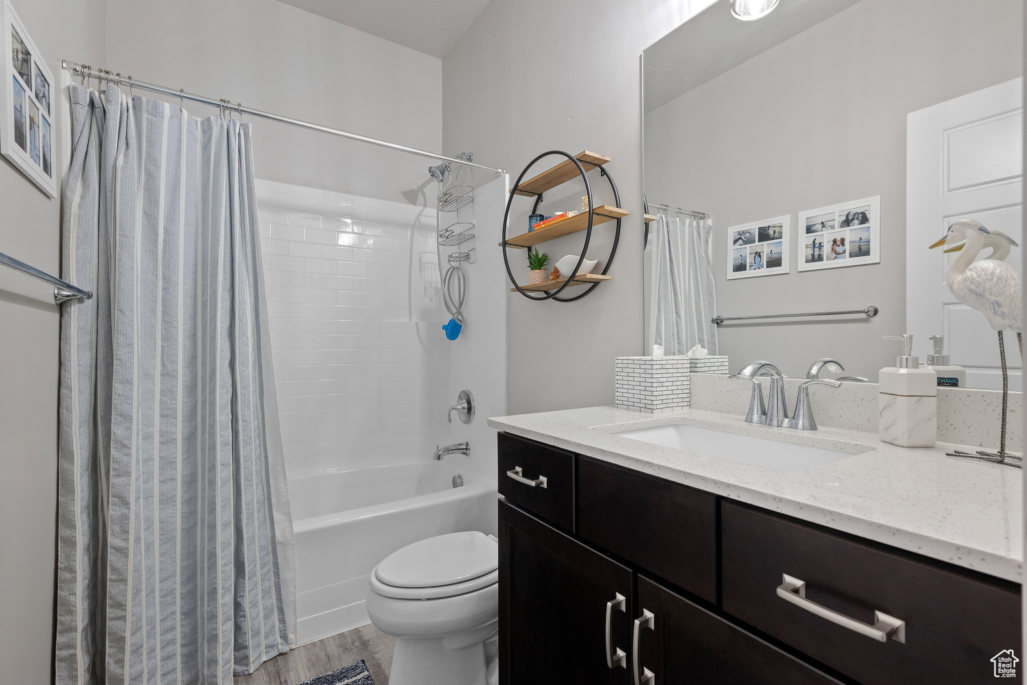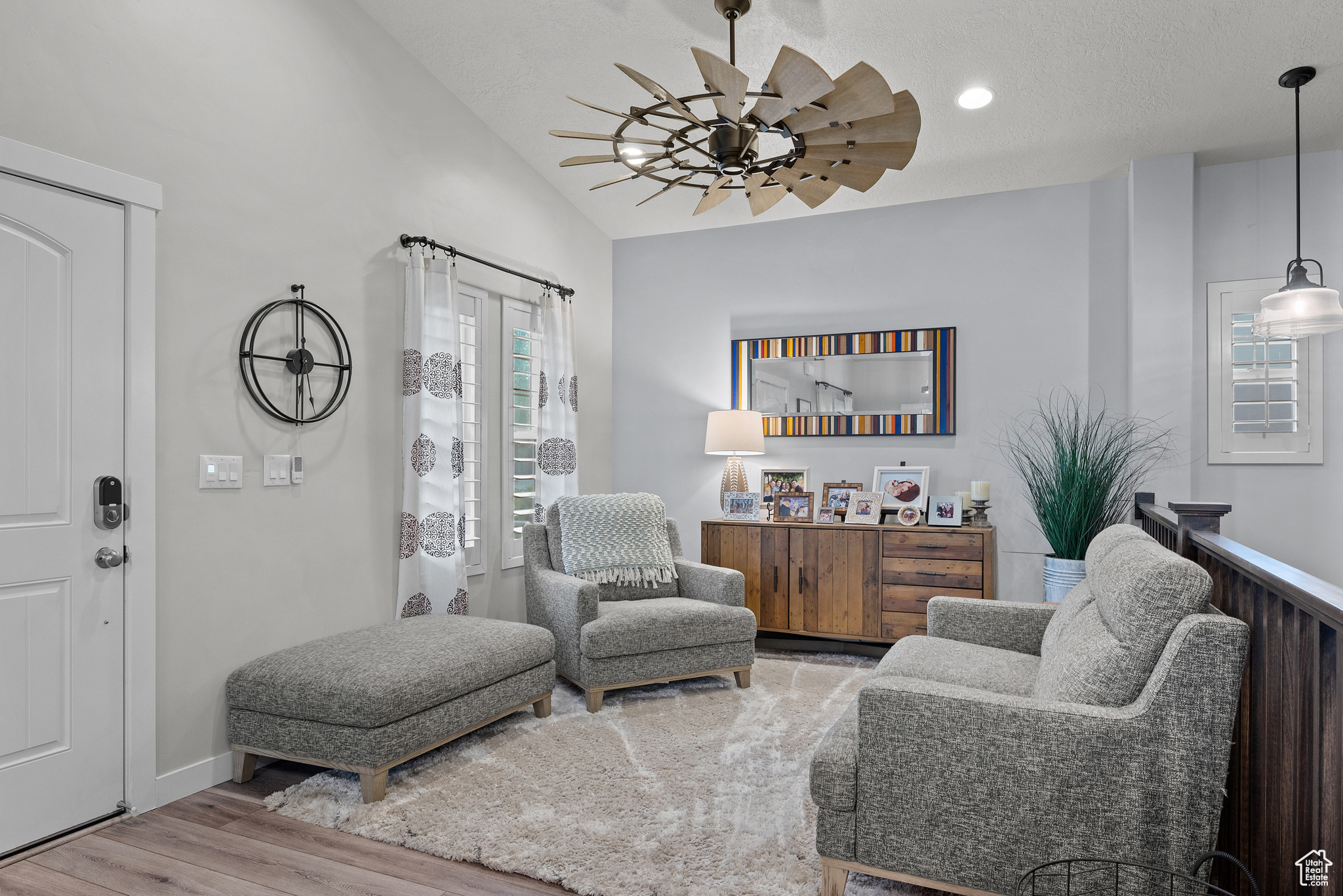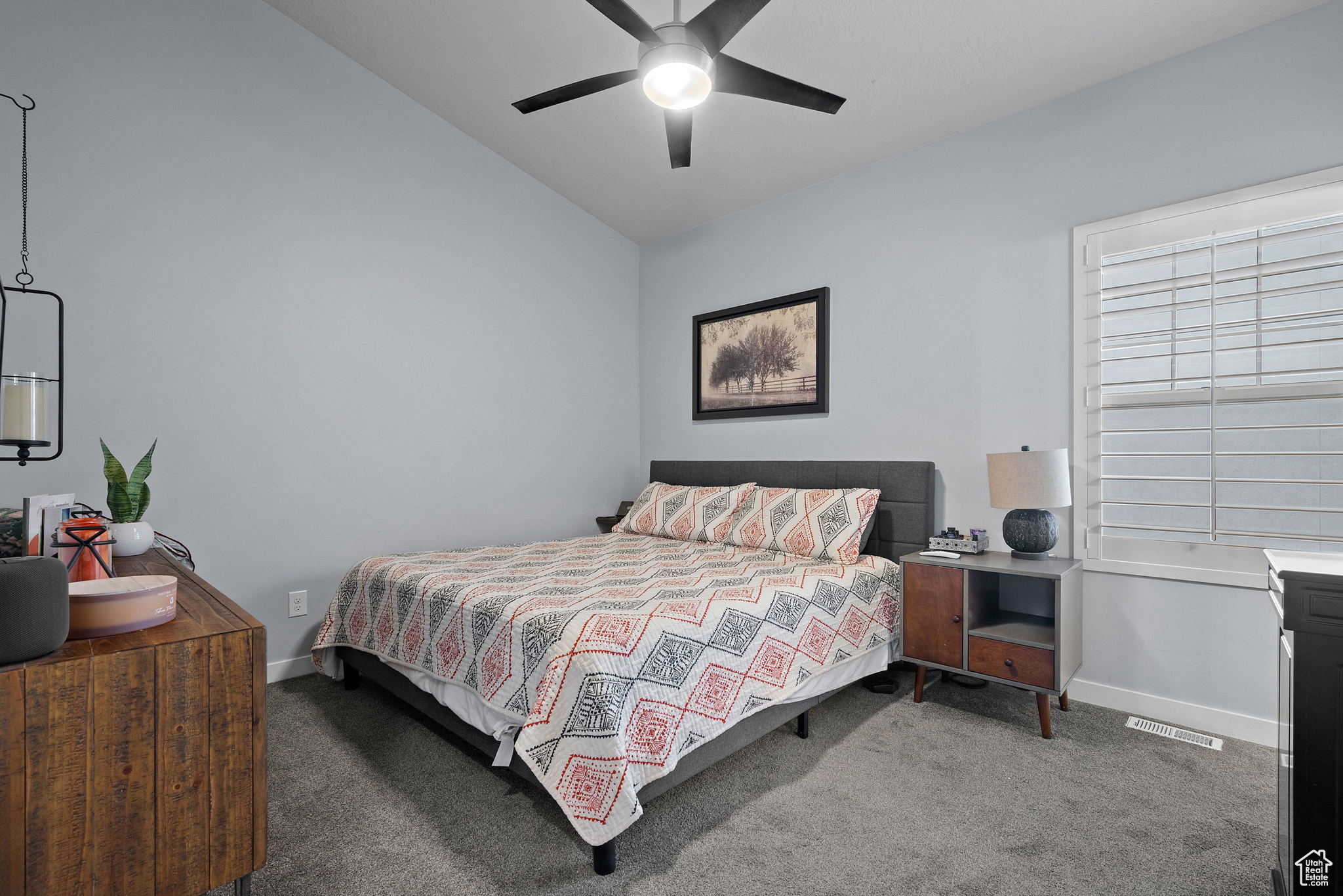 MOTIVATED SELLER! PRICE IMPROVEMENT! WELCOME TO THIS STUNNING RAMBLER!. Located in one of Daybreak's most sought-after neighborhoods. This well-maintained, one-owner home features 3 bedrooms and 3 bathrooms, with thoughtful upgrades throughout. The spacious kitchen has a beautiful island with hidden pull outs for trash. All bottom kitchen shelves slide out for each access. The kitchen and bathrooms are finished with quartz countertops, while the master suite offers a large walk-in shower. The main living area showcases wood-grained tile flooring, a wood-paneled accent wall, and a stylish farmhouse ceiling fan. Recessed lighting and upgraded fixtures brighten both the main level and basement. The basement includes the third bedroom and bathroom as well as large family room with a cozy gas fireplace, as well as an expansive storage room that runs the length of the home under the porch. Outside, enjoy a private fenced yard with French doors leading to a 40-foot-stained concrete patio and grass area-perfect for relaxing or entertaining. Additional highlights include; Extended garage with 4 extra feet of space and ceiling storage rack, Newly installed water softener, high grade shutter throughout entire home, wood grained staircase. Home is ideally located within walking distance to dog park, firepit park, playground, scenic walking/running trails and Daybreak Lake. The new Bees stadium, Megaplex Theatre, and great dining options are walking distance as well, only a few blocks away The HOA includes access to several community amenities throughout, including internet, snow removal, lake access, pools, parks, and more. Don't miss this rare opportunity to own a home that combines style, comfort, and an unbeatable location!