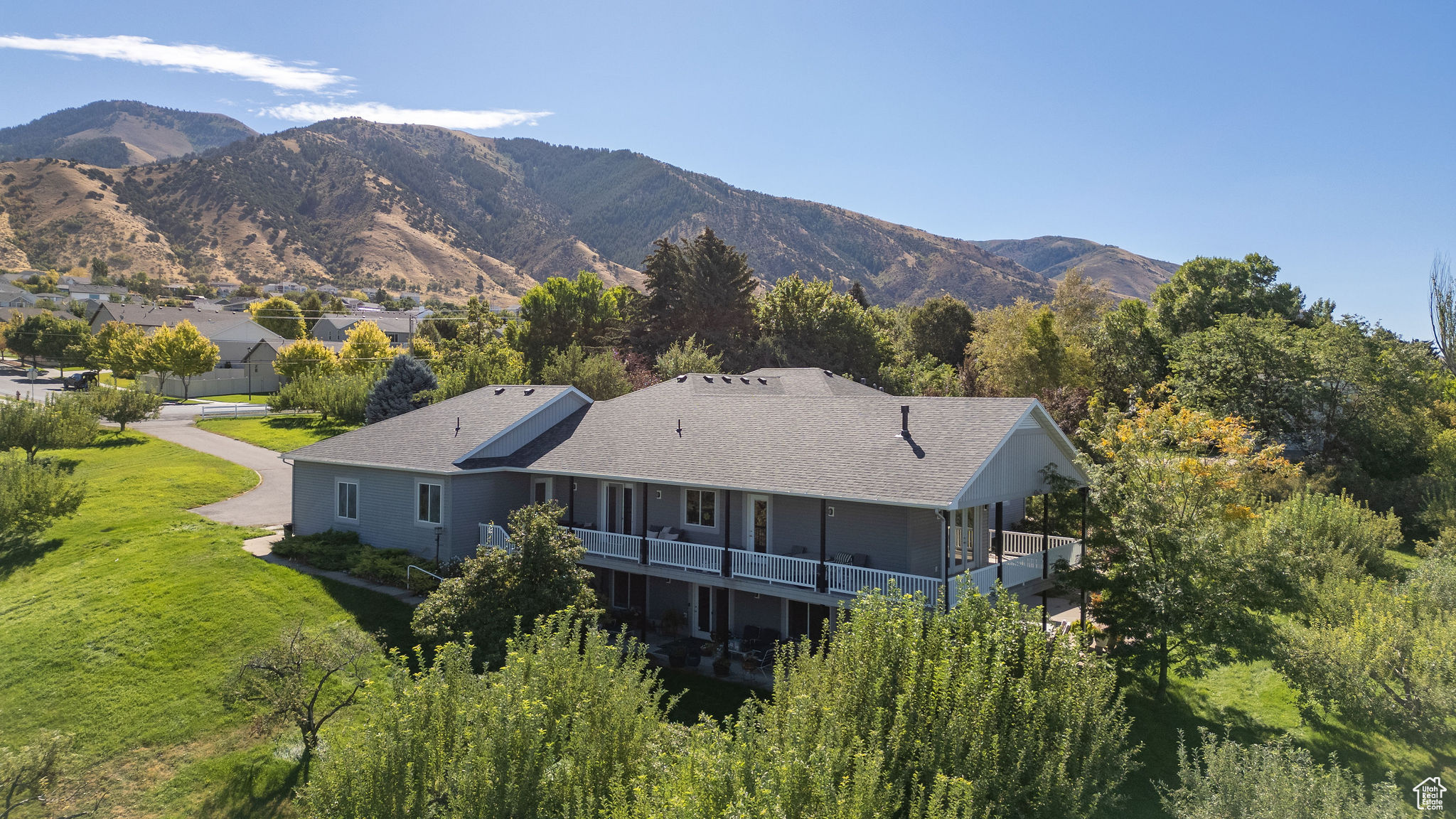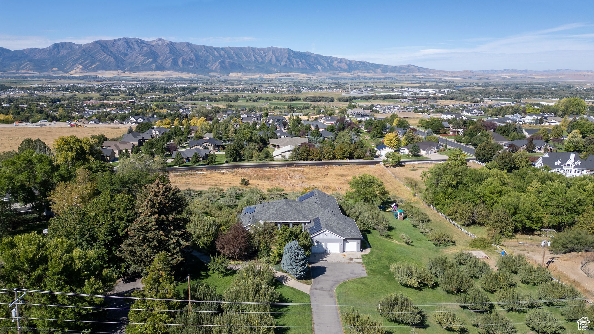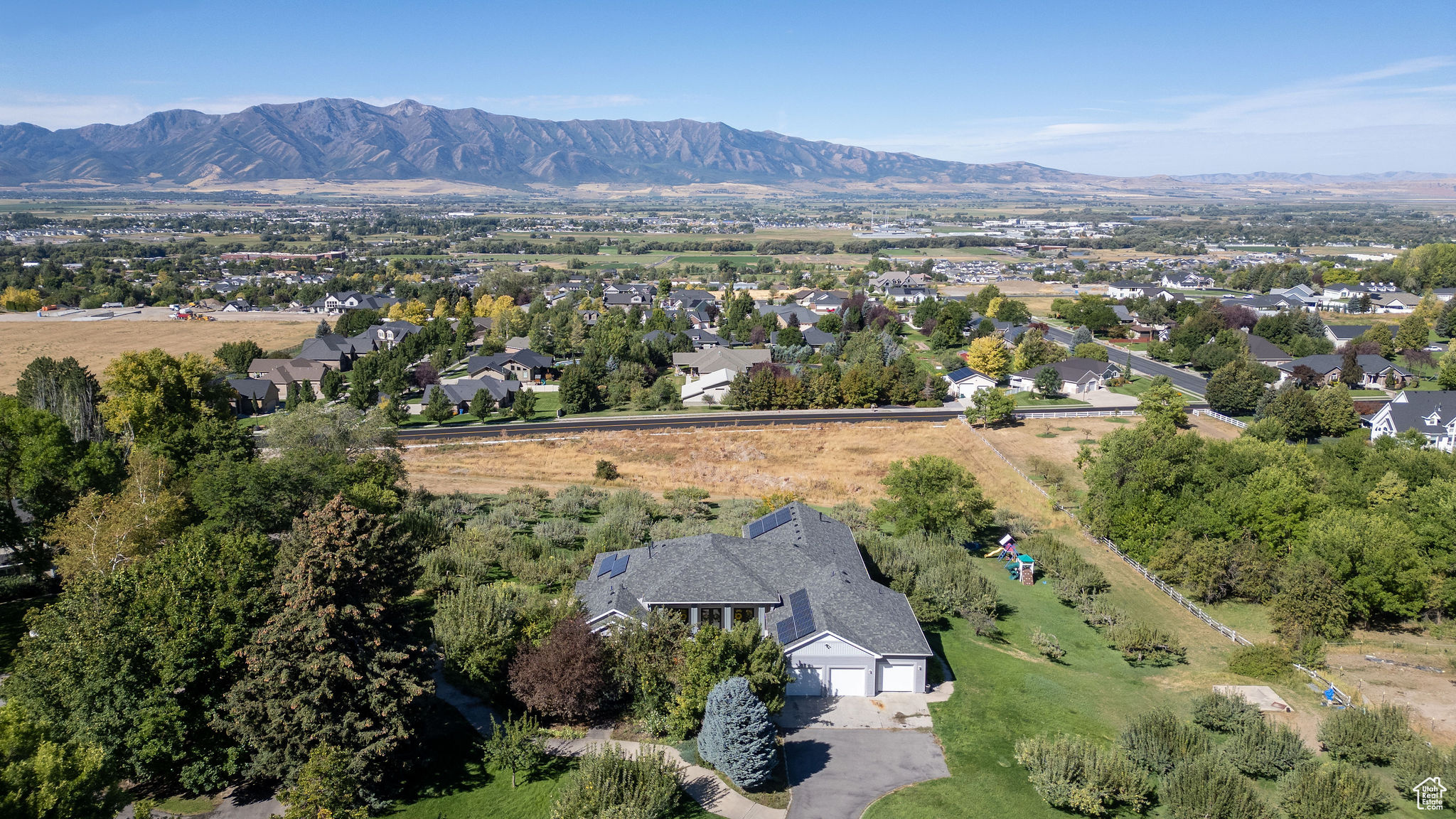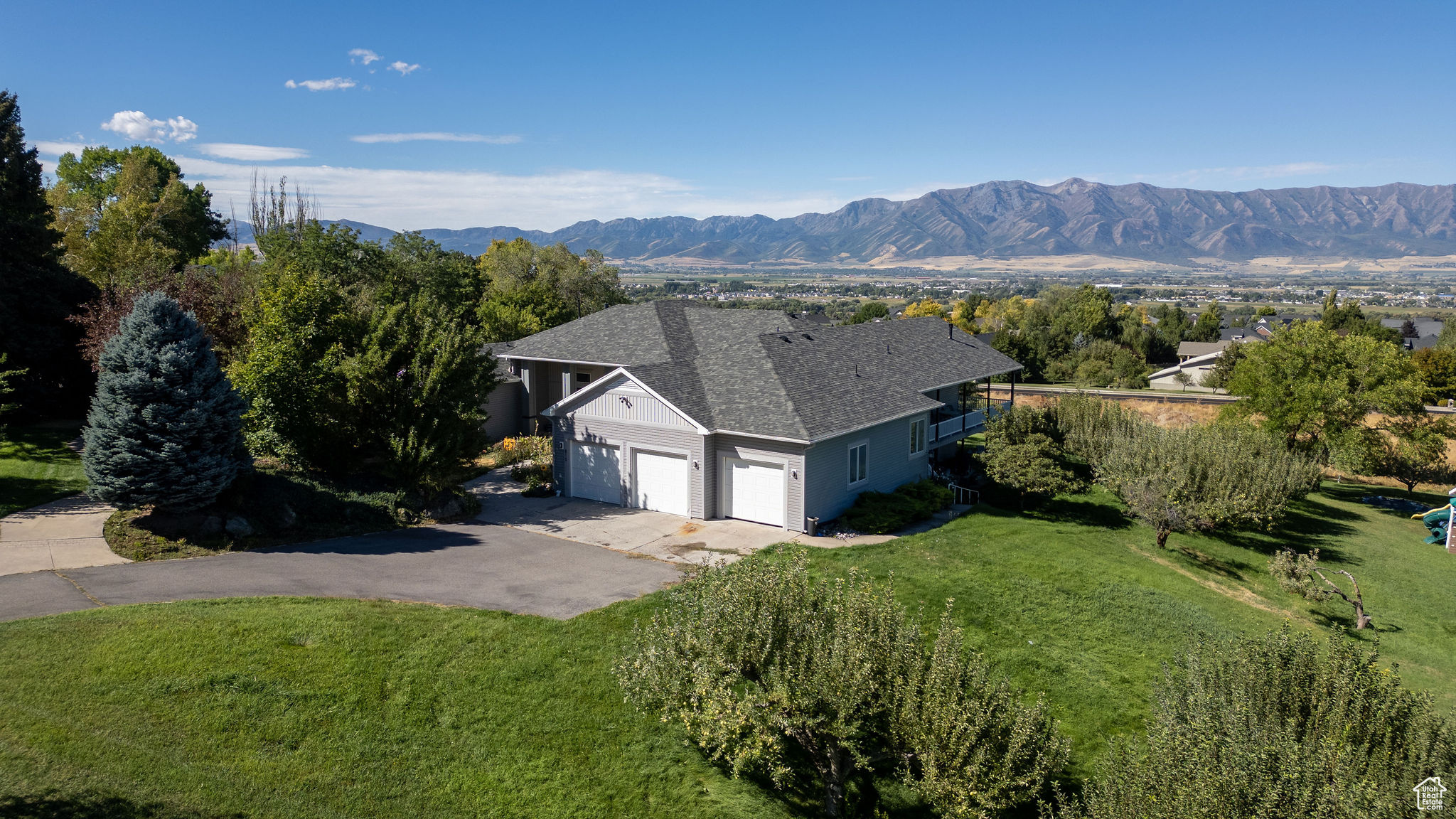 Situated on 2.96 acres on the Providence bench, this property offers panoramic views of the Wellsville Mountains. The spacious home features a timeless design and multiple living areas. The main floor has a large primary suite complete with a walk-in closet, soaking tub, walk-in shower, and ample storage. An additional main-level bedroom provides flexibility as a guest room or library. There is an oversized 3-car garage that leads to a half bath and a laundry/craft room. Relaxation is easy in the formal living and dining rooms, while the expansive kitchen-featuring a wrap-around granite countertop-opens into another large family room with a fireplace. The daylight basement offers even more space, with a full kitchen, family room, formal living room, and three additional bedrooms, making it ideal for multi-generational living or hosting guests. Outdoor living is impressive. A wrap-around deck overlooks the property's apple orchard, and lower-level patios provide multiple areas for gatherings, entertaining, or simply enjoying the scenery. With plentiful water to maintain the orchard and grounds, this property blends natural beauty with everyday convenience. Don't miss the chance to own this rare Providence bench retreat with space, views, and amenities that are second to none.
