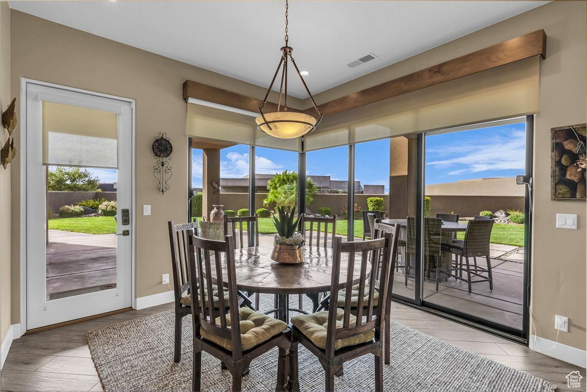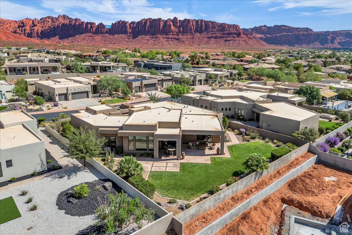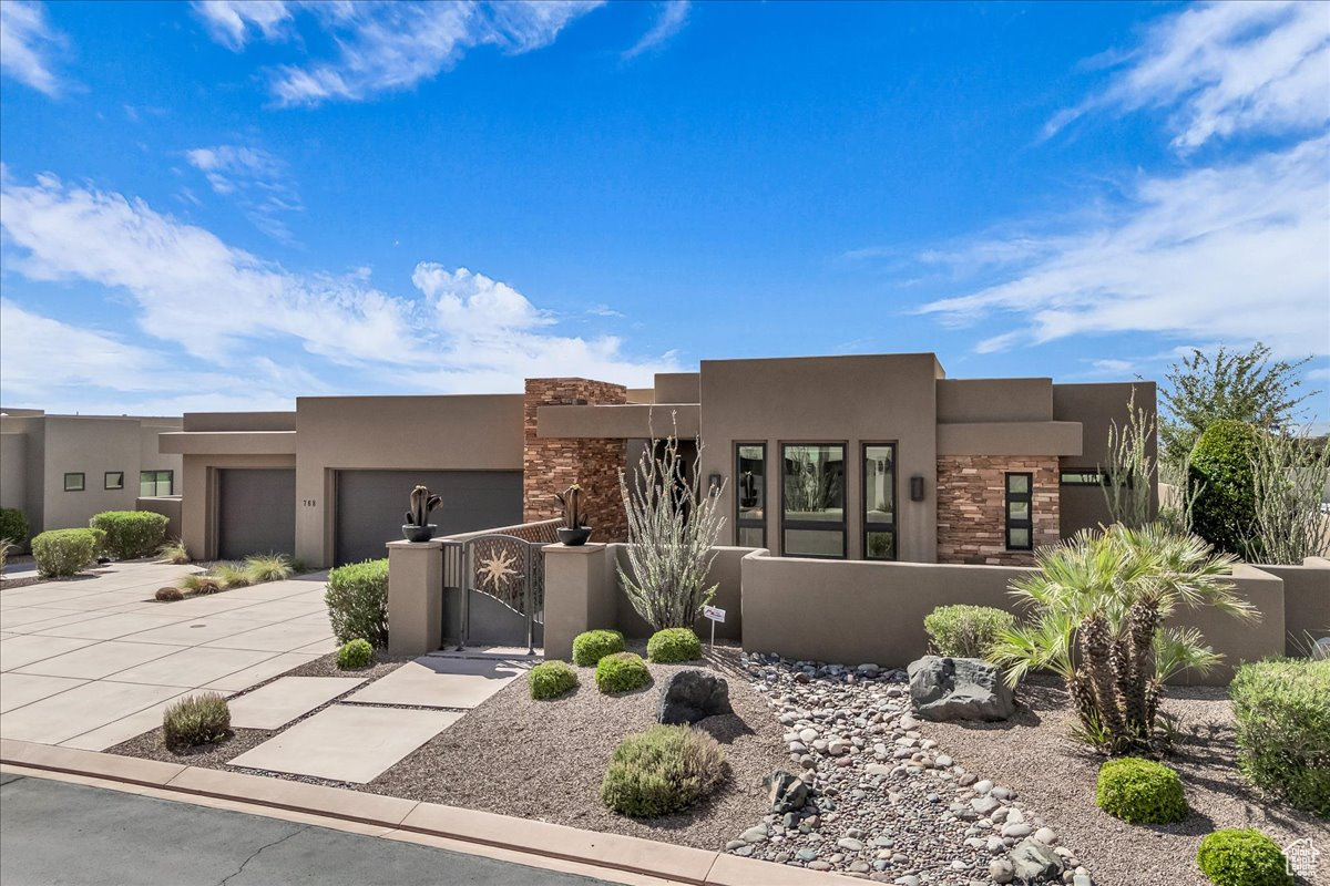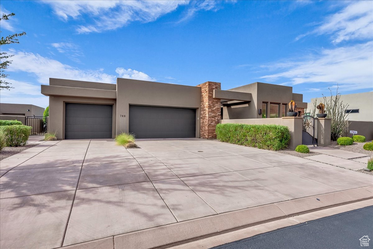 Welcome to your private sanctuary in the prestigious gated community of Palisades at Snow Canyon, embraced by the breathtaking backdrop of Red Mountain. This spacious 4-bedroom residence boasts soaring 10- and 13-foot ceilings that create an atmosphere of openness and elegance. Designed for both relaxation and entertaining, the home offers two rear patios and a welcoming front courtyard. The living room is bathed in natural light from expansive windows and centered around a sleek electric fireplace, with a second fireplace warming the luxurious primary suite. The primary suite also features a spa-inspired shower with dual showerheads, custom shelving, and a generous walk-in closet. Every bedroom is complete with its own walk-in closet, ensuring ample storage. The chef's kitchen is a true showpiece, featuring a dramatic granite waterfall island, abundant cabinetry, dual ovens (electric and gas), a gas cooktop, and a hidden walk-in pantry large enough to accommodate a refrigerator with a water hookup. For modern convenience, the home is pre-wired for a Savant home automation system, includes two separate HVAC systems, two large capacity water heaters and offers a smart irrigation system accessible from a mobile app. The oversized 3-car garage is designed with function in mind, complete with a workbench, sink, metal shelving, wall-mounted organizers, and a ceiling-mounted storage rack perfect for keeping everything in its place. This exceptional property seamlessly blends comfort, style, and innovation in one of Southern Utah's most coveted locations. Don't miss the opportunity to make this remarkable home yours -schedule a private tour today and experience its beauty firsthand.