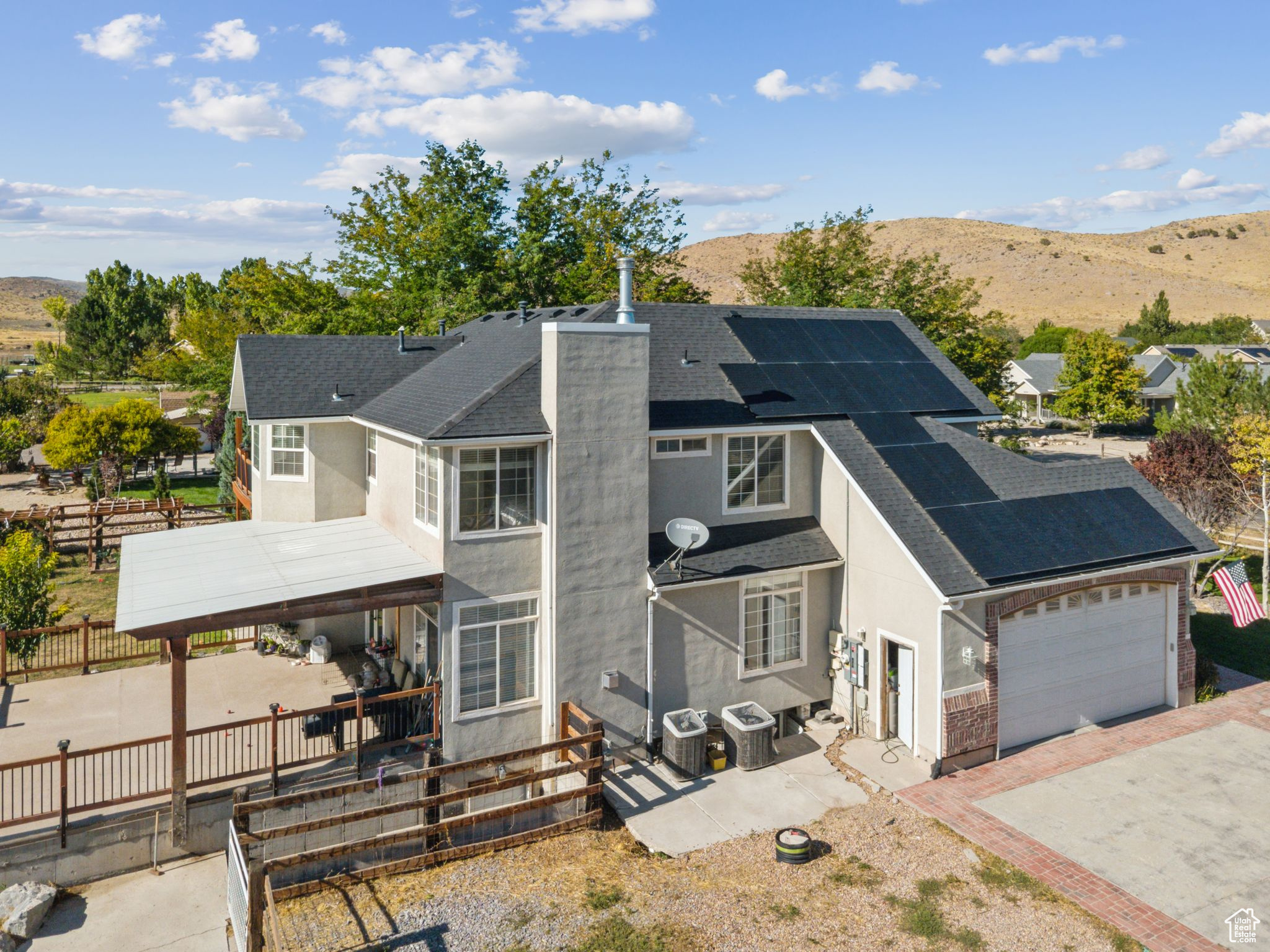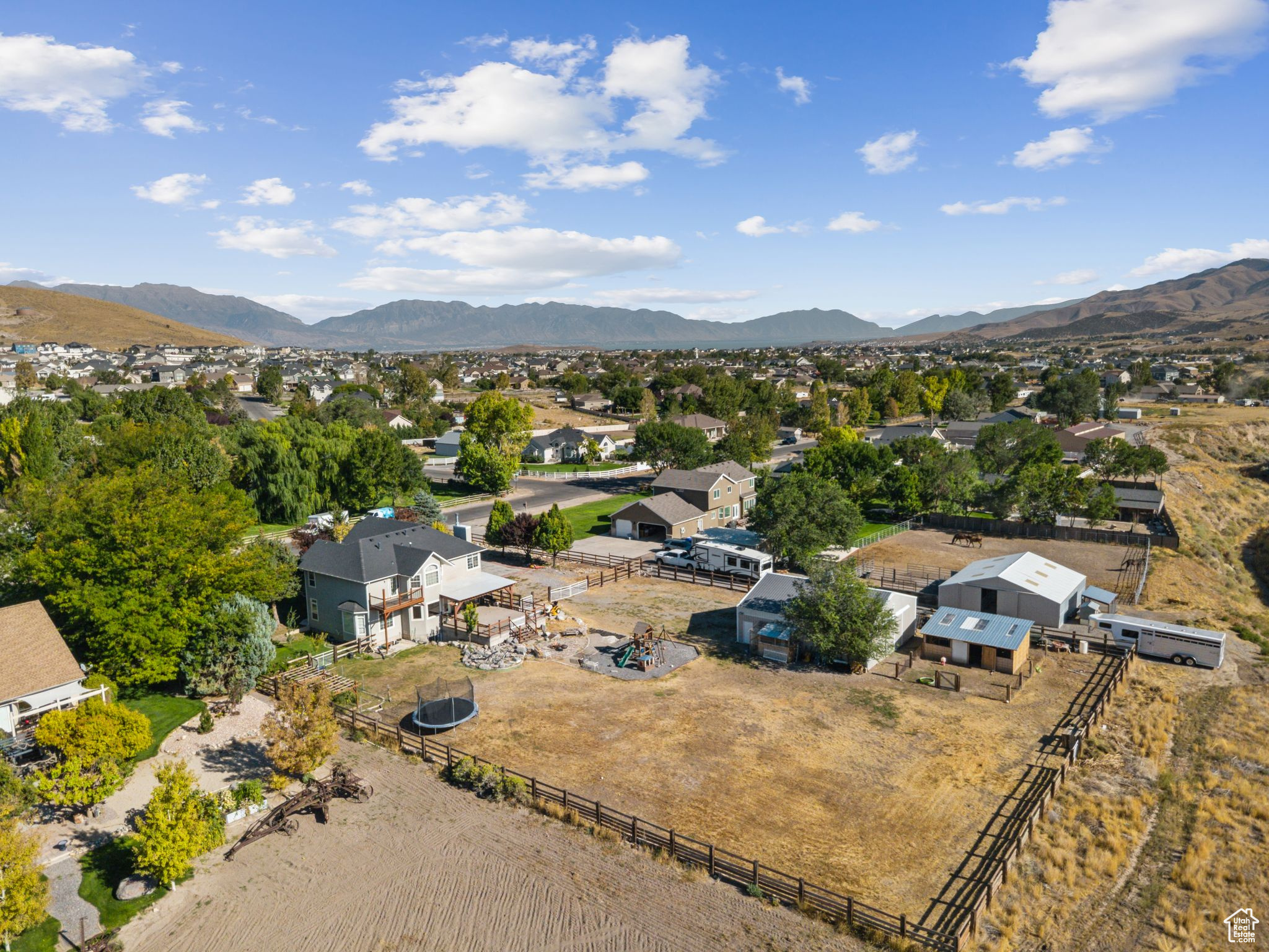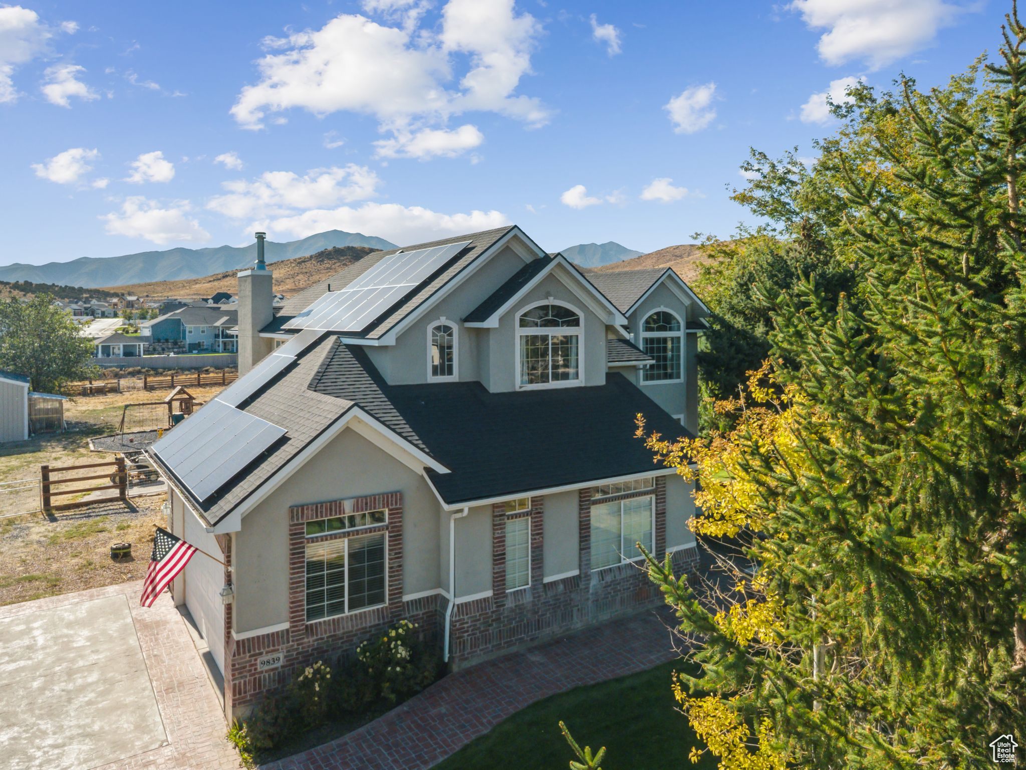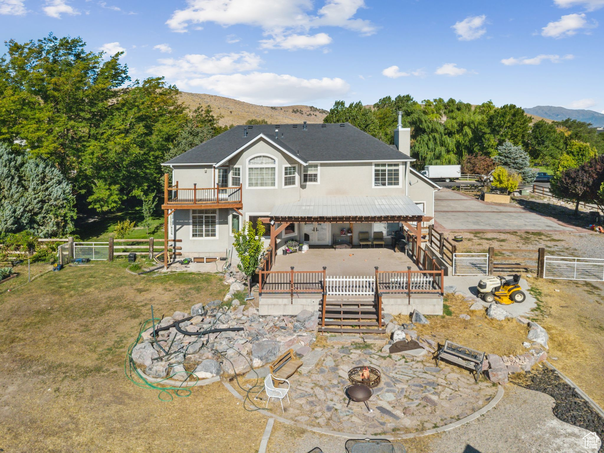 Spacious 2-story on a full acre with open great room, kitchen, dining, formal dining, and office. Upstairs features oversized bedrooms and a large primary suite with private deck, jetted tub, and shower. Finished basement offers a game/family room, 540 sq. ft. theater, kids' play area, walk-in safe with vault door, and outside entrance. Enjoy a 500+ sq. ft. patio, extra large 36'x40' powered barn/shop, corral areas for animals, and ample parking for RVs and toys. Quiet country living with room to spread out. Solar panels are included with the home and will be paid off by the seller at closing.