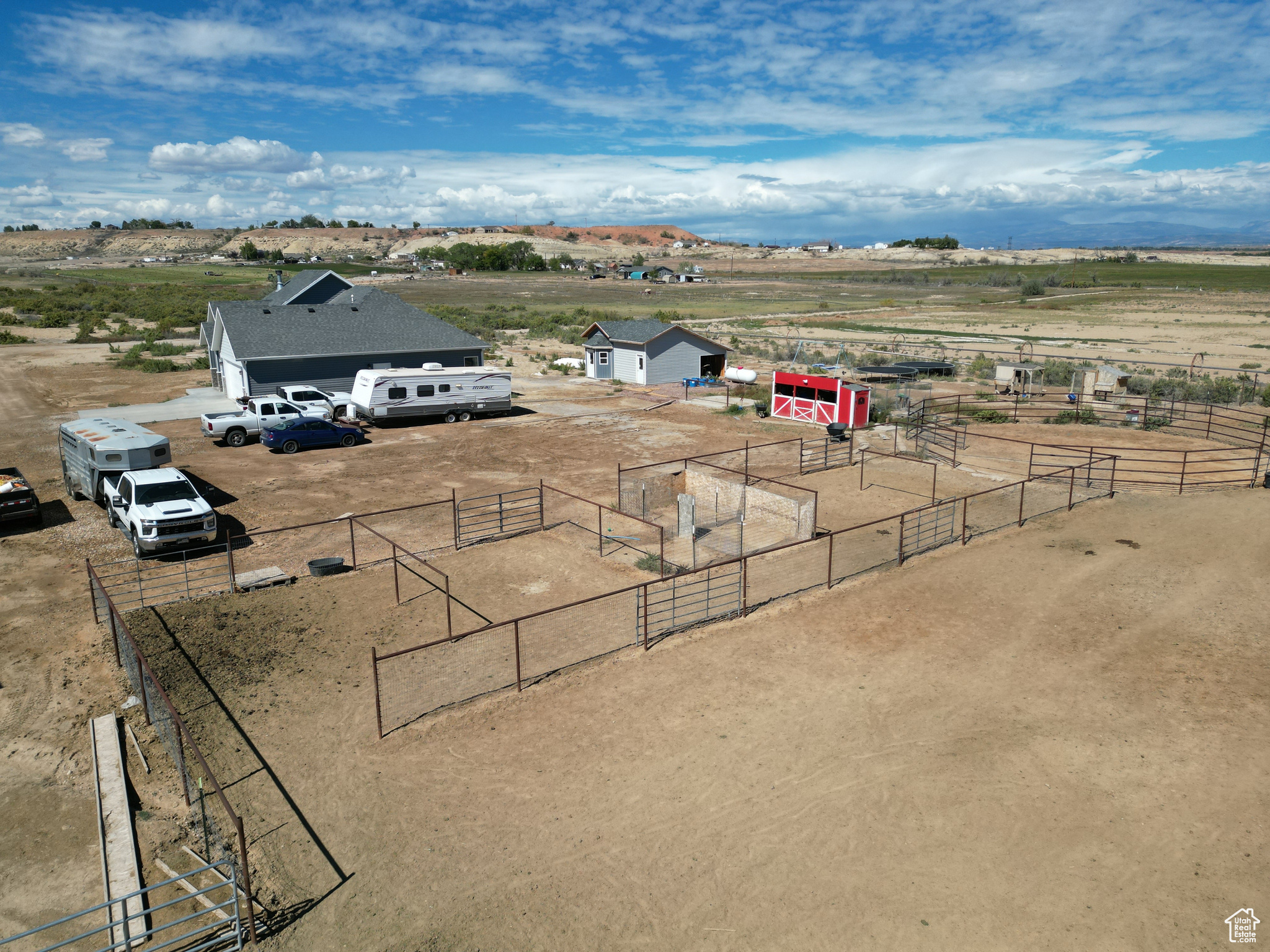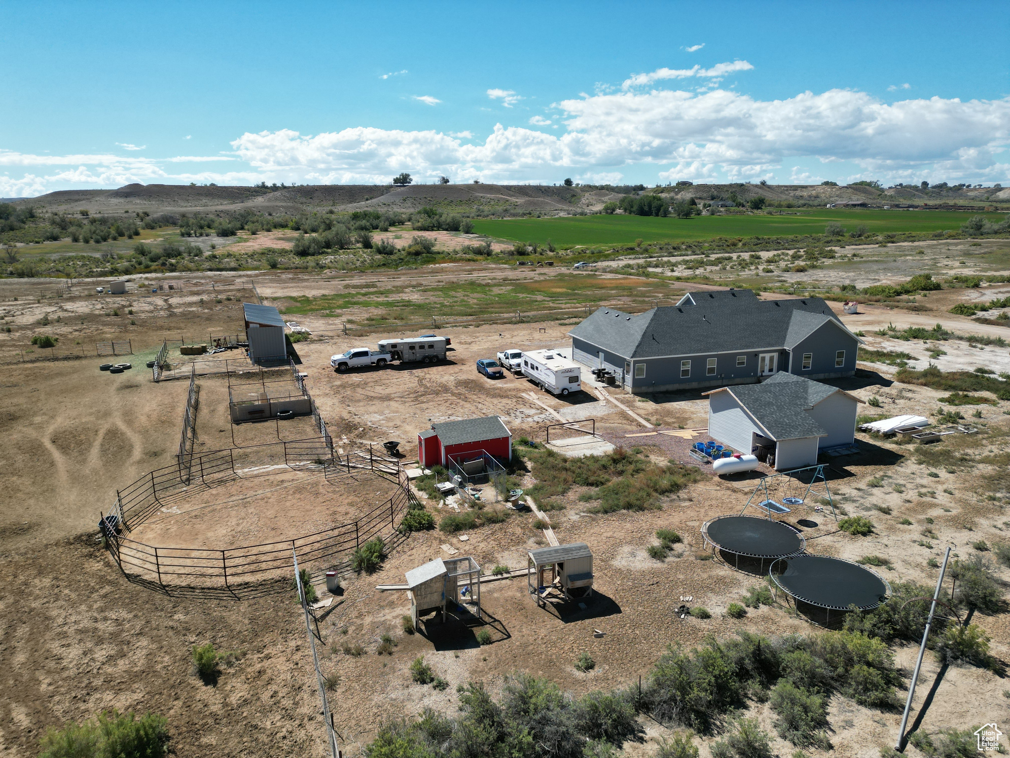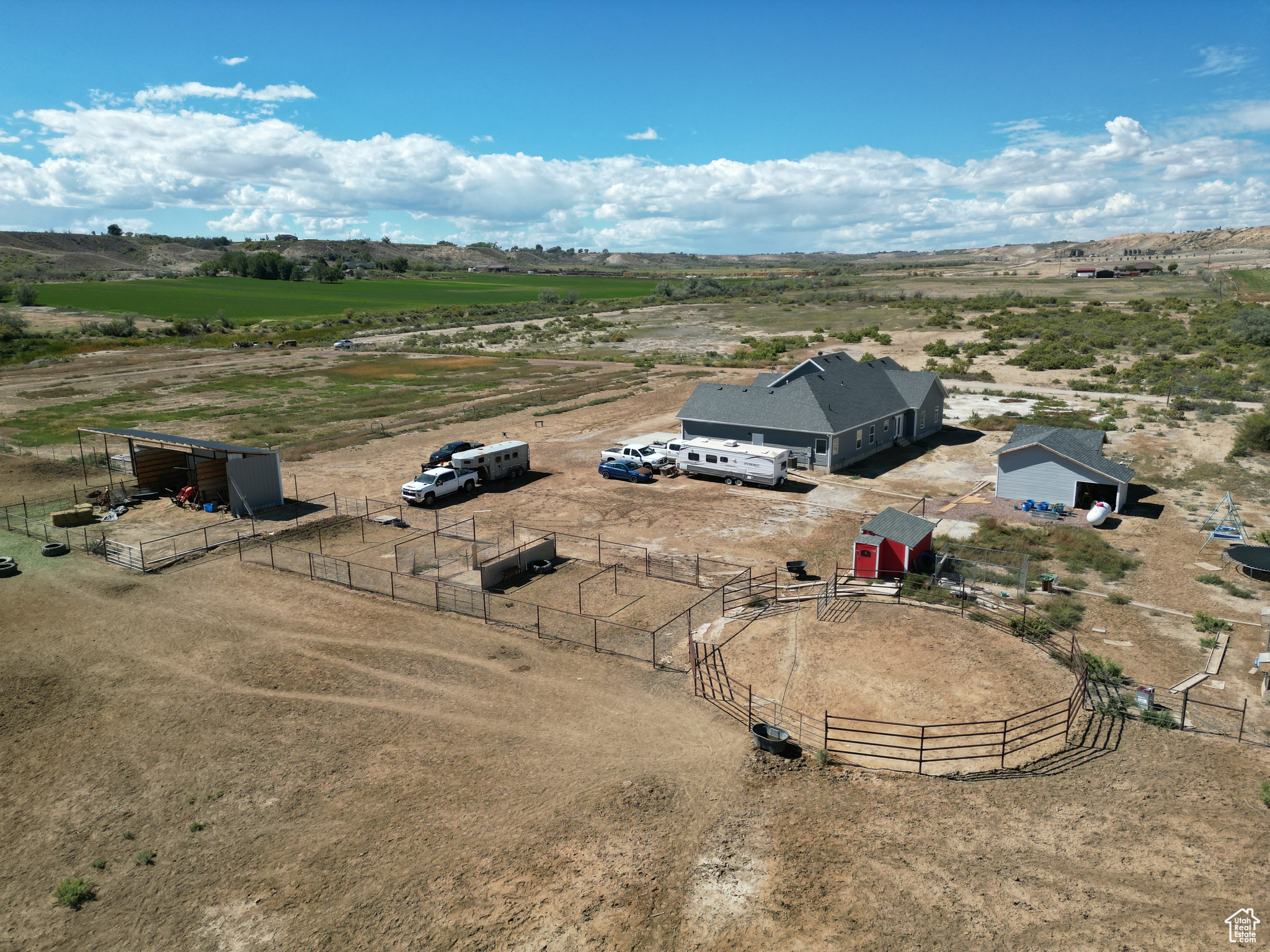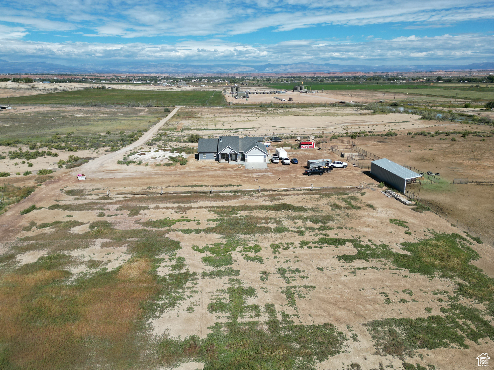 HORSE PROPERTY! This immaculate 2,000 SF home, built in 2022, sits on 9.61 acres and includes 4 Class C Dry Gulch water shares. The land is well set up with wheel lines and risers for irrigation, making it ideal for farming or livestock. On the southeast portion of the property, you'll find the beginning of an arena ready for riding, training, or other equestrian activities. Inside, you'll enjoy one-level living with 5 bedrooms, 2 baths, and an open-concept layout that brings the family, kitchen, and dining areas together seamlessly. The home features beautiful wood-style flooring, a spacious dining area, a gorgeous wood fireplace & mantle and a custom farm-style kitchen with quartz countertops and cabinetry designed for both style and function-perfect for entertaining. The property also offers a large 2-car garage, plus outdoor amenities for both living and farming. Out back, enjoy a storage shed and chicken coop, while to the east you'll find corrals and a covered awning ideal for protecting farm equipment or storing hay. Square footage figures are provided as a courtesy estimate only and were obtained from county records. Buyer is advised to obtain an independent measurement.