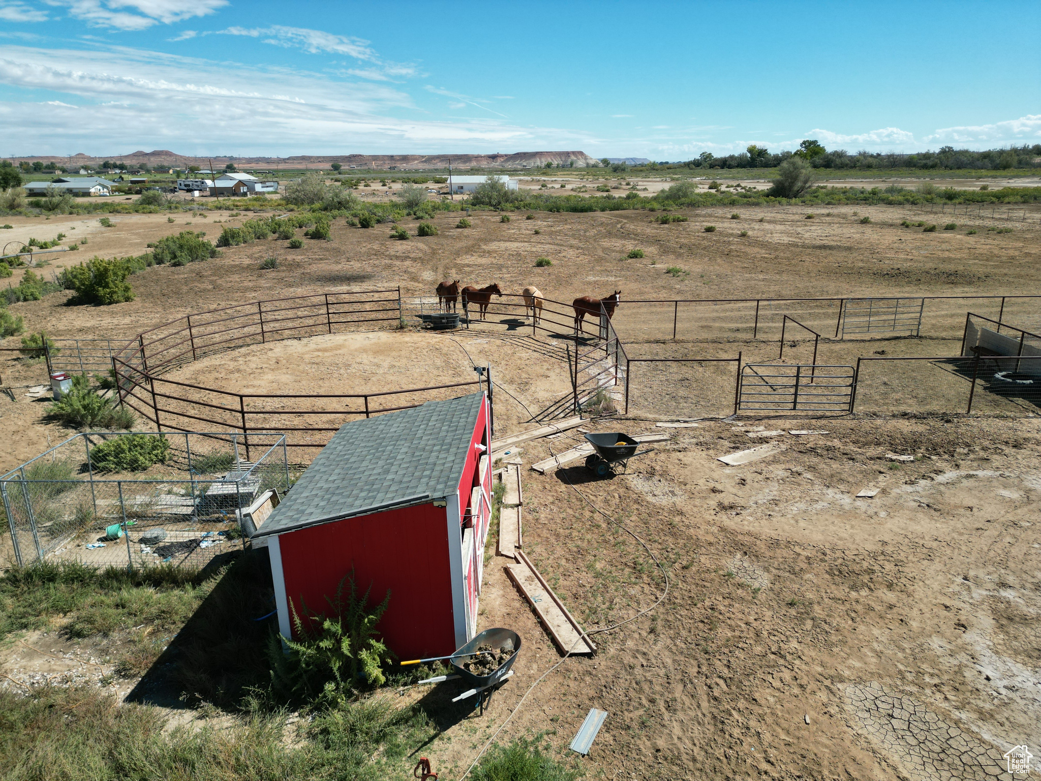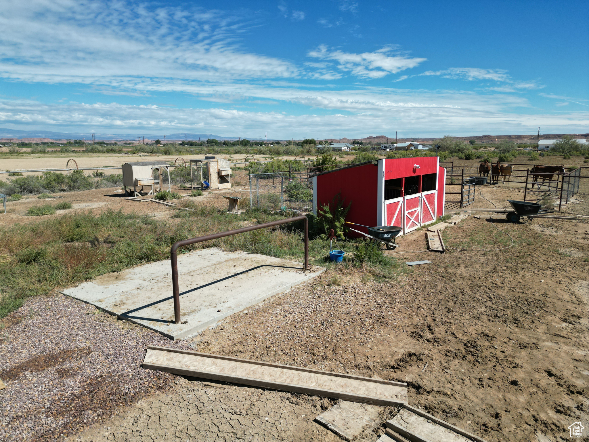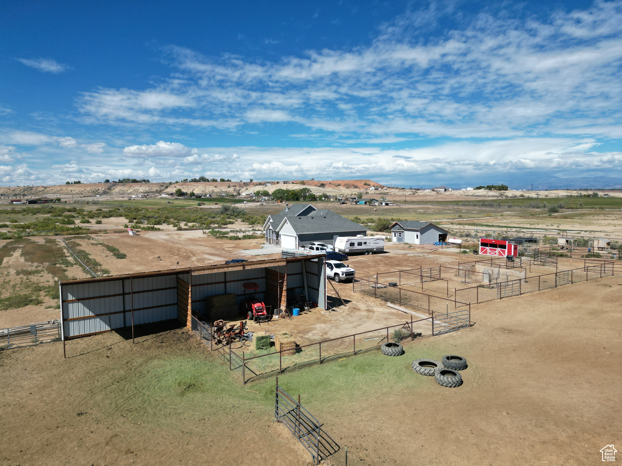 HORSE PROPERTY! This immaculate 2,000 SF home, built in 2022, sits on 9.61 acres and includes 4 Class C Dry Gulch water shares. The land is well set up with wheel lines and risers for irrigation, making it ideal for farming or livestock. On the southeast portion of the property, you'll find the beginning of an arena ready for riding, training, or other equestrian activities. Inside, you'll enjoy one-level living with 5 bedrooms, 2 baths, and an open-concept layout that brings the family, kitchen, and dining areas together seamlessly. The home features beautiful wood-style flooring, a spacious dining area, a gorgeous wood fireplace & mantle and a custom farm-style kitchen with quartz countertops and cabinetry designed for both style and function-perfect for entertaining. The property also offers a large 2-car garage, plus outdoor amenities for both living and farming. Out back, enjoy a storage shed and chicken coop, while to the east you'll find corrals and a covered awning ideal for protecting farm equipment or storing hay. Square footage figures are provided as a courtesy estimate only and were obtained from county records. Buyer is advised to obtain an independent measurement.