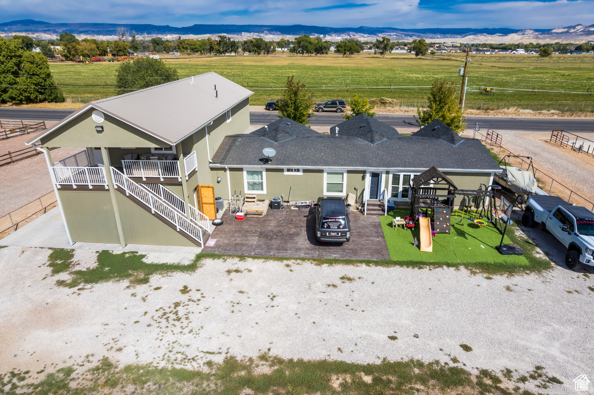 Main home was updated and addition built with garage in 2022. Unique and versatile property in Vernal with two separate living spaces. The upgraded main home offers 1,522 sq ft with 3 bedrooms and 2 bathrooms. Features include an upgraded kitchen with granite countertops, stainless steel appliances, custom wood doors and trim, and upgraded bathrooms with custom tile. Attached is a 6-car heated garage with extra height, finished custom concrete floors, and a half bath. Above the garage is a second unit with 1,122 sq ft, 3 bedrooms and 2 bathrooms. This unit includes a custom kitchen with granite countertops, gas cooktop, custom tile in the bathrooms, wood doors and trim, and upgraded foam insulation. Enjoy outdoor living with a covered balcony and patios. The property sits on .60 acres with storage sheds, custom concrete driveway, and beautiful views of the Ashley Mountains. Ideal for short-term or long-term rental income, live in one unit and rent the other, or use as an Airbnb for two income opportunities. A unique property with endless possibilities. Furnishings Negotiable, Buyer & Buyers agent to verify all information. Square footage taken from county records.